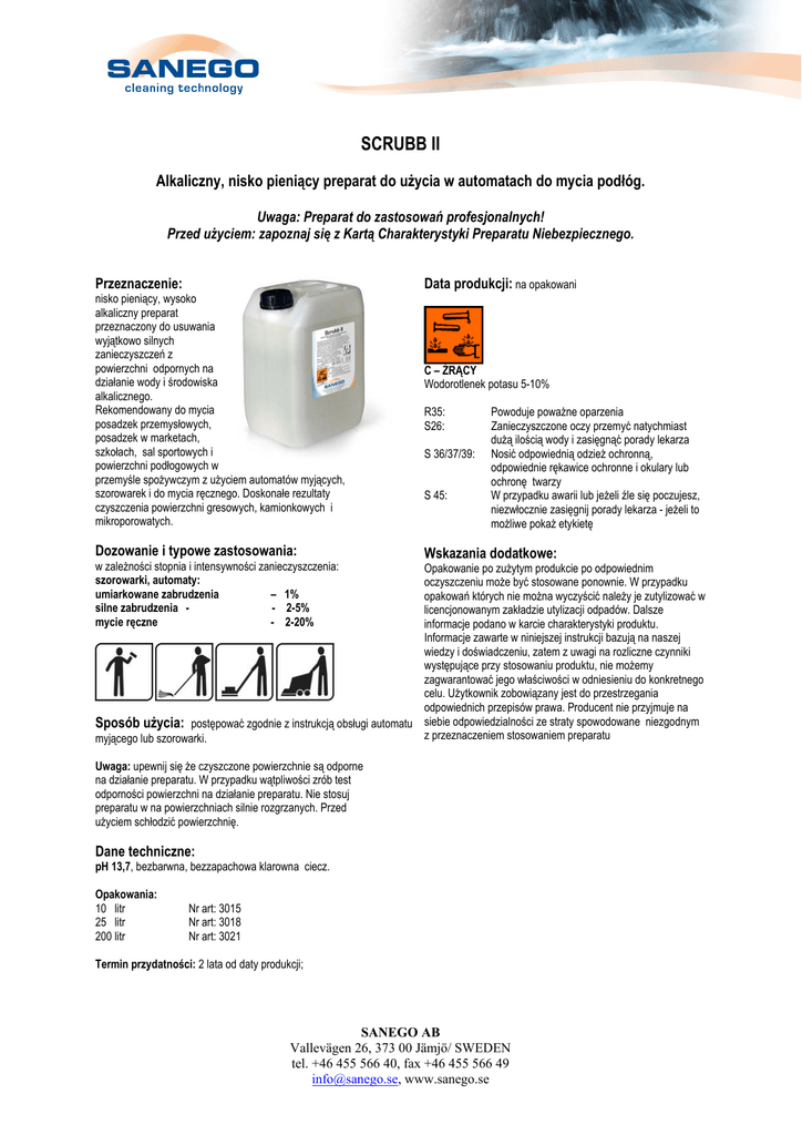 SCRUBB II Alkaliczny, nisko pieniący preparat do użycia w automatach do mycia podłóg. Uwaga: Preparat do zastosowań profesjonalnych! Przed użyciem: zapoznaj się z Kartą Charakterystyki Preparatu Niebezpiecznego. Przeznaczenie: nisko pieniący, wysoko alkaliczny preparat przeznaczony do usuwania wyjątkowo silnych zanieczyszczeń z powierzchni odpornych na działanie wody i środowiska alkalicznego. Rekomendowany do mycia posadzek przemysłowych, posadzek w marketach, szkołach, sal sportowych i powierzchni podłogowych w przemyśle spożywczym z użyciem automatów myjących, szorowarek i do mycia ręcznego. Doskonałe rezultaty czyszczenia powierzchni gresowych, kamionkowych i mikroporowatych. Dozowanie i typowe zastosowania: w zależności stopnia i intensywności zanieczyszczenia: szorowarki, automaty: umiarkowane zabrudzenia – 1% silne zabrudzenia - 2-5% mycie ręczne - 2-20% Data produkcji: na opakowani C – ŻRĄCY Wodorotlenek potasu 5-10% R35: S26: S 36/37/39: S 45: Powoduje poważne oparzenia Zanieczyszczone oczy przemyć natychmiast dużą ilością wody i zasięgnąć porady lekarza Nosić odpowiednią odzież ochronną, odpowiednie rękawice ochronne i okulary lub ochronę twarzy W przypadku awarii lub jeżeli źle się poczujesz, niezwłocznie zasięgnij porady lekarza - jeżeli to możliwe pokaż etykietę Wskazania dodatkowe: Opakowanie po zużytym produkcie po odpowiednim oczyszczeniu może być stosowane ponownie. W przypadku opakowań których nie można wyczyścić należy je zutylizować w licencjonowanym zakładzie utylizacji odpadów. Dalsze informacje podano w karcie charakterystyki produktu. Informacje zawarte w niniejszej instrukcji bazują na naszej wiedzy i doświadczeniu, zatem z uwagi na rozliczne czynniki występujące przy stosowaniu produktu, nie możemy zagwarantować jego właściwości w odniesieniu do konkretnego celu. Użytkownik zobowiązany jest do przestrzegania odpowiednich przepisów prawa. Producent nie przyjmuje na Sposób użycia: postępować zgodnie z instrukcją obsługi automatu siebie odpowiedzialności ze straty spowodowane niezgodnym z przeznaczeniem stosowaniem preparatu myjącego lub szorowarki. Uwaga: upewnij się że czyszczone powierzchnie są odporne na działanie preparatu. W przypadku wątpliwości zrób test odporności powierzchni na działanie preparatu. Nie stosuj preparatu w na powierzchniach silnie rozgrzanych. Przed użyciem schłodzić powierzchnię. Dane techniczne: pH 13,7, bezbarwna, bezzapachowa klarowna ciecz. Opakowania: 10 litr 25 litr 200 litr Nr art: 3015 Nr art: 3018 Nr art: 3021 Termin przydatności: 2 lata od daty produkcji; SANEGO AB Vallevägen 26, 373 00 Jämjö/ SWEDEN tel. +46 455 566 40, fax +46 455 566 49 [email protected], www.sanego.se