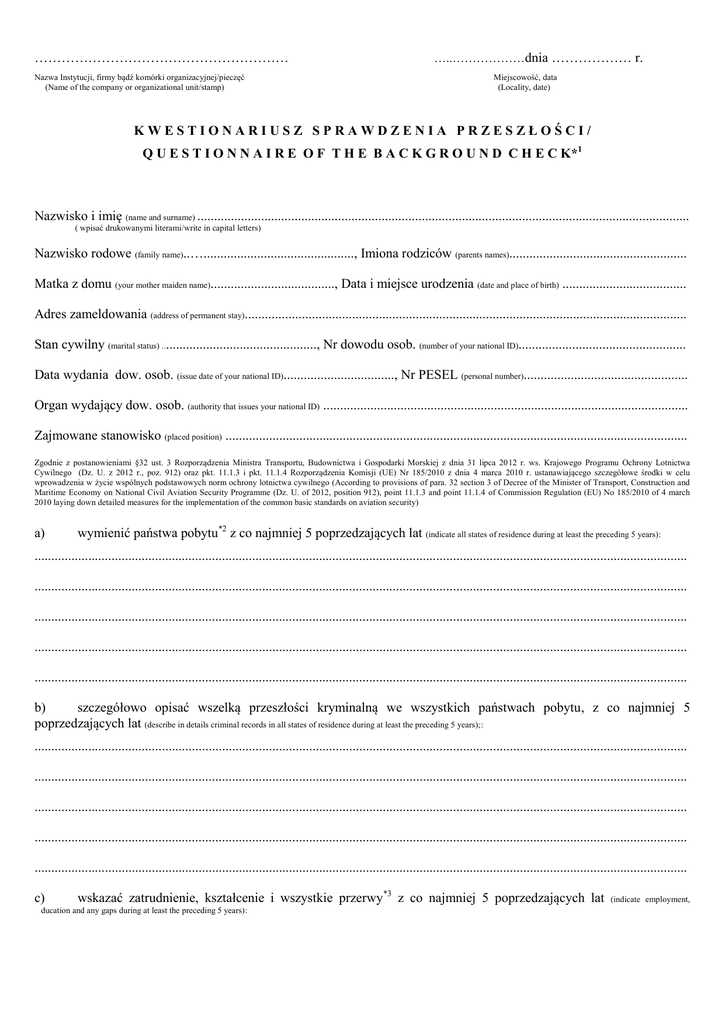 ………………………………………………… Nazwa Instytucji, firmy bądź komórki organizacyjnej/pieczęć (Name of the company or organizational unit/stamp) …..………………dnia ……………… r. Miejscowość, data (Locality, date) KWESTIONARIUSZ SPRAWDZENIA PRZESZŁOŚCI/ Q U E S T I O N N A I R E O F T H E B A C K G R O U N D C H E C K*1 Nazwisko i imię (name and surname) ................................................................................................................................................... ( wpisać drukowanymi literami/write in capital letters) Nazwisko rodowe (family name)..…............................................., Imiona rodziców (parents names)..................................................... Matka z domu (your mother maiden name)....................................., Data i miejsce urodzenia (date and place of birth) ..................................... Adres zameldowania (address of permanent stay).................................................................................................................................... Stan cywilny (marital status) ..............................................., Nr dowodu osob. (number of your national ID).................................................. Data wydania dow. osob. (issue date of your national ID)................................., Nr PESEL (personal number)................................................. Organ wydający dow. osob. (authority that issues your national ID) ............................................................................................................. Zajmowane stanowisko (placed position) .......................................................................................................................................... Zgodnie z postanowieniami §32 ust. 3 Rozporządzenia Ministra Transportu, Budownictwa i Gospodarki Morskiej z dnia 31 lipca 2012 r. ws. Krajowego Programu Ochrony Lotnictwa Cywilnego (Dz. U. z 2012 r., poz. 912) oraz pkt. 11.1.3 i pkt. 11.1.4 Rozporządzenia Komisji (UE) Nr 185/2010 z dnia 4 marca 2010 r. ustanawiającego szczegółowe środki w celu wprowadzenia w życie wspólnych podstawowych norm ochrony lotnictwa cywilnego (According to provisions of para. 32 section 3 of Decree of the Minister of Transport, Construction and Maritime Economy on National Civil Aviation Security Programme (Dz. U. of 2012, position 912), point 11.1.3 and point 11.1.4 of Commission Regulation (EU) No 185/2010 of 4 march 2010 laying down detailed measures for the implementation of the common basic standards on aviation security) a) wymienić państwa pobytu*2 z co najmniej 5 poprzedzających lat (indicate all states of residence during at least the preceding 5 years): ................................................................................................................................................................................................... ................................................................................................................................................................................................... ................................................................................................................................................................................................... ................................................................................................................................................................................................... ................................................................................................................................................................................................... b) szczegółowo opisać wszelką przeszłości kryminalną we wszystkich państwach pobytu, z co najmniej 5 poprzedzających lat (describe in details criminal records in all states of residence during at least the preceding 5 years);: ................................................................................................................................................................................................... ................................................................................................................................................................................................... ................................................................................................................................................................................................... ................................................................................................................................................................................................... ................................................................................................................................................................................................... c) wskazać zatrudnienie, kształcenie i wszystkie przerwy*3 z co najmniej 5 poprzedzających lat ducation and any gaps during at least the preceding 5 years): (indicate employment, Historia zatrudnienia w okresie, co najmniej 5 poprzedzających lat (należy wypełnić chronologicznie od pierwszego do ostatniego zatrudnienia w okresie, co najmniej 5 ostatnich lat, np.: od 01.01.2008 r. do 31.12.2013 r. włącznie, podając dokładne daty; należy uwzględnić i rozpisać przerwy przekraczające 28 dni) (Employment summary in the period of minimum previous 5 years) (to be filled in chronologically from the first to the last employment in the period of minimum previous 5 years, eg. From 2008 to 2013inclusive giving exact dates; interruptions exceeding 28 days should be indicated and described) Lp. 1. 2. 3. 4. 5. 6. 7. 8. Kraj zatrudnienia Pełna nazwa I adres pracodawcy (Country of employment) (Employer’s full name and address) Okres zatrudnienia i rodzaj umowy – załączyć kopie świadectwa pracy 