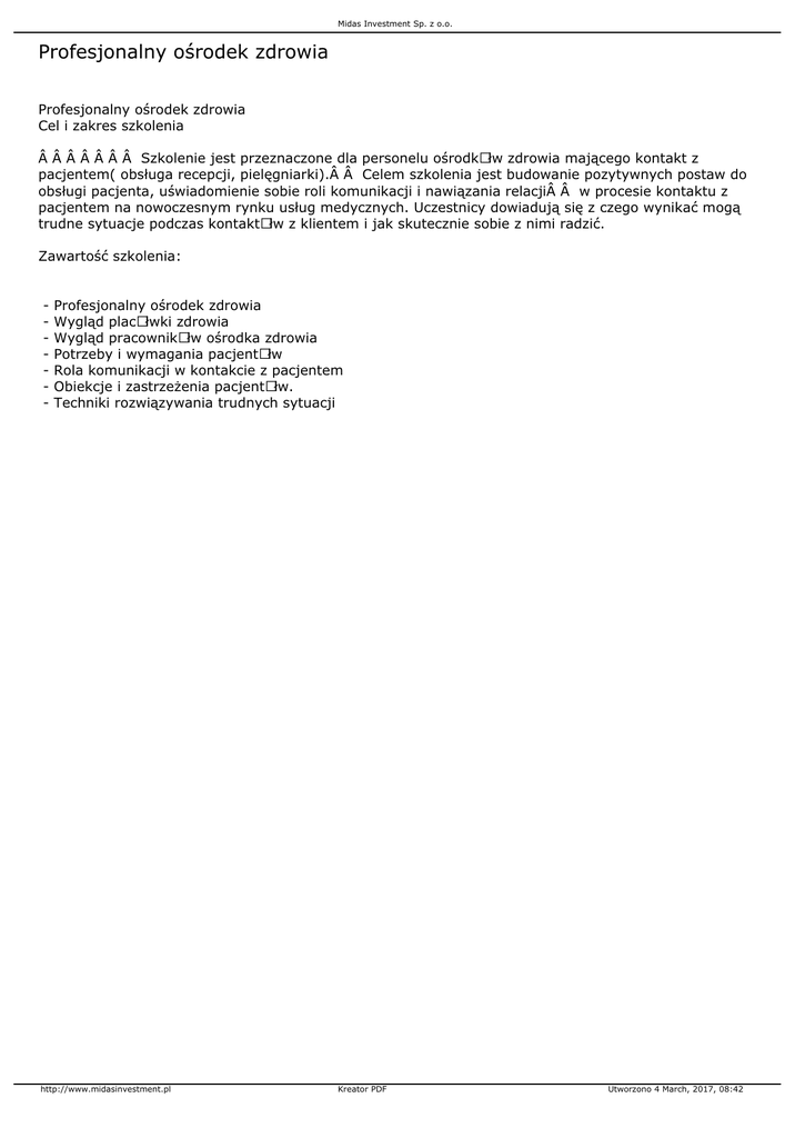 Midas Investment Sp. z o.o. Profesjonalny ośrodek zdrowia Profesjonalny ośrodek zdrowia Cel i zakres szkolenia        Szkolenie jest przeznaczone dla personelu ośrodkÃłw zdrowia mającego kontakt z pacjentem( obsługa recepcji, pielęgniarki).  Celem szkolenia jest budowanie pozytywnych postaw do obsługi pacjenta, uświadomienie sobie roli komunikacji i nawiązania relacji  w procesie kontaktu z pacjentem na nowoczesnym rynku usług medycznych. Uczestnicy dowiadują się z czego wynikać mogą trudne sytuacje podczas kontaktÃłw z klientem i jak skutecznie sobie z nimi radzić. Zawartość szkolenia: - Profesjonalny ośrodek zdrowia Wygląd placÃłwki zdrowia Wygląd pracownikÃłw ośrodka zdrowia Potrzeby i wymagania pacjentÃłw Rola komunikacji w kontakcie z pacjentem Obiekcje i zastrzeżenia pacjentÃłw. Techniki rozwiązywania trudnych sytuacji http://www.midasinvestment.pl Kreator PDF Utworzono 4 March, 2017, 08:42