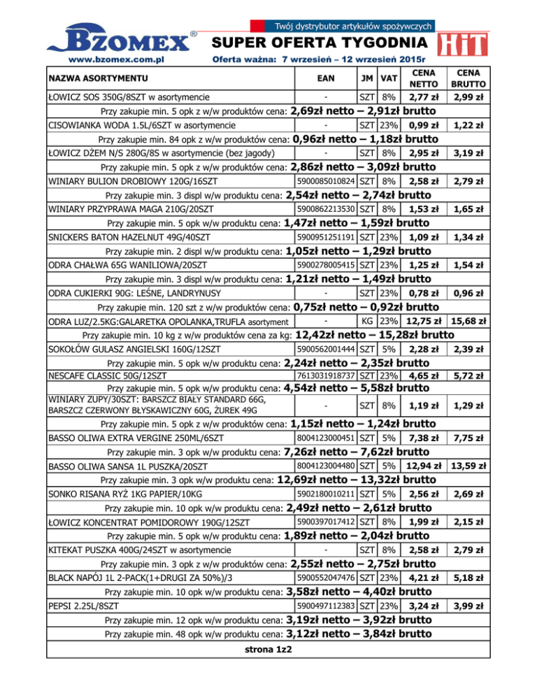 SUPER OFERTA TYGODNIA www.bzomex.com.pl Oferta ważna: 7 wrzesień – 12 wrzesień 2015r NAZWA ASORTYMENTU ŁOWICZ SOS 350G/8SZT w asortymencie EAN JM VAT CENA NETTO CENA BRUTTO - SZT 8% 2,77 zł 2,99 zł Przy zakupie min. 5 opk z w/w produktów cena: 2,69zł netto – 2,91zł brutto CISOWIANKA WODA 1.5L/6SZT w asortymencie - SZT 23% 0,99 zł 1,22 zł Przy zakupie min. 84 opk z w/w produktów cena: 0,96zł netto – 1,18zł brutto ŁOWICZ DŻEM N/S 280G/8S w asortymencie (bez jagody) - SZT 8% 2,95 zł 3,19 zł Przy zakupie min. 5 opk z w/w produktów cena: 2,86zł netto – 3,09zł brutto WINIARY BULION DROBIOWY 120G/16SZT 5900085010824 SZT 8% 2,58 zł 2,79 zł Przy zakupie min. 3 displ w/w produktu cena: 2,54zł netto – 2,74zł brutto WINIARY PRZYPRAWA MAGA 210G/20SZT 5900862213530 SZT 8% 1,53 zł 1,65 zł Przy zakupie min. 5 opk w/w produktu cena: 1,47zł netto – 1,59zł brutto SNICKERS BATON HAZELNUT 49G/40SZT 5900951251191 SZT 23% 1,09 zł 1,34 zł Przy zakupie min. 2 displ w/w produktu cena: 1,05zł netto – 1,29zł brutto ODRA CHAŁWA 65G WANILIOWA/20SZT 5900278005415 SZT 23% 1,25 zł 1,54 zł Przy zakupie min. 3 displ w/w produktu cena: 1,21zł netto – 1,49zł brutto ODRA CUKIERKI 90G: LEŚNE, LANDRYNUSY - SZT 23% 0,78 zł 0,96 zł Przy zakupie min. 120 szt z w/w produktów cena: 0,75zł netto – 0,92zł brutto ODRA LUZ/2.5KG:GALARETKA OPOLANKA,TRUFLA asortyment - KG 23% 12,75 zł 15,68 zł Przy zakupie min. 10 kg z w/w produktów cena za kg: 12,42zł netto – 15,28zł brutto SOKOŁÓW GULASZ ANGIELSKI 160G/12SZT 5900562001444 SZT 5% 2,28 zł Przy zakupie min. 5 opk w/w produktu cena: 2,24zł netto – 2,35zł brutto 7613031918737 SZT 23% 4,65 zł NESCAFE CLASSIC 50G/12SZT Przy zakupie min. 5 opk w/w produktu cena: 4,54zł netto – 5,58zł brutto WINIARY ZUPY/30SZT: BARSZCZ BIAŁY STANDARD 66G, SZT 8% 1,19 zł BARSZCZ CZERWONY BŁYSKAWICZNY 60G, ŻUREK 49G 2,39 zł 5,72 zł 1,29 zł Przy zakupie min. 5 opk z w/w produktów cena: 1,15zł netto – 1,24zł brutto BASSO OLIWA EXTRA VERGINE 250ML/6SZT 8004123000451 SZT 5% 7,38 zł 7,75 zł Przy zakupie min. 3 opk w/w produktu cena: 7,26zł netto – 7,62zł brutto 8004123004480 SZT 5% BASSO OLIWA SANSA 1L PUSZKA/20SZT 12,94 zł 13,59 zł Przy zakupie min. 3 opk w/w produktu cena: 12,69zł netto – 13,32zł brutto SONKO RISANA RYŻ 1KG PAPIER/10KG 5902180010211 SZT 5% 2,56 zł 2,69 zł Przy zakupie min. 10 opk w/w produktu cena: 2,49zł netto – 2,61zł brutto ŁOWICZ KONCENTRAT POMIDOROWY 190G/12SZT 5900397017412 SZT 8% 1,99 zł 2,15 zł Przy zakupie min. 5 opk w/w produktu cena: 1,89zł netto – 2,04zł brutto KITEKAT PUSZKA 400G/24SZT w asortymencie - SZT 8% 2,58 zł 2,79 zł Przy zakupie min. 3 opk z w/w produktów cena: 2,55zł netto – 2,75zł brutto BLACK NAPÓJ 1L 2-PACK(1+DRUGI ZA 50%)/3 5900552047476 SZT 23% 4,21 zł 5,18 zł Przy zakupie min. 10 opk w/w produktu cena: 3,58zł netto – 4,40zł brutto PEPSI 2.25L/8SZT 5900497112383 SZT 23% 3,24 zł Przy zakupie min. 12 opk w/w produktu cena: 3,19zł netto – 3,92zł brutto Przy zakupie min. 48 opk w/w produktu cena: 3,12zł netto – 3,84zł brutto strona 1z2 3,99 zł PACIFIC PŁATKI FITNESS 225G/16SZT w asortymencie - SZT 5% 4,05 zł 4,25 zł Przy zakupie min. 3 opk z w/w produktów cena: 3,95zł netto – 4,15zł brutto PACIFIC BATON FITNESS/16SZT w asortymencie (bez Delice) - SZT 5% 0,97 zł 1,02 zł Przy zakupie min. 3 displ z w/w produktów cena: 0,94zł netto – 0,99zł brutto VITAX HERBATA INSPIRATIONS 20T/12S w asortymencie - SZT 23% 3,21 zł 3,95 zł Przy zakupie min. 5 opk z w/w produktów cena: 3,16zł netto – 3,89zł brutto RAJDIMPEX BURAKI TARTE 900G/8SZT 5901642111183 SZT 8% 2,98 zł 3,22 zł Przy zakupie min. 5 opk w/w produktu cena: 2,94zł netto – 3,18zł brutto JUTRZENKA DRAŻE MLECZNE 80G/20SZT 5900352000909 SZT 23% 1,35 zł 1,66 zł Przy zakupie min. 3 opk w/w produktu cena: 1,32zł netto – 1,62zł brutto AKUKU ŻELKI 90G/20SZT w asortymencie - SZT 23% 1,70 zł 2,09 zł Przy zakupie min. 5 opk z w/w produktów cena: 1,67zł netto – 2,05zł brutto TERRAVITA CZEKOLADA 225G/9SZT: BAKALIOWA, MLECZNA - SZT 23% 3,76 zł 4,62 zł Przy zakupie min. 3 opk z w/w produktów cena: 3,69zł netto – 4,54zł brutto FORT MIELONA 100G/30SZT 5900788401158 SZT 23% 1,67 zł 2,05 zł Przy zakupie min. 3 opk w/w produktu cena: 1,64zł netto – 2,02zł brutto DROP OSTRZESZÓW PASZTET 160G+25% GRATIS/20SZT 5900384169278 SZT 5% 1,42 zł 1,49 zł Przy zakupie min. 5 opk w/w produktu cena: 1,38zł netto – 1,45zł brutto DROP OSTRZESZÓW PASZTET 90G/20SZT 5900384161197 SZT 5% 1,07 zł 1,12 zł Przy zakupie min. 3 opk w/w produktu cena: 1,04zł netto – 1,09zł brutto ERA RYB FILET ŚLEDZIOWY W POMIDORACH 170G/15SZT 5903137887399 SZT 5% 2,44 zł 2,56 zł Przy zakupie min. 3 opk w/w produktu cena: 2,39zł netto – 2,51zł brutto ERA RYB FILET ŚLEDZIOWY W OLEJU 170G/15SZT 5903137887375 SZT 5% 2,54 zł 2,67 zł Przy zakupie min. 3 opk w/w produktu cena: 2,49zł netto – 2,61zł brutto LEON KUCHARZ MAKARON 250G KRAJANKA/40SZT 5904072000546 SZT 5% 1,04 zł 1,09 zł Przy zakupie min. 40 opk w/w produktu cena: 0,99zł netto – 1,04zł brutto DAWTONA SOK 330ML/12SZT w asortymencie - SZT 5% 0,91 zł 0,96 zł Przy zakupie min. 3 opk z w/w produktów cena: 0,89zł netto – 0,93zł brutto ZŁOTY BAŻANT 400G KONCENTRAT POMIDOROWY/10SZT 5998304548135 SZT 8% 3,75 zł 4,05 zł Przy zakupie min. 3 opk w/w produktu cena: 3,65zł netto – 3,94zł brutto PAMAPOL PASZTET (295G+66%) 490G/4S w asortymencie - SZT 5% 2,49 zł 2,61 zł Przy zakupie min. 5 opk z w/w produktów cena: 2,44zł netto – 2,56zł brutto WERBLIŃSKI SZYNKA POLSKA 110G TRÓJKĄT/12SZT 5907670901260 SZT 5% 1,23 zł 1,29 zł Przy zakupie min. 5 opk w/w produktu cena: 1,19zł netto – 1,25zł brutto WERBLIŃSKI SZYNKA POLSKA 120G OWALNA/12SZT 5907670901390 SZT 5% 1,35 zł 1,42 zł Przy zakupie min. 5 opk w/w produktu cena: 1,29zł netto – 1,35zł brutto KUCHAREK 1KG/15SZT 5901135000017 SZT 8% 7,98 