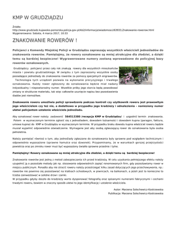 KMP W GRUDZIĄDZU Źródło: http://www.grudziadz.kujawsko-pomorska.policja.gov.pl/kb2/informacje/wiadomosci/63933,Znakowanie-rowerow.html Wygenerowano: Sobota, 4 marca 2017, 10:33 ZNAKOWANIE ROWERÓW ! Policjanci z Komendy Miejskiej Policji w Grudziądzu zapraszają wszystkich właścicieli jednośladów do znakowania rowerów. Pamiętajmy, że rowery oznakowane są mniej atrakcyjne dla złodziei, a dzięki temu są bardziej bezpieczne! Wygrawerowane numery zostaną wprowadzone do policyjnej bazy rowerów oznakowanych. Grudziądzcy policjanci przez cały rok znakują rowery dla wszystkich mieszkańców miasta i powiatu grudziadzkiego. W związku z tym zapraszamy wszystkie osoby posiadające jednoślady do znakowania rowerów za pomocą specjalnych engrawerów. Technologia tych urządzeń pozwala na wykonanie precyzyjnego i trwałego oznakowania. Każdy rower zgłoszony do oznakowania będzie miał nadany indywidualny i niepowtarzalny numer. Wszelkie próby jego starcia będą powodować zmiany w strukturze materiału, tak więc całkowite usunięcie napisu bez pozostawienia śladów jest niemożliwe. Znakowanie roweru umożliwia policji sprawdzenie podczas kontroli czy użytkownik roweru jest prawowitym jego właścicielem czy też nie, a dodatkowo w przypadku jego kradzieży i odnalezienia – naniesiony numer ułatwi policjantom ustalenie właściciela jednośladu. Aby oznakować rower należy zadzwonić 564513380 /recepcja KMP w Grudziądzu/ i uzgodnić termin znakowania. Potem w wyznaczonym terminie zgłosić się z jednośladem, dowodem tożsamości i dowodem kupna (paragon, faktura, umowa kupna) do KMP w Grudziądzu w wyznaczonym terminie. W przypadku braku dowodu kupna właściciel roweru będzie musiał wypełnić odpowiednie oświadczenie. Wymagane jest aby osobą zgłaszającą rower do oznakowania była osoba pełnoletnia. Należy pamiętać również o tym, aby jednoślady zgłaszane do oznakowania były sprawne pod względem technicznym i odpowiednio wyposażone (sprawne hamulce oraz dzwonek). Przypominamy, że w warunkach gorszej przejrzystości powietrza oraz po zmroku rower musi być wyposażony światło sprawne przednie i tylne. Pamiętajmy! Rowery oznakowane są mniej atrakcyjne dla złodziei, a dzięki temu są bardziej bezpieczne! Znakowanie rowerów jest jedną z metod zabezpieczania ich przed kradzieżą. W celu uzyskania pełniejszego efektu należy uzupełnić ją o pozostałe metody jak np. stosowanie odpowiednich zapięć renomowanych firm, gdy pozostawiamy rower w miejscu publicznym. Ponadto aby nie stracić roweru należy przestrzegać kilku zasad dotyczących jego przechowywania, np.: rowerów nie powinno się pozostawiać na klatkach schodowych, w piwnicach, na balkonach, a jeżeli jest to konieczne to trzeba zainwestować w solidne drzwi i zamki. W przypadku gdyby doszło do kradzieży warto dysponować fotografią oraz spisanymi numerami fabrycznymi i cechami trwałymi roweru, bowiem w znaczny sposób ułatwi to jego identyfikację i ustalenie właściciela. Autor: Marzena Solochewicz-Kostrzewska Publikacja: Marzena Solochewicz-Kostrzewska Ocena: 0/5 (1) Tweetnij