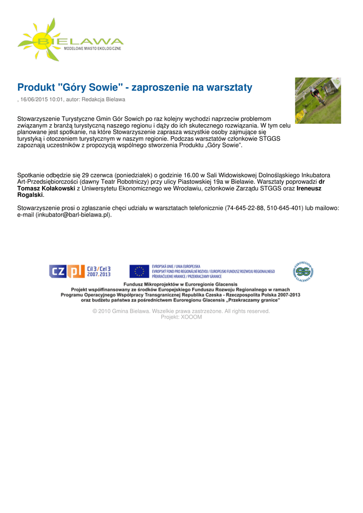 Produkt "Góry Sowie" - zaproszenie na warsztaty , 16/06/2015 10:01, autor: Redakcja Bielawa Stowarzyszenie Turystyczne Gmin Gór Sowich po raz kolejny wychodzi naprzeciw problemom związanym z branżą turystyczną naszego regionu i dąży do ich skutecznego rozwiązania. W tym celu planowane jest spotkanie, na które Stowarzyszenie zaprasza wszystkie osoby zajmujące się turystyką i otoczeniem turystycznym w naszym regionie. Podczas warsztatów członkowie STGGS zapoznają uczestników z propozycją wspólnego stworzenia Produktu „Góry Sowie”. Spotkanie odbędzie się 29 czerwca (poniedziałek) o godzinie 16.00 w Sali Widowiskowej Dolnośląskiego Inkubatora Art-Przedsiębiorczości (dawny Teatr Robotniczy) przy ulicy Piastowskiej 19a w Bielawie. Warsztaty poprowadzi dr Tomasz Kołakowski z Uniwersytetu Ekonomicznego we Wrocławiu, członkowie Zarządu STGGS oraz Ireneusz Rogalski. Stowarzyszenie prosi o zgłaszanie chęci udziału w warsztatach telefonicznie (74-645-22-88, 510-645-401) lub mailowo: e-mail ([email protected]). © 2010 Gmina Bielawa. Wszelkie prawa zastrzeżone. All rights reserved. Projekt: XOOOM