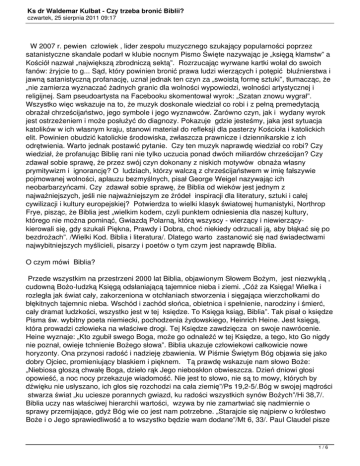 Ks dr Waldemar Kulbat - Czy trzeba bronić Biblii? czwartek, 25 sierpnia 2011 09:17 W 2007 r. pewien człowiek , lider zespołu muzycznego szukający popularności poprzez satanistyczne skandale podarł w klubie nocnym Pismo Święte nazywając je „księgą kłamstw” a Kościół nazwał „największą zbrodniczą sektą”. Rozrzucając wyrwane kartki wołał do swoich fanów: żryjcie to g... Sąd, który powinien bronić prawa ludzi wierzących i potępić bluźnierstwa i jawną satanistyczną profanację, uznał jednak ten czyn za „swoistą formę sztuki”, tłumacząc, że „nie zamierza wyznaczać żadnych granic dla wolności wypowiedzi, wolności artystycznej i religijnej. Sam pseudoartysta na Facebooku skomentował wyrok: „Szatan znowu wygrał”. Wszystko więc wskazuje na to, że muzyk doskonale wiedział co robi i z pełną premedytacją obrażał chrześcijaństwo, jego symbole i jego wyznawców. Zarówno czyn, jak i wydany wyrok jest ostrzeżeniem i może posłużyć do diagnozy. Pokazuje gdzie jesteśmy, jaka jest sytuacja katolików w ich własnym kraju, stanowi materiał do refleksji dla pasterzy Kościoła i katolickich elit. Powinien obudzić katolickie środowiska, zwłaszcza prawnicze i dziennikarskie z ich odrętwienia. Warto jednak postawić pytanie. Czy ten muzyk naprawdę wiedział co robi? Czy wiedział, że profanując Biblię rani nie tylko uczucia ponad dwóch miliardów chrześcijan? Czy zdawał sobie sprawę, że przez swój czyn dokonany z niskich motywów obnaża własny prymitywizm i ignorancję? O ludziach, którzy walczą z chrześcijaństwem w imię fałszywie pojmowanej wolności, aplauzu bezmyślnych, pisał George Weigel nazywając ich neobarbarzyńcami. Czy zdawał sobie sprawę, że Biblia od wieków jest jednym z najważniejszych, jeśli nie najważniejszym ze źródeł inspiracji dla literatury, sztuki i całej cywilizacji i kultury europejskiej? Potwierdza to wielki klasyk światowej humanistyki, Northrop Frye, pisząc, że Biblia jest „wielkim kodem, czyli punktem odniesienia dla naszej kultury, którego nie można pominąć, Gwiazdą Polarną, którą wszyscy - wierzący i niewierzącykierowali się, gdy szukali Piękna, Prawdy i Dobra, choć niekiedy odrzucali ją, aby błąkać się po bezdrożach”. /Wielki Kod. Biblia i literatura/. Dlatego warto zastanowić się nad świadectwami najwybitniejszych myślicieli, pisarzy i poetów o tym czym jest naprawdę Biblia. O czym mówi Biblia? Przede wszystkim na przestrzeni 2000 lat Biblia, objawionym Słowem Bożym, jest niezwykłą , cudowną Bożo-ludzką Księgą odsłaniającą tajemnice nieba i ziemi. „Cóż za Księga! Wielka i rozległa jak świat cały, zakorzeniona w otchłaniach stworzenia i sięgająca wierzchołkami do błękitnych tajemnic nieba. Wschód i zachód słońca, obietnica i spełnienie, narodziny i śmierć, cały dramat ludzkości, wszystko jest w tej księdze. To Księga ksiąg, Biblia”. Tak pisał o księdze Pisma św. wybitny poeta niemiecki, pochodzenia żydowskiego, Heinrich Heine. Jest księgą, która prowadzi człowieka na właściwe drogi. Tej Księdze zawdzięcza on swoje nawrócenie. Heine wyznaje: „Kto zgubił swego Boga, może go odnaleźć w tej Księdze, a tego, kto Go nigdy nie poznał, owieje tchnienie Bożego słowa”. Biblia ukazuje człowiekowi całkowicie nowe horyzonty. Ona przynosi radość i nadzieję zbawienia. W Piśmie Świętym Bóg objawia się jako dobry Ojciec, promieniujący blaskiem i pięknem. Tą prawdę wskazuje nam słowo Boże: „Niebiosa głoszą chwałę Boga, dzieło rąk Jego nieboskłon obwieszcza. Dzień dniowi głosi opowieść, a noc nocy przekazuje wiadomość. Nie jest to słowo, nie są to mowy, których by dźwięku nie usłyszano, ich głos się rozchodzi na cała ziemię”/Ps 19,2-5/.Bóg w swojej mądrości stwarza świat „ku uciesze porannych gwiazd, ku radości wszystkich synów Bożych”/Hi 38,7/. Biblia uczy nas właściwej hierarchii wartości, wzywa by nie zamartwiać się nadmiernie o sprawy przemijające, gdyż Bóg wie co jest nam potrzebne. „Starajcie się najpierw o królestwo Boże i o Jego sprawiedliwość a to wszystko będzie wam dodane”/Mt 6, 33/. Paul Claudel pisze 1/6 Ks dr Waldemar Kulbat - Czy trzeba bronić Biblii? czwartek, 25 sierpnia 2011 09:17 o nowym klimacie Biblii: „To już nie jest bolesny, beznadziejny nastrój literatury pogańskiej; teraz jest z nami Bóg! Jest świat, który został przez Niego stworzony i który pragnie tylko jednego –służyć Mu w jakikolwiek sposób. Świat widzialny i ponad nim- czy uwierzycie- świat niewidzialny, jeszcze bardziej zachwycający. Ponad światem skutków - świat przyczyn; ponad światem prawa – świat Opatrzności; ponad trwaniem, wypadkami, poprzez teraźniejszość – historia”. Zdaniem niemieckiego poety Friedricha G. Klopstocka Biblia ukazuje obecność Boga we wszystkich dziedzinach świata stworzonego, w świecie zwierząt i roślin, czy w burzy, czy w bezkresie wszechświata, jest pieśnią ku chwale tego wszechobecnego Stwórcy w obliczu tego co stworzył. Śmiertelność ciała, nieśmiertelność duszy, wielkość Boga, ludzki dla niej podziw, boskie obietnice dla skończonego człowieka- oto dominujące tematy Biblii. Wielkimi tematami Biblii jest przeniknięta twórczość F. Schillera i Johanna Wolfganga Goethego. Z Biblii zaczerpnięta jest w „Fauście” prawda o szatanie, który usiłuje zwodzić człowieka. Charakterystyka jego działania nawiązuje wprost do księgi Izajasza: „Biada tym, którzy zło nazywają dobrem, a dobro złem, którzy zamieniają ciemności na światło, a światło na ciemności, którzy przemieniają gorycz na słodycz, a słodycz na gorycz”/Iz 5,20/. Podobnie jak u Goethego, również u Schillera Biblia jest stałym punktem odniesienia. U licznych poetów i pisarzy recepcja Biblii odnosi się do konstrukcji obrazu Boga i człowieka. U Eichendorffa Bóg jest pod