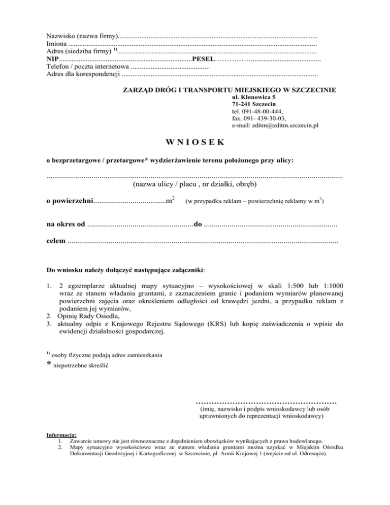 Nazwisko (nazwa firmy)............................................................................................................... Imiona .......................................................................................................................................... Adres (siedziba firmy) 1)............................................................................................................... NIP..........................................................................PESEL……………....................................... Telefon / poczta internetowa ............................................ Adres dla korespondencji ............................................................................................................. ZARZĄD DRÓG I TRANSPORTU MIEJSKIEGO W SZCZECINIE ul. Klonowica 5 71-241 Szczecin tel. 091-48-00-444, fax. 091- 439-30-03, e-mail: [email protected] WNIOSEK o bezprzetargowe / przetargowe* wydzierżawienie terenu położonego przy ulicy: ....................................................................................................................................................... (nazwa ulicy / placu , nr działki, obręb) o powierzchni.....................................m2 (w przypadku reklam – powierzchnię reklamy w m2) na okres od ...................................................... do .................................................................... celem .......................................................................................................................................... Do wniosku należy dołączyć następujące załączniki: 2 egzemplarze aktualnej mapy sytuacyjno – wysokościowej w skali 1:500 lub 1:1000 wraz ze stanem władania gruntami, z zaznaczeniem granic i podaniem wymiarów planowanej powierzchni zajęcia oraz określeniem odległości od krawędzi jezdni, a przypadku reklam z podaniem jej wymiarów, 2. Opinię Rady Osiedla, 3. aktualny odpis z Krajowego Rejestru Sądowego (KRS) lub kopię zaświadczenia o wpisie do ewidencji działalności gospodarczej. 1. 1) osoby fizyczne podają adres zamieszkania * niepotrzebne skreślić ……………………………………………… (imię, nazwisko i podpis wnioskodawcy lub osób uprawnionych do reprezentacji wnioskodawcy) Informacja: 1. Zawarcie umowy nie jest równoznaczne z dopełnieniem obowiązków wynikających z prawa budowlanego. 2. Mapy sytuacyjno wysokościowe wraz ze stanem władania gruntami można uzyskać w Miejskim Ośrodku Dokumentacji Geodezyjnej i Kartograficznej w Szczecinie, pl. Armii Krajowej 1 (wejście od ul. Odrowąża).