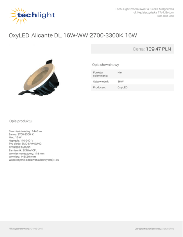 Tech-Light źródła światła Klicka Małgorzata ul. Kędzierzyńska 17/4, Bytom 504 084 348 OxyLED Alicante DL 16W-WW 2700-3300K 16W Cena: 109,47 PLN Opis słownikowy Funkcja ściemniania Nie Odpowiednik 36W Producent OxyLED Opis produktu Strumień świetlny: 1440 lm Barwa: 2700-3300 K Moc: 16 W Napięcie: 110-240 V Typ diody: SMD SAMSUNG Trwałość: 50000h Zamiennik: 2X18W CFL Wymiar montażowy: 118 mm Wymiary: 145X60 mm Współczynnik oddawania barwy (Ra): >85 Plik wygenerowano: 04-03-2017 Powered by TCPDF (www.tcpdf.org) Oprogramowanie sklepu: AptusShop