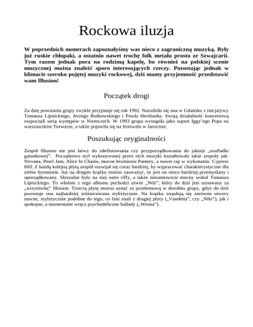 Rockowa iluzja W poprzednich numerach zapoznałyśmy was nieco z zagraniczną muzyką. Były już ruskie chłopaki, a ostatnio nawet trochę folk metalu prosto ze Szwajcarii. Tym razem jednak pora na rodzimą kapelę, bo również na polskiej scenie muzycznej można znaleźć sporo interesujących rzeczy. Pozostając jednak w klimacie szeroko pojętej muzyki rockowej, dziś mamy przyjemność przedstawić wam Illusion! Początek drogi Za datę powstania grupy zwykle przyjmuje się rok 1992. Narodziła się ona w Gdańsku z inicjatywy Tomasza Lipnickiego, Jerzego Rutkowskiego i Pawła Hersbasha. Swoją działalność koncertową rozpoczęli serią występów w Niemczech. W 1993 grupa wystąpiła jako suport Iggy’ego Popa na warszawskim Torwarze, a także pojawiła się na festiwalu w Jarocinie. Poszukując oryginalności Zespół Illusion nie jest łatwy do zdefiniowania czy przyporządkowania do jakiejś „szufladki gatunkowej”. Początkowo styl wykonywanej przez nich muzyki kształtowały takie zespoły jak: Nirvana, Pearl Jam, Alice In Chains, mocne brzmienia Pantery, a nawet rap w wykonaniu Cypress Hill. Z każdą kolejną płytą zespół rozwijał się coraz bardziej, by wypracować charakterystyczne dla siebie brzmienie. Już na drugim krążku można zauważyć, że jest on nieco bardziej przemyślany i uporządkowany. Słyszalne były na niej ostre riffy, a także niesamowicie mocny wokal Tomasza Lipnickiego. To właśnie z tego albumu pochodzi utwór „Nóż”, który do dziś jest uznawany za „wizytówkę” Illusion. Trzecią płytę można uznać za przełomową w dorobku grupy, gdyż do dziś pozostaje ona najbardziej zróżnicowana stylistycznie. Na krążku znajdują się zarówno utwory mocne, stylistycznie podobne do tego, co fani znali z drugiej płyty („Vandetta”, czy „Nikt”), jak i spokojne, a momentami wręcz psychodeliczne ballady („Wrona”). Illusion, Illusion 2… Zespół wydał 5 płyt (w tym jedna koncertówka). Ich tytuły nie są zbyt powalające, brzmią po prostu: • „Illusion”, • „Illusion 2”, • „Illusion 3”, • „Illusion 4 – Bolilol Tour” (album koncertowy) • „Illusion 6 (piąty album, wbrew temu, co sugeruje tytuł)”. Poza nimi w 2011 roku zostało wydane „The Best of Illusion”. Poza największymi hitami zespołu takimi jak „Nóż”, „Na luzie” czy ” To, co ma nadejść” znajdują się tam dwa single nagrane przez Illusion po ponad 10 latach „Solą w oku” oraz „Tron”. Wielu fanów zespołu niezbyt pochlebnie wypowiadało się o albumie „Illusion 6”. Uważali, że zespół został niestety przykładem zjawiska „stare było lepsze”(co obecnie zarzucane jest wielu wykonawcom). Na pierwszych krążkach czuć było świeżość zespołu i zróżnicowanie, na następnych była już to tylko tzw. „łupanina” i wykorzystywanie przebrzmiałych efektów. „Czy to ty z radością w sercu sypiesz wszystkim w oczy piach?” W utworach Illusion istotną rolę odgrywa warstwa tekstowa. Można powiedzieć, że na każdej z płyt teksty skupiają się wokół innego tematu. Pierwsza płyta miała w jak najprostszy sposób opowiadać o życiu codziennym i otaczającej nas rzeczywistości, więc o rzeczach pozornie oczywistych, jak na przykład miłość do bliźniego, o której posłuchać możemy w piosence „Cierń”. Na drugim krążku Lipnicki skupia się na ukazaniu brutalności, którą przepełnione jest życie w Polsce. Tematyka płyty najbardziej widoczna jest we wspomnianym już wcześniej utworze „Nóż” opowiadającym o człowieku, prawdopodobnie będącym mordercą, który pod osłoną nocy sieje postrach na ulicach. Tematyka trzeciej płyty ukierunkowana jest na bunt przeciwko przemocy, czy łamaniu praw człowieka. Lipnicki krytykuje fakt, że ludzie są wobec siebie tak brutalni, a niekiedy nawet może sprawiać im to przyjemność. Fragment piosenki pt. „Vandetta”: „Człowiek to jest zwierz gorszy od hieny jest, bo zabijanie jest dla niego piękne.”, wyjątkowo trafnie opisuje problem poruszany na tym albumie. W nowszych utworach Illusion obecne są także tematy takie jak np. polityka, o której mowa jest w piosence „Solą w oku”. Bo zupa była za słona… Zespół rozpadł się w 1999 roku (prawdę mówiąc można było to przewidzieć). Pożegnalny koncert zagrali 14 listopada 1999 roku w gdańskim klubie "Kwadratowa". Trwał on około 2,5 godziny i obejmował wszystkie bardziej znane utwory z dorobku grupy. Powodem rozstania było to, że „zupa była za słona” jak tłumaczy Lipnicki. Grupa rozpadła się się prawdopodobnie dlatego, że nastąpił moment przesilenia. Rozpad Illusion dał początek grupom Lipali i Oxy.gen. Ci, którzy nie tracili jednak nadziei, że zespół się reaktywuje – nie zawiedli się. W 2011r. muzycy oficjalnie ogłosili reaktywację w oryginalnym składzie. Fani grupy, zapewne z wypiekami na twarzy, oczekiwali na nową twórczość Lipy i ekipy. Pierwszy koncert Illusion odbył się w katowickim spodku, 1 października. Koncertowa magia Jeżeli chodzi o nasze pierwsze w pełni świadome spotkanie z Illusion, to miało ono miejsce na Ursynaliach 2012. Jak się później okazało zespół ten miałyśmy okazję słyszeć już nie raz, chociażby w radiu. Ledwo kojarząc nazwę grupy i jednocześnie znużone oczekiwaniem na gwiazdę sztywno, aż chciało się skakać wraz z tłumem. Również, kiedy nadarzyła się sposobność do zobaczenia kapeli na festiwalu w Jarocinie, nie poczułam się zawiedziona tym, co pokazali. Zespół dawał z siebie wszystko, a dobry kontakt z publicznością sprawiał, że widzowie nie pozostawali dłużni. Każdy śpiewał tak głośno, jak tylko potrafił. Mimo że zespół nie jest już może w szczytowej formie i możliwe, że najlepszy okres ma już za sobą, to jednak z całego serca polecamy wybrać się na Illusion, jeśli tylko będziecie mieli taką okazję. Podczas naszych pr