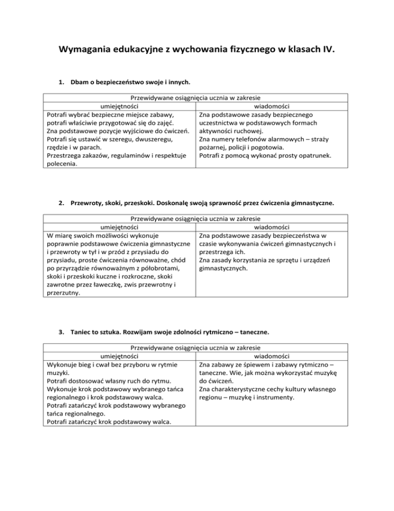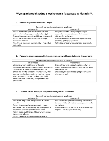 Wymagania edukacyjne z wychowania fizycznego w klasach IV. 1. Dbam o bezpieczeństwo swoje i innych. Przewidywane osiągnięcia ucznia w zakresie umiejętności wiadomości Potrafi wybrać bezpieczne miejsce zabawy, Zna podstawowe zasady bezpiecznego potrafi właściwie przygotować się do zajęć. uczestnictwa w podstawowych formach Zna podstawowe pozycje wyjściowe do ćwiczeń. aktywności ruchowej. Potrafi się ustawić w szeregu, dwuszeregu, Zna numery telefonów alarmowych – straży rzędzie i w parach. pożarnej, policji i pogotowia. Potrafi z pomocą wykonać prosty opatrunek. Przestrzega zakazów, regulaminów i respektuje polecenia. 2. Przewroty, skoki, przeskoki. Doskonalę swoją sprawność przez ćwiczenia gimnastyczne. Przewidywane osiągnięcia ucznia w zakresie umiejętności wiadomości W miarę swoich możliwości wykonuje Zna podstawowe zasady bezpieczeństwa w poprawnie podstawowe ćwiczenia gimnastyczne czasie wykonywania ćwiczeń gimnastycznych i i przewroty w tył i w przód z przysiadu do przestrzega ich. przysiadu, proste ćwiczenia równoważne, chód Zna zasady korzystania ze sprzętu i urządzeń po przyrządzie równoważnym z półobrotami, gimnastycznych. skoki i przeskoki kuczne i rozkroczne, skoki zawrotne przez ławeczkę, zwis przewrotny i przerzutny. 3. Taniec to sztuka. Rozwijam swoje zdolności rytmiczno – taneczne. Przewidywane osiągnięcia ucznia w zakresie umiejętności wiadomości Wykonuje bieg i cwał bez przyboru w rytmie Zna zabawy ze śpiewem i zabawy rytmiczno – muzyki. taneczne. Wie, jak można wykorzystać muzykę do ćwiczeń. Potrafi dostosować własny ruch do rytmu. Zna charakterystyczne cechy kultury własnego Wykonuje krok podstawowy wybranego tańca regionu – muzykę i instrumenty. regionalnego i krok podstawowy walca. Potrafi zatańczyć krok podstawowy wybranego tańca regionalnego. Potrafi zatańczyć krok podstawowy walca. 4. Turystyka i rekreacja. Wypoczywam aktywnie. Przewidywane osiągnięcia ucznia w zakresie umiejętności wiadomości Potrafi wykorzystać własną sprawność Zna różnorodne formy spędzania czasu wolnego. motoryczną w różnorodnych zabawach Omawia zasady aktywnego wypoczynku. ruchowych. Zna przynajmniej dwie gry rekreacyjne. Wykonuje chętnie wszelkie ćwiczenia terenowe, Wie, jakie są walory sportowo – rekreacyjne biegi, marszobiegi, podchody. najbliższej okolicy. Wykonuje ćwiczenia w orientowaniu się w terenie oraz ćwiczenia spostrzegawczości. 5. Jak się rozwijam? Oceniam swoją sprawność i rozwój fizyczny. Przewidywane osiągnięcia ucznia w zakresie umiejętności wiadomości Potrafi z pomocą nauczyciela wykonać wybrane Zna przykłady zabaw i gier sprawdzających próby sprawnościowe. Potrafi w zabawach i poziom sprawności wybranych umiejętności grach wykorzystać swoją sprawność fizyczną. ruchowych. Z pomocą nauczyciela wie, jak dobrać zestaw trzech-czterech ćwiczeń Wykonuje prawidłowo ćwiczenia korekcyjne i kształtujących szybkość i wytrzymałość, moc, kształtujące. Potrafi symetrycznie chodzić i siłę, zwinność i zręczność. Wie, jakie cechy ma maszerować. prawidłowa postawa ciała. Zna sposoby dbania o prawidłową postawę ciała. 6. Szlachetne współzawodnictwo. Ćwiczę biegi, skoki i rzuty. Przewidywane osiągnięcia ucznia w zakresie umiejętności wiadomości Wykonuje start z różnych pozycji. Zna najważniejsze osiągnięcia polskich Wykonuje poprawnie bieg na krótkich lekkoatletów. Zna przykłady zabaw odcinkach w szybkim tempie, bieg po prostej w kształtujących szybkość reakcji. Zna zasady zmiennym tempie oraz krótkie biegi terenowe z udziału w przykładowych zabawach przeszkodami. Prawidłowo wykonuje starty na zwinnościowych, bieżnych, skocznych, rzutnych i sygnał z różnych pozycji w formie zabawowej. z mocowaniem. Potrafi przygotować swój organizm do wysiłku. Potrafi bezpiecznie wykonać skoki, wieloskoki i przeskoki przez przyrządy typowe i nietypowe, rzuty do celu i na odległość. Potrafi wykonać rzut piłeczką palantową z biegu. 7. Poznaję podstawowe elementy techniki i taktyki piłki ręcznej Przewidywane osiągnięcia ucznia w zakresie umiejętności wiadomości Porusza się po boisku biegiem przodem, tyłem, z Zna zespoły piłki ręcznej z najbliższego regionu. obrotami, ze zmianą szybkości i kierunku. Zna przykłady gier z wykorzystaniem elementów Porusza się krokiem dostawnym. Wykonuje piłki ręcznej. prawidłowo podanie i chwyt półgórny w miejscu. Podaje piłkę w ruchu w przód, w tył, w prawo i w lewo. Kozłuje piłkę prawą ręką w miejscu i w marszu. 8. Komunikacja, atak i obrona. Uczę się grać w koszykówkę. Przewidywane osiągnięcia ucznia w zakresie umiejętności wiadomości Porusza się po boisku biegiem przodem, tyłem, z Zna gry i zabawy kształtujące szybkość i obrotami, ze zmianą szybkości i kierunku. zwinność. Zna zespoły piłki koszykowej z Porusza się krokiem dostawnym. najbliższego regionu. Zna przykłady gier z Wykonuje prawidłowo podanie i chwyt półgórny wykorzystaniem elementów koszykówki. w miejscu i w ruchu oraz oburącz sprzed klatki piersiowej. Podaje piłkę w ruchu w przód, w tył, w prawo i w lewo. Podaje piłkę oburącz znad głowy. Kozłuje piłkę prawą i lewą ręką w miejscu i w marszu. Wykonuje rzut oburącz sprzed klatki piersiowej do kosza. 9. Piłka siatkowa. Poznaję zasady współdziałania i współpracy w zespole. Przewidywane osiągnięcia ucznia w zakresie umiejętności wiadomości Ma opanowane w stopniu dobrym podstawowe Zna regionalne kluby siatkarskie. elementy piłki siatkowej – przyjmowanie pozycji Zna zasady i przepisy gry „rzucanka siatkarska” siatkarskiej wysokiej, poruszanie się po boisku, podanie i przyjęcie piłki oburącz w postawie wysokiej sposobem dolnym, zagrywka dolna. 10. Szacunek dla przeciwnika w piłce nożnej. Jestem zawodnikiem, sędzią, kibicem. Przewidywane osiągnięcia ucznia w z