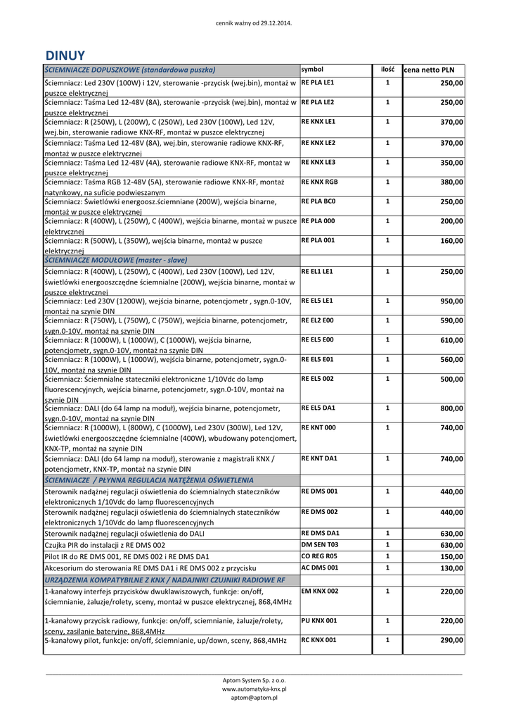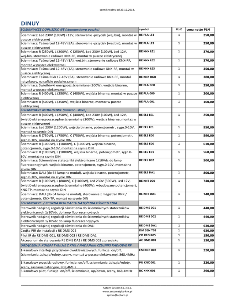 cennik ważny od 29.12.2014. DINUY ŚCIEMNIACZE DOPUSZKOWE (standardowa puszka) symbol Ściemniacz: Led 230V (100W) i 12V, sterowanie -przycisk (wej.bin), montaż w puszce elektrycznej Ściemniacz: Taśma Led 12-48V (8A), sterowanie -przycisk (wej.bin), montaż w puszce elektrycznej Ściemniacz: R (250W), L (200W), C (250W), Led 230V (100W), Led 12V, wej.bin, sterowanie radiowe KNX-RF, montaż w puszce elektrycznej Ściemniacz: Taśma Led 12-48V (8A), wej.bin, sterowanie radiowe KNX-RF, montaż w puszce elektrycznej Ściemniacz: Taśma Led 12-48V (4A), sterowanie radiowe KNX-RF, montaż w puszce elektrycznej Ściemniacz: Taśma RGB 12-48V (5A), sterowanie radiowe KNX-RF, montaż natynkowy, na suficie podwieszanym Ściemniacz: Świetlówki energoosz.ściemniane (200W), wejścia binarne, montaż w puszce elektrycznej Ściemniacz: R (400W), L (250W), C (400W), wejścia binarne, montaż w puszce elektrycznej Ściemniacz: R (500W), L (350W), wejścia binarne, montaż w puszce elektrycznej ŚCIEMNIACZE MODUŁOWE (master - slave) Ściemniacz: R (400W), L (250W), C (400W), Led 230V (100W), Led 12V, świetlówki energooszczędne ściemnialne (200W), wejścia binarne, montaż w puszce elektrycznej Ściemniacz: Led 230V (1200W), wejścia binarne, potencjometr , sygn.0-10V, montaż na szynie DIN Ściemniacz: R (750W), L (750W), C (750W), wejścia binarne, potencjometr, sygn.0-10V, montaż na szynie DIN Ściemniacz: R (1000W), L (1000W), C (1000W), wejścia binarne, potencjometr, sygn.0-10V, montaż na szynie DIN Ściemniacz: R (1000W), L (1000W), wejścia binarne, potencjometr, sygn.010V, montaż na szynie DIN Ściemniacz: Ściemnialne stateczniki elektroniczne 1/10Vdc do lamp fluorescencyjnych, wejścia binarne, potencjometr, sygn.0-10V, montaż na szynie DIN Ściemniacz: DALI (do 64 lamp na moduł), wejścia binarne, potencjometr, sygn.0-10V, montaż na szynie DIN Ściemniacz: R (1000W), L (800W), C (1000W), Led 230V (300W), Led 12V, świetlówki energooszczędne ściemnialne (400W), wbudowany potencjomert, KNX-TP, montaż na szynie DIN Ściemniacz: DALI (do 64 lamp na moduł), sterowanie z magistrali KNX / potencjometr, KNX-TP, montaż na szynie DIN ŚCIEMNIACZE / PŁYNNA REGULACJA NATĘŻENIA OŚWIETLENIA Sterownik nadążnej regulacji oświetlenia do ściemnialnych stateczników elektronicznych 1/10Vdc do lamp fluorescencyjnych Sterownik nadążnej regulacji oświetlenia do ściemnialnych stateczników elektronicznych 1/10Vdc do lamp fluorescencyjnych Sterownik nadążnej regulacji oświetlenia do DALI Czujka PIR do instalacji z RE DMS 002 Pilot IR do RE DMS 001, RE DMS 002 i RE DMS DA1 Akcesorium do sterowania RE DMS DA1 i RE DMS 002 z przycisku URZĄDZENIA KOMPATYBILNE Z KNX / NADAJNIKI CZUJNIKI RADIOWE RF 1-kanałowy interfejs przycisków dwuklawiszowych, funkcje: on/off, ściemnianie, żaluzje/rolety, sceny, montaż w puszce elektrycznej, 868,4MHz RE PLA LE1 1 250,00 RE PLA LE2 1 250,00 RE KNX LE1 1 370,00 RE KNX LE2 1 370,00 RE KNX LE3 1 350,00 RE KNX RGB 1 380,00 RE PLA BC0 1 250,00 RE PLA 000 1 200,00 RE PLA 001 1 160,00 RE EL1 LE1 1 250,00 RE EL5 LE1 1 950,00 RE EL2 E00 1 590,00 RE EL5 E00 1 610,00 RE EL5 E01 1 560,00 RE EL5 002 1 500,00 RE EL5 DA1 1 800,00 RE KNT 000 1 740,00 RE KNT DA1 1 740,00 RE DMS 001 1 440,00 RE DMS 002 1 440,00 RE DMS DA1 1 DM SEN T03 1 1-kanałowy przycisk radiowy, funkcje: on/off, sciemnianie, żaluzje/rolety, sceny, zasilanie bateryjne, 868,4MHz 5-kanałowy pilot, funkcje: on/off, ściemnianie, up/down, sceny, 868,4MHz ilość cena netto PLN CO REG R05 1 AC DMS 001 1 630,00 630,00 150,00 130,00 EM KNX 002 1 220,00 PU KNX 001 1 220,00 RC KNX 001 1 290,00 ___________________________________________________________________________________________________________________________________ Aptom System Sp. z o.o. www.automatyka-knx.pl [email protected] cennik ważny od 29.12.2014. Radiowy czujnik temperatury, zasilanie bateryjne 1x3V, 868,4MHz Radiowy czujnik natężenia oświetlenia, zasilanie bateryjne 1x3V, 868,4MHz SE KNX 001 1 320,00 SE KNX 002 1 320,00 Radiowy kontaktron okna/drzwi, zasilanie bateryjne 1x3V, 868,4MHz Radiowy czujnik temperatury z nastawą temp., zasilanie bateryjne 1x3V, 868,4MHz Radiowy czujnik temperatury z sondą temp. (3m kabla), zasilanie 230V, 868,4MHz Radiowa czujka ruchu PIR sufitowa, wbudowany czujnik światła, zasilanie bateryjne (litowa), 868,4MHz Radiowa czujka ruchu PIR naścienna, wbudowany czujnik światła, zasilanie bateryjne, 868,4MHz Radiowa czujka obecności PIR sufitowa, zasilanie bateryjne, 868,4MHz Radiowy wzmacniacz sygnału, do 3 wzmacniaczy w instalacji, zasilanie 230V, 868,4MHz URZĄDZENIA KOMPATYBILNE Z KNX / ODBIORNIKI SIŁOWNIKI RADIOWE RF Radiowy 1-kanałowy aktor, wyjścia przekaźnikowe 16A, funkcje: on/off, timer, wzmacniacz sygnału, montaż na szynie DIN Radiowy 1-kanałowy aktor, wyjścia przekaźnikowe 16A (styki bezpotencjałowe), funkcje: on/off, timer, wzmacniacz sygnału, montaż w puszce elektrycznej Radiowy aktor żaluzjowy 1-kanałowy lub 2-kanałowe wyjście przekaźnikowe 16A, 2 wejścia binarne, zasilanie 230V, montaż natynkowy, lub sufit podwieszany Radiowy 1-kanałowy aktor (16A) z termostatem, zasilanie 230V, montaż na szynie DIN Radiowy 1-kanałowy ściemniacz - lampy Led 230V (100W), Led 12V, R (250W), L (200W), C (250W), wejścia binarne, montaż w puszce elektrycznej SE KNX 003 SE KNX 004 1 1 380,00 370,00 SE KNX 005 1 430,00 DM KNX 001 1 560,00 DM KNX 002 1 540,00 DP KNX 001 1 AM KNX 001 1 560,00 220,00 IT KNX 001 1 390,00 MI KNX 001 1 420,00 PE KNX 001 1 510,00 TM KNX 001 1 430,00 RE KNX LE1 1 370,00 Radiowy 1-kanałowy ściemniacz do taśm Led 12-48V (8A), wejścia binarne, sterowanie radiowe KNX-RF, montaż w puszce elektrycznej Radiowy 1-kanałowy ściemniacz do taśm RGB 12-48V (5A), sterowanie radiowe KNX-RF, montaż natynkowy, na suficie podwieszanym Radiowy sterownik nadążnej regulacji oświetlenia do DALI URZĄDZENIA KOMPATYBILNE Z KNX / KOMUNIKACJA RADIOWA RF Interfejs KNX-