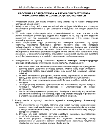 Szkoła Podstawowa nr 4 im. M. Kopernika w Tarnobrzegu PROCEDURA POSTĘPOWANIA W PRZYPADKU ZAISTNIENIA WYPADKU UCZNIA W CZASIE ZAJĘĆ EDUKACYJNYCH 1. Wypadkiem ucznia jest każdy wypadek, który zdarzył się w czasie przebywania ucznia pod opieką szkoły. 2. Każdy uczeń szkoły, który uległ wypadkowi lub był jego świadkiem ma obowiązek niezwłocznie poinformować o tym zdarzeniu nauczyciela lub innego pracownika szkoły. 3. W czasie zajęć edukacyjnych pełną odpowiedzialność za życie i zdrowie ucznia ponosi nauczyciel prowadzący zajęcia bez względu na to, czy są one zajęciami planowymi, czy też nauczyciel zastępuje nieobecnego w tym czasie innego prowadzącego dane zajęcia. 4. Przed rozpoczęciem zajęć prowadzący ma obowiązek sprawdzić, czy sprzęt sportowy, urządzenia techniczne, pomoce naukowe oraz inne narzędzia wykorzystywane w czasie zajęć, a także pomieszczenie lekcyjne nie stwarzają zagrożenia bezpieczeństwa dla ucznia. Jeżeli stan techniczny budzi zastrzeżenia nauczyciel lub inna osoba prowadząca zajęcia nie ma prawa z nich korzystać w pracy z uczniem. O zaistniałym zagrożeniu prowadzący natychmiast powiadamia dyrektora szkoły lub jego zastępcę, a w razie ich nieobecności osobę zastępującą. 5. Postępowanie w sytuacji zaistnienia wypadku lekkiego, niewymagającego interwencji lekarza (powierzchowne otarcia naskórka, stłuczenia, itp.): a. Po stwierdzeniu zdarzenia należy ucznia odprowadzić do gabinetu pielęgniarki szkolnej celem udzielenia pierwszej pomocy. Ucznia, który uległ wypadkowi o charakterze lekkim odprowadzić może inny uczeń lub pracownik obsługi szkolnej. b. W razie nieobecności pielęgniarki, ucznia należy odprowadzić do sekretariatu szkoły, gdzie pomocy udziela osoba mająca przeszkolenie w tym zakresie. c. O zdarzeniu i jego przyczynach nauczyciel informuje dyrektora szkoły lub jego zastępcę. d. Jeżeli przyczyną zdarzenia była wadliwość lub niesprawność użytych narzędzi, nauczyciel natychmiast zabezpiecza je, uniemożliwiając ich dalsze użytkowanie. e. Osoba udzielająca pierwszej pomocy ma obowiązek upewnić się, czy uczeń nie jest chory na hemofilię lub cukrzycę, bądź inną chorobę mogącą w połączeniu z urazem stanowić niebezpieczeństwo dla zdrowia lub życia. 6. Postępowanie w sytuacji zaistnienia wypadku wymagającego interwencji lekarza: a. Po stwierdzeniu, że wypadek, któremu uległ uczeń wymaga specjalistycznej pomocy, nauczyciel wysyła jednego z uczniów tej klasy po pielęgniarkę szkolną, a innego do sekretariatu szkoły w celu zawiadomienia dyrektora szkoły lub jego zastępcę o wypadku. b. Dyrektor lub jego zastępca wzywają pogotowie ratunkowe i powiadamiają rodziców (opiekunów prawnych) ucznia o wypadku. c. Do czasu przybycia pielęgniarki lub pogotowia ratunkowego osoby przeszkolone w udzielaniu pomocy przedmedycznej podejmują natychmiast niezbędne czynności ratujące zdrowie i życie ucznia. Szkoła Podstawowa nr 4 im. M. Kopernika w Tarnobrzegu d. Dyrektor szkoły lub jego zastępca powiadamia o wypadku inspektora bhp. e. Każdy w/w wypadek podlega rejestracji i wymaga sporządzenia dokumentacji powypadkowej, w której określa się przebieg wypadku oraz wskazuje osobę (wychowawcę, nauczyciela) bezpośrednio sprawującego opiekę nad uczniem w momencie nieszczęśliwego zdarzenia. f. Wypadek jest wpisywany do rejestru. 7. Postępowanie w sytuacji zaistnienia wypadku powodującego ciężkie uszkodzenie ciała lub ze skutkiem śmiertelnym: a. W sytuacji, kiedy nastąpił wypadek zbiorowy lub ciężkie uszkodzenie ciała należy natychmiast wezwać pogotowie ratunkowe, a do czasu jego przybycia osoby przeszkolone w udzielaniu pomocy przedmedycznej podejmują natychmiast niezbędne czynności ratujące zdrowie i życie ucznia. b. Jeżeli w wyniku wypadku nastąpił zgon osoby poszkodowanej nauczyciel prowadzący zajęcia edukacyjne zabezpiecza miejsce zdarzenia i natychmiast wzywa na jego miejsce dyrektora szkoły lub jego zastępcę. c. Dyrektor szkoły, jego zastępca lub pedagog informuje o zdarzeniu rodziców (opiekunów prawnych), policję, prokuraturę, SANEPiD (w przypadku zatruć), kuratorium oraz organ prowadzący. d. Do czasu przybycia policji teren wypadku pozostaje zabezpieczony tak, by było możliwe pełne ustalenie okoliczności i przyczyn zdarzenia. e. Celem ustalenia okoliczności wypadku dyrektor szkoły powołuje komisję badającą przyczyny jego powstania. Z prac komisji spisywany jest protokół, który musi zawierać wnioski mające zapobiec powstaniu podobnych zdarzeń. f. Wypadek jest wpisywany do rejestru, a wnioski komisji są omawiane na posiedzeniu rady pedagogicznej. 8. Zawiadamianie o wypadku. a. O każdym wypadku ucznia zawiadamia się organ prowadzący szkołę i Radę Rodziców w formie informacji zbiorczej przekazywanej co najmniej 2 razy w ciągu roku szkolnego. Informację przygotowuje pracownik służby bhp na podstawie dokumentacji z wypadków uczniów. Szkoła niezwłocznie o każdym wypadku zawiadamia: rodziców (prawnych opiekunów) poszkodowanego; organ prowadzący szkołę w razie wypadku, o którym mowa w pkt 6 i 7; o wypadku śmiertelnym, ciężkim i zbiorowym - prokuratora i kuratora oświaty; o wypadku, do którego doszło w wyniku zatrucia - inspektora sanitarnego; o wypadku, w którym uraz spowodowany jest agresywnym działaniem osoby trzeciej – policję. b. Wszystkie wypadki uczniów są dokumentowane przez sporządzenie protokołu ustalenia przyczyn i okoliczności wypadku ucznia. Protokół sporządza zespół powypadkowy powołany przez dyrektora szkoły po przeprowadzeniu postępowania powypadkowego. W jego skład wchodzi pracownik służby bhp i społeczny inspektor pracy. Jeżeli w pracy zespołu nie może uczestniczyć pracownik służby bhp lub społeczny inspektor pracy, dyrektor szkoły może powołać w ich miejsce innego pracownika szkoły przeszkolonego w zakresie bhp. W zespole 