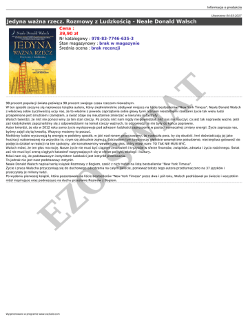 Informacje o produkcie Utworzono 04-03-2017 Jedyna ważna rzecz. Rozmowy z Ludzkością - Neale Donald Walsch Cena : 39,90 zł IA T Nr katalogowy : 978-83-7746-635-3 Stan magazynowy : brak w magazynie Średnia ocena : brak recenzji EZ O ŚW 98 procent populacji świata poświęca 98 procent swojego czasu rzeczom nieważnym. W ten sposób zaczyna się najnowsza książka autora, który siedmiokrotnie zdobywał miejsce na liście bestsellerów "New York Timesa". Neale Donald Walsch z właściwą sobie życzliwością uczy nas, że to właśnie z powodu zaprzątania sobie głowy tymi różnymi nieistotnymi rzeczami życie tak wielu ludzi przepełnione jest smutkiem i zamętem, a świat zdaje się nieustannie zmierzać w kierunku katastrofy. Walsch twierdzi, że nikt nie ponosi winy za ten stan rzeczy. Po prostu nikt nam nigdy nie powiedział, nikt nas nie nauczył, co jest tak naprawdę ważne. Jeśli zaś kiedykolwiek zapoznaliśmy się z odpowiedziami na temat rzeczy ważnych, to odpowiedzi te nie były do końca poprawne. Autor twierdzi, że oto w 2012 roku samo życie wystosowuje pod adresem ludzkości zaproszenie w postaci namacalnej zmiany energii. Życie zaprasza nas, byśmy zajęli się tą kwestią. Wszyscy możemy to poczuć. Niektórzy ludzie wyczuwają tę energię w podobny sposób, w jaki nad ranem przeczuwamy, że nadeszła pora, by się obudzić. Inni doświadczają jej jako frustracji nakierowanej na wszystko to, czym się aktualnie zajmują. Odczuciom tym towarzyszy głębokie wewnętrzne pobudzenie, niecierpliwa gotowość do podjęcia działań w reakcji na ten spokojny, ale konsekwentny wewnętrzny głos, który mówi nam: TO TAK NIE MUSI BYĆ. Walsch mówi, że ten głos ma rację. Nasze życie nie musi być ciągiem zmartwień i kryzysów w sferze finansów, związków, zdrowia i życia rodzinnego. Świat zaś nie musi być areną ciągłych katastrof rozgrywających się w sferze polityki, ekologii i kultury. Mówi nam się, że podstawowym instynktem ludzkości jest instynkt przetrwania. To jednak nie jest nasz podstawowy instynkt. Neale Donald Walsch napisał serię książek Rozmowy z Bogiem, sześć z nich trafiło na listę bestsellerów "New York Timesa". Życie i praca Walscha przyczyniają się do duchowego odrodzenia na całym świecie, ponieważ teksty tego autora przetłumaczono na 37 języków i przeczytały je miliony ludzi. Po wydaniu pierwszej książki, która pozostawała na liście bestsellerów "New York Timesa" przez dwa i pół roku, Walsch podróżował po świecie i wszystkim niósł inspirujące oraz podnoszące na duchu przesłanie Rozmów z Bogiem. Wygenerowano w programie www.oscGold.com
