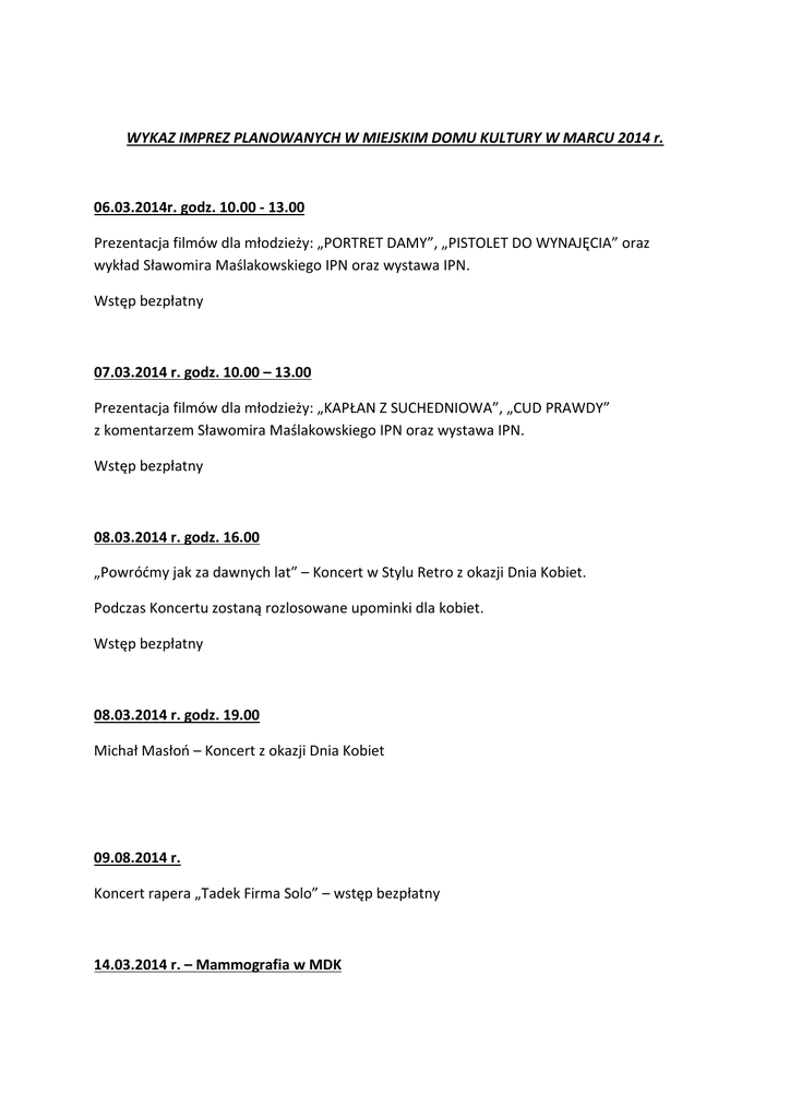 WYKAZ IMPREZ PLANOWANYCH W MIEJSKIM DOMU KULTURY