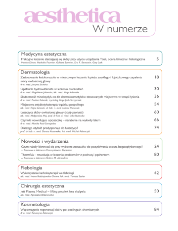 W numerze Medycyna estetyczna Frakcyjne leczenie starzejącej się skóry przy użyciu urządzenia Tixel, ocena kliniczna i histologiczna 5 Monica Elman, Nathalie Fournier, Golbert Barnéon, Eric F. Bernstein, Gary Lask Dermatologia Zastosowanie ketokonazolu w miejscowym leczeniu łupieżu zwykłego i łojotokowego zapalenia skóry owłosionej głowy 18 dr n. med. Justyna Sicińska Opatrunki hydrowłókniste w leczeniu owrzodzeń 30 dr n. med. Magdalena Jałowska, lek. med. Kinga Adamska Skuteczność minoksydylu na tle dermokosmetyków stosowanych miejscowo w terapii łysienia 36 dr n. med. Paulina Kubasik, trycholog Kinga Jach-Skrzypczak Miejscowa antybiotykoterapia trądziku pospolitego 54 lek. med. Edyta Lelonek, dr hab. n. med. Łukasz Matusiak Łuszczyca skóry owłosionej głowy (scalp psoriasis) 60 lek. med. Małgorzata Maj, prof. dr hab. n. med. Lidia Rudnicka Czynniki wywołujące opryszczkę – narażenie na wykwity latem 66 dr n. med. Monika Paul-Samojedny Dlaczego otyłość predysponuje do łuszczycy? 74 prof. dr hab. n. med. Dorota Krasowska, lek. med. Michał Adamczyk Nowości i wydarzenia Czym należy kierować się przy wyborze zestawów do pozyskiwania osocza bogatopłytkowego? – Rozmowa z doktorem Przemysławem Styczniem 24 ThermiVa – rewolucja w leczeniu problemów z pochwą i pęcherzem – Rozmowa z doktorem Redem M. Alinsodem 80 Flebologia Wykorzystanie karboksyterapii we flebologii 42 lek. med. Iwona Radziejewska-Choma, lek. med. Tomasz Szular Chirurgia estetyczna Jett Plasma Medical – lifting powiek bez skalpela 50 lek. med. Agnieszka Bliżanowska Kosmetologia Wspomaganie regeneracji skóry po peelingach chemicznych dr n. med. Katarzyna Adamczyk 84 Szanowni Państwo, na plażę, nad jezioro, w góry – dokądkolwiek byśmy nie pojechali w te wakacje, jedno jest pewne: wszędzie będziemy chcieli czuć się atrakcyjnie. Trafia do Państwa rąk kolejne, wakacyjne, wydanie dwumiesięcznika Aesthetica. Oprócz spędzenia czasu na zasłużonym odpoczynku, warto na bieżąco zapoznawać się z informacjami i nowinkami ze świata medycyny estetycznej oraz dermatologii. Nie brakuje ich w niniejszym numerze – każdy z artykułów to ciekawa i wartościowa merytorycznie lektura. Co znajdą więc Państwo w bieżącym wydaniu magazynu Aesthetica? Jednym z tematów, który przybliżony zostaje w kilku tekstach jest trychologia. Na początek zachęcam do lektury artykułu trychologa Kingi Jach-Skrzypczak oraz dr n. med. Pauliny Kubasik – „Skuteczność minoksydylu na tle dermokosmetyków stosowanych miejscowo w terapii łysienia”. Autorki prezentują szeroki wachlarz możliwości terapii łysienia, koncentrując się na jednym z najpopularniejszych związków aktywnych, jakim jest minoksydyl. Kolejny artykuł o tej tematyce kładzie nacisk na praktykę – doskonale wiemy, jak istotna jest ona z punktu widzenia lekarza. Swoimi doświadczeniami dzieli się dr n. med. Justyna Sicińska, która opisuje zastosowanie ketokonazolu w miejscowym leczeniu łupieżu zwykłego i łojotokowego zapalenia skóry owłosionej głowy. Autorka prezentuje zastosowanie ketokonazolu w kontekście swoich bogatych, wieloletnich doświadczeń zawodowych oraz opisuje ciekawe przypadki kliniczne. Następny tekst, „Łuszczyca skóry owłosionej głowy (scalp psoriasis)”, również koncentruje się wokół zagadnień trychologicznych, a autorki – lek. med. Małgorzata Maj oraz prof. dr hab. n. med. Lidia Rudnicka – skorzystały zarówno z najnowszej literatury naukowej, jak i własnych doświadczeń praktycznych. Podzieliły się one swoimi cennymi komentarzami na temat metod diagnostycznych i terapeutycznych w łuszczycy skóry głowy. Wydanie to wzbogacają również dwa bardzo interesujące wywiady. Pierwszy z nich, z wybitnym ekspertem lek. med. Przemysławem Styczniem, zawiera rzeczowe informacje na temat systemów służących do wykonywania zabiegów z udziałem osocza bogatopłytkowego. Zabiegi z wykorzystaniem tego preparatu zdobywają coraz szerszą grupę zwolenników, więc na rynku pojawia się wiele nowych propozycji urządzeń i systemów. Kolejną rozmowę przeprowadzamy ze światowej sławy specjalistą uroginekologii Redem M. Alinsodem. Dzieli się on z Czytelnikami swoimi doświadczeniami związanymi z wykorzystaniem urządzenia ThermiVa w leczeniu problemów z pochwą i pęcherzem. Jest to wyjątkowa okazja gościć na łamach naszego czasopisma tak cenionego praktyka. Jestem pewien, że wakacje upłyną Państwu pod znakiem słońca, wypoczynku, ale także zdrowia i radości. Liczę na to, że trzymany w Państwa rękach najnowszy numer dwumiesięcznika Aesthetica będzie źródłem motywacji i inspiracji do nowych wyzwań. Sławomir Wilczyński redaktor naczelny medycyna estetyczna Monica Elman1, Nathalie Fournier2, Golbert Barnéon3 Eric F. Bernstein4, Gary Lask5 1 Elman Laser Clinic, Rishon Le-Zion, Izrael, CLDP, Clapiers, Francja, 3 Centre Pathology, Montpellier, Francja, 4 Main Line Centre for Laser Surgery, Ardmore, PA, USA, 5 UCLA Medical School, Los Angeles, CA, USA 2 RAPORT Z OBSERWACJI KLINICZNEJ Frakcyjne leczenie starzejącej się skóry przy użyciu urządzenia Tixel, ocena kliniczna i histologiczna Zabiegi dermabrazji skóry przy użyciu lasera frakcyjnego są powszechnie stosowane w dermatologii. Za jeden z najlepszych sposobów przeprowadzania wysoko precyzyjnej ablacji cienkich warstw tkanek bez krwawienia i z minimalnymi uszkodzeniami ubocznymi uważane są lasery CO2 o krótkim czasie impulsu[1]. Są one szeroko stosowane podczas zabiegów dermabrazji frakcyjnej skóry[2,3] w celu poprawy jej gładkości oraz likwidacji drobnych zmarszczek. Leczenie jest bolesne i wiąże się z koniecznością zastosowania kremów znieczulających oraz środków ochrony oczu. Czas wyłączenia pacjenta z powodu rekonwalescencji wynosi ok. 5 dni. Przy głębokości penetracji tkanki na poziomie 30-50 μm i promieniem lasera o długości fali 10,6 μm, moż