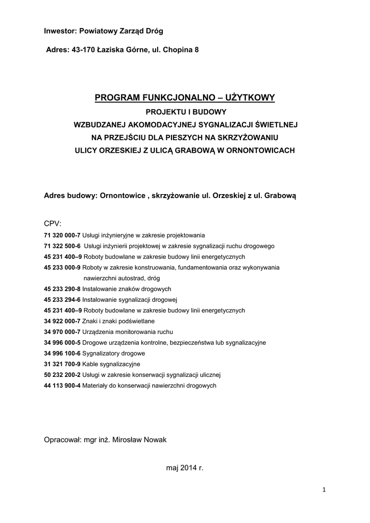 Inwestor: Powiatowy Zarząd Dróg Adres: 43-170 Łaziska Górne, ul. Chopina 8 PROGRAM FUNKCJONALNO – UŻYTKOWY PROJEKTU I BUDOWY WZBUDZANEJ AKOMODACYJNEJ SYGNALIZACJI ŚWIETLNEJ NA PRZEJŚCIU DLA PIESZYCH NA SKRZYŻOWANIU ULICY ORZESKIEJ Z ULICĄ GRABOWĄ W ORNONTOWICACH Adres budowy: Ornontowice , skrzyżowanie ul. Orzeskiej z ul. Grabową CPV: 71 320 000-7 Usługi inżynieryjne w zakresie projektowania 71 322 500-6 Usługi inżynierii projektowej w zakresie sygnalizacji ruchu drogowego 45 231 400–9 Roboty budowlane w zakresie budowy linii energetycznych 45 233 000-9 Roboty w zakresie konstruowania, fundamentowania oraz wykonywania nawierzchni autostrad, dróg 45 233 290-8 Instalowanie znaków drogowych 45 233 294-6 Instalowanie sygnalizacji drogowej 45 231 400–9 Roboty budowlane w zakresie budowy linii energetycznych 34 922 000-7 Znaki i znaki podświetlane 34 970 000-7 Urządzenia monitorowania ruchu 34 996 000-5 Drogowe urządzenia kontrolne, bezpieczeństwa lub sygnalizacyjne 34 996 100-6 Sygnalizatory drogowe 31 321 700-9 Kable sygnalizacyjne 50 232 200-2 Usługi w zakresie konserwacji sygnalizacji ulicznej 44 113 900-4 Materiały do konserwacji nawierzchni drogowych Opracował: mgr inż. Mirosław Nowak maj 2014 r. 1 1.Opis przedmiotu zamówienia Przedmiotem zamówienia jest opracowanie projektu i budowa wzbudzanej akomodacyjnej sygnalizacji świetlnej na przejściu dla pieszych na skrzyżowaniu ulicy Orzeskiej i ulicy Grabowej w Ornontowicach . Ulica Orzeska (DP 2908S) jest drogą powiatową z jezdnią o nawierzchni asfaltowej. Jest dwukierunkowa. Na przedmiotowym odcinku występują chodniki . Zakres zamówienia obejmuje: - - - uzyskanie aktualnych map do celów projektowych, wykonanie projektu budowlano-wykonawczego wzbudzanej akomodacyjnej sygnalizacji świetlnej na skrzyżowaniu, uzyskanie wymaganych zatwierdzeń i uzgodnień projektu (Tauron, ZUD, Policja, , PZD, ...), wykonanie projektu organizacji ruchu docelowej i na czas prowadzenia robót budowlano-montażowych w pasie drogowym, zgłoszenie zajęcia pasa drogowego na czas prowadzenia robót, wykonanie zasilania sygnalizacji zgodnie z warunkami określonymi przez TAURON Polska Energia S.A. wraz z przeprowadzeniem stosownych odbiorów z udziałem TAURON) – po stronie Zamawiającego jest uzyskanie i dostarczenie warunków przyłączenia do sieci , wykonanie sygnalizacji świetlnej skrzyżowania wraz z przeprowadzeniem odbioru z udziałem administratora drogi i Policji oraz włączenie do eksploatacji, wykonanie oznakowania jezdni pionowego i poziomego, przygotowanie wszelkich dokumentów związanych z oddaniem obiektu do użytkowania, wykonanie inwentaryzacji geodezyjnej. 2. Opis wymagań zamawiającego w stosunku do przedmiotu zamówienia. 2.1 Zakres prac Zakres prac obejmuje: - prace projektowe dla sygnalizacji świetlnej i zasilania sygnalizacji wraz z niezbędnymi uzgodnieniami i opiniami - uzyskanie zgody właścicieli gruntów na przeprowadzenie przyłączy elektrycznych i kabli sygnalizacyjnych, - prace przygotowawcze, - dostawę materiałów, - wytyczenie tras kanalizacji, przepustów, masztów i sterownika w terenie, - nadzór użytkowników linii i obiektów krzyżowanych, - wykonanie i zasypanie wykopów kontrolnych, 2 - wykonanie i zasypanie wykopów dla kanalizacji i przepustów z ubiciem gruntu warstwami, wyrównaniem terenu i wywiezieniem nadmiaru gruntu, - wykonanie posypki i zasypki z piasku dla kanalizacji, - montaż fundamentów pod maszty sygnalizacyjne, wysięgniki, bramy, złącze kablowo – pomiarowe oraz sterownik, - wykonanie kanalizacji kablowej z rur: - SRS 110mm – pod jezdniami, - DVR 110mm – pod chodnikami i zieleńcami w obrębie skrzyżowania (wspólny przebieg kabli sterowniczych i feederów), - wykonanie przyłącza elektrycznego, - wciągnięcie projektowanych kabli sygnalizacyjnych YKSY do kanalizacji kablowej od sterownika do kolumn sygnalizacyjnych, wciągnięcie w przypadku masztów MSW przy udziale podnośnika kabli YKSY od kolumn sygnalizacyjnych do sygnalizatorów zwieszonych nad jezdnią, - wciągnięcie kabli teletechnicznych XzTKMXpw do kanalizacji kablowej od sterownika do typowego złącza odgałęźnego telefonicznego zlokalizowanego w studni SK-1, - wciąganie kabli wizyjnych XwDXpek do kanalizacji kablowej i do kanałów zamkniętych od sterownika do kamery wideo detektora; - ułożenie kabla zasilającego YKY w rowie kablowym, - uszczelnienie otworów kanalizacji i wyprowadzeń kabli, - obróbka końców kabli sterowniczych YKSY, - obróbka końcówki kabla zasilającego YKY, - obróbka końców kabli teletechnicznych XzTKMXpw, - obróbka końców kabli wizyjnych XwDXpek, - znakowanie i opisanie kabli znacznikami plastikowymi, - ochrona antykorozyjna konstrukcji masztów i wysięgników, - zabezpieczenie antykorozyjne sygnalizacyjnych, - montaż masztów sygnalizacyjnych MS i MSW, - montaż głowic sygnalizacyjnych, - montaż kolumn (latarń) sygnalizacyjnych, - montaż sterownika i szafy na fundamencie prefabrykowanym dostarczonej przez producenta sterownika wyposażonej w zabezpieczenia przeciwprzepięciowe, nadprądowe oraz ochronę przeciwporażeniową, studni SK-1, fundamentów masztów 3 - montaż przycisków sterowniczych dla pieszych, - montaż sygnalizacji dźwiękowej dla osób niewidomych, - wykonanie połączenia kolumn zgłoszeniowych z głowicami, - montaż uziemień, - montaż uziomów szpilkowych wyznaczonych masztów sygnalizacji, - zabudowa pętli indukcyjnych w nawierzchni jezdni, - zabudowa kamer systemu wideodetekcji, - wykonanie oznakowania drogowego pionowego i poziomego zgodnego z zatwierdzoną organizacją ruchu, - odbiór techniczny robót zanikających i ulegających zakryciu przed zasypaniem, - badania próby i pomiary linii oraz prace rozruchowo – regulacyjne, - plantowanie czyszczenie terenu, wywiezienie nadmiaru gruntu i gruzu, - odtworzenie uszkodzonej nawierzchni chodników i jezdni, - wykonanie inwentaryzacji i pomiarów geo