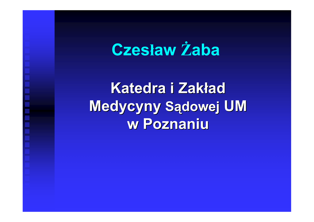 Czesław Żaba Katedra i Zakład Medycyny Sądowej UM w Poznaniu Hic mors gaudet succurrere vitae et iustitiae Tutaj śmierć się cieszy, że może pomóc życiu i sprawiedliwości. Medycyna sądowa jest nauką stosowaną, która - jako jedna ze specjalności lekarskich - tworzy pomost łączący wiedzę biologiczno - lekarską z naukami prawnymi, służąc fachową pomocą przede wszystkim organom ścigania karnego i wymiaru sprawiedliwości. Nazwa - medycyna sądowa Nazwa tej specjalności lekarskiej bywa odmienna w różnych krajach, przy czym używa się - obok rzeczownika "medycyna" - dwóch przymiotników: "prawna" lub "sądowa". MEDYCYNA A PRAWO Zagadnienia styku prawa i medycyny nie należą do łatwych. Prawo jest systemem regulacji normatywnych zależnych od precyzyjnych definicji. Medycyna, jako nauka przyrodnicza, zależy od faktów biologicznych. Filozofia prawa jest określona, w danym miejscu kończy się byt normatywny, zaś zaczyna inny. Prawo klasyfikuje materię w system rozłącznych kategorii, konkluzji „tak – nie” (np. winnyniewinny, dłużnik-wierzyciel, powód-pozwany). MEDYCYNA A PRAWO Zjawiska zachodzące w medycynie nie dają się zredukować do tych rozłącznych kategorii. Medycyna z reguły jest niezdolna do produkowania tak jednoznacznych i kategorycznych konkluzji. Nie istnieje ani stan absolutnego zdrowia, albo stan absolutnej choroby, ani też granica w którym kończy się zdrowie a zaczyna choroba. MEDYCYNA A PRAWO Wśród nauk lekarskich medycyna sądowa obejmuje zagadnienia szersze, związane nie tylko z fizycznym, lecz z moralnym zdrowiem jednostek i społeczeństwa. Zakres medycyny sądowej wyznaczają zagadnienia stwarzane lub wysuwane przez prawo, wkraczając w najbardziej istotne zagadnienia życia ludzkiego. Medycyna sądowa jako nauka stosowana zajmuje się między innymi: 1. Mechanizmem działania różnego rodzaju urazów na ustrój ludzki (mechaniczny, termiczny, elektryczny, chemiczny) oraz wyjaśnieniem sutków tych urazów i okoliczności w jakich one mogły powstać. 2. Zagadnieniami śmierci i zmianami występującymi w zwłokach po zgonie. 3. Badaniem osób żywych (pokrzywdzonych i poszkodowanych) i dowodów rzeczowych w związku z dochodzeniem przestępstwa. Medycyna sądowa jako nauka stosowana zajmuje się między innymi: 4. Problematyką dziedziczenia układów grupowych krwi, hemogenetyka. 5. Zagadnieniami alkoholizmu 6. Toksykologią 7. Zespoły orzekające dla wydania opinii szczególnie trudnych. Działy medycyny sądowej: Tanatologia – nauka o mechanizmie śmierci Traumatologia Hemogenetyka Orzecznictwo sądowo-lekarskie Seksuologia sądowa Toksykologia Antropologia sądowa Medycyna wypadkowa Rola medycyny sądowej Rola medycyny sądowej w dążeniu do wykrycia prawdy materialnej jest niezmiernie doniosła. Tym samym wielkie jest jej znaczenie w służbie ochrony praworządności. Poucza o tym praktyka codzienna. Ponadto medycyna sądowa spełnia niemałą rolę w zapobieganiu niektórym ujemnym zjawiskom życia współczesnego (np. wypadkowości drogowej - zwłaszcza wśród dzieci, toksykomaniom i alkoholizowaniu się zwłaszcza młodocianych) przez analizę tych zjawisk i wysnuwanie wniosków profilaktycznych. Pokrewieństwo z innymi specjalnościami medycyna sądowa korzysta z dorobku każdej bez wyjątku specjalności medycznej i pozostaje z nimi w ścisłej wzajemnej zależności. Pokrewieństwo z innymi specjalnościami Kryminologią Kryminalistyką Psychiatrią Psychologią Seksuologią Antropologią Genetyką Toksykologią Tanatologia sądowo-lekarska Śmierć człowieka podobnie jak życie należy do podstawowych zjawisk przyrody. Ciało człowieka, podobnie jak martwe zwierzęta i rośliny po śmierci podlegają wszystkim prawom przyrody nieożywionej. O śmierci decyduje przede wszystkim zatrzymanie najważniejszych dla życia czynności: ośrodkowego układu nerwowego, krążenia krwi, i oddychania. Następstwem tego jest stopniowe i z nierównomierną szybkością przebiegające zamieranie narządów i tkanek. Śmierć określa się jako trwałe, to jest nieodwracalne ustanie czynności życiowych ustroju. Śmierć jest przeciwstawieniem życia i jego zakończeniem. Ustanie czynności życiowych nie jest także równoznaczne z ustaniem procesów fizycznych i chemicznych. Procesy te toczą się nadal w jego ciele, ale ich natężenie, kierunek oraz charakter stopniowo się zmienia. Przeważa rozpad nad syntezą, powstają procesy nekrofizyczne i nekrochemiczne, a ich ostatecznym efektem jest rozpad ciała na coraz prostsze związki chemiczne, aż do niezwiązanych ze sobą pierwiastków. Przechodzenie jednych procesów w drugie nie odbywa się nagle i nie we wszystkich komórkach, narządach i tkankach równocześnie. Szybkość ta zależy od wielu czynników, a przede wszystkim od wrażliwości komórek na brak tlenu nieodzownego w procesach biofizycznych i biochemicznych. Objawy klinicznej śmierci 3-4 min 8-10 min kora mózgowa pień opuszka Śmierć biologiczna narządów 30 min serce 20-30 min. godziny dni wątroba nerki rogówka chrząstka kość Zanikanie czynności biofizycznych i biochemicznych koniecznych do utrzymania życia – to proces umierania. Całkowite ich ustanie to – śmierć. Proces umierania dzielący życie od śmierci, a polegający na szybkim lub stopniowym zamieraniu istotnych dla życia czynności nazywamy konaniem lub agonią. Agonia jest stanem, który nie zawsze kończy się zejściem śmiertelnym. Istnieje bowiem w tym okresie możliwość zatrzymania procesu zamierania czynności narządów i powrotu do zdrowia. Śmierć kliniczna to całkowite ustanie czynności oddychania i krążenia. Objawy śmierci klinicznej: 1. brak ruchów oddechowych 2. brak tętna i tonów serca 3. brak świadomości i odruchów 4. bierne ułożenie ciała 5. ochłodzenie ciała. 6. zmniejszenie napięcia tkanek Do czasu intensywnej terapii – rozpoznanie śmierci klinicznej było równoznac