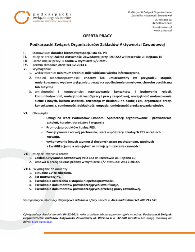 Podkarpacki Związek Organizatorów Zakładów Aktywności Zawodowej ul. Wilsona 6a 37-500 Jarosław [email protected] www.pzozaz.pl OFERTA PRACY Podkarpacki Związek Organizatorów Zakładów Aktywności Zawodowej I. II. III. IV. V. Stanowisko: doradca biznesowy/specjalista ds. PR Miejsce pracy: Zakład Aktywności Zawodowej przy PZO ZAZ w Rzeszowie ul. Rejtana 10 Liczba miejsc pracy: 1 osoba w wymiarze 5/7 etatu Termin składania ofert: 04-12-2014 r. Wymagania: 1. wykształcenie: minimum średnie; mile widziana wiedza informatyczna, 2. Stopień niepełnosprawności: znaczny lub umiarkowany (w przypadku stopnia umiarkowanego wydany wyłącznie z uwagi na upośledzenie umysłowe, chorobę psychiczną lub autyzm) 3. umiejętności i kompetencje: nawiązywanie kontaktów i budowanie relacji, komunikatywność, umiejętność współpracy i pracy zespołowej, umiejętność motywowania siebie i innych, kultura osobista, orientacja w działaniu na osobę i cel, organizacja pracy, konsekwencja, sumienność, dokładność, empatia, umiejętność przekazywania wiedzy. VI. Obowiązki: Usługi na rzecz Podmiotów Ekonomii Społecznej: organizowanie i prowadzenie szkoleń, kursów, doradztwa i wsparcia Promocja produktów i usług PES, Zawiązywanie i rozwój partnerstw, sieci współpracy lokalnych PES w celu ich rozwoju, wykonywanie innych czynności zleconych przez przełożonego, zgodnych z kwalifikacjami, a nie ujętych w niniejszym zakresie czynności. VII. Miejsce i warunki pracy: 1. Zakład Aktywności Zawodowej PZO ZAZ w Rzeszowie ul. Rejtana 10, 2. umowa o pracę na czas próbny w wymiarze 5/7 etatu od: 29.12.2014r. VIII. 1. 2. 3. 4. 5. Wymagane dokumenty: aktualne CV ze zdjęciem, list motywacyjny, kserokopia orzeczenia o stopniu niepełnosprawności, kserokopie dokumentów poświadczających kwalifikacje, kserokopie dokumentów poświadczających przebieg pracy zawodowej. Szczegółowych informacji dotyczących składania oferty udziela p. Aleksandra Kisiel tel. 600 715 081 Oferty należy składać do dnia 04-12-2014. roku osobiście lub korespondencyjnie na adres: Podkarpacki Związek Organizatorów Zakładów Aktywności Zawodowej ul. Wilsona 6 a 37-500 Jarosław lub drogą mailową na adres: [email protected]
