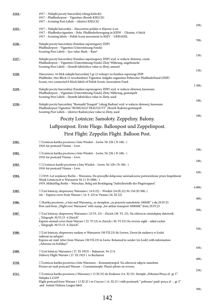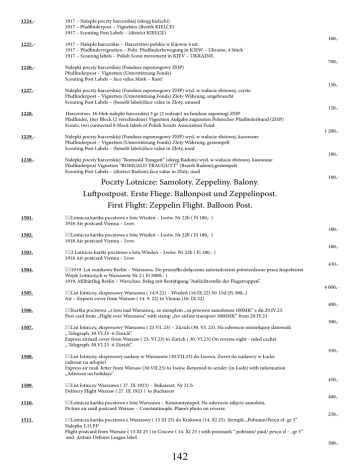 1224.– 1917 – Nalepki poczty harcerskiej (okręg kielecki) 1917 – Pfadfinderpost – Vignetten (Bezirk KIELCE) 1917 – Scouting Post Labels – (district KIELCE) 1225.– 1917 – Nalepki harcerskie – Harcerstwo polskie w Kijowie 4 szt. 1917 – Pfadfindervignetten – Poln. Pfadfinderbewegung in KIEW – Ukraine, 4 Stück 1917 – Scouting labels – Polish Scout movement in KIEV – UKRAINE. 1226.– Nalepki poczty harcerskiej (Fundusz zapomogowy ZHP) Pfadfinderpost – Vignetten (Unterstützung Fonds) Scouting Post Labels – face value Mark – Rare! 1227.– Nalepki poczty harcerskiej (Fundusz zapomogowy ZHP) wyd. w walucie złotowej, czyste Pfadfinderpost – Vignetten (Unterstützung Fonds) Zloty Währung, ungebraucht Scouting Post Labels – (benefit labels)face value in Zloty, unused 1228. Harcerstwo. 16-blok nalepki harcerskiej 5 gr (2 rodzaje) na fundusz zapomogi ZHP. Pfadfinder, 16er Block (2 verschiedene) Vignetten Aufgabe zugunsten Polnischer Pfadfinderbund (ZHP) Scouts, two connected 8-block labels of Polish Scouts Association Fund. 1229.– Nalepki poczty harcerskiej (Fundusz zapomogowy ZHP) wyd. w walucie złotowej, kasowane Pfadfinderpost – Vignetten (Unterstützung Fonds) Zloty Währung, gestempelt Scouting Post Labels – (benefit labels)face value in Zloty, used 1230.– Nalepki poczty harcerskiej ”Romuald Traugutt” (okręg Radom) wyd. w walucie złotowej, kasowane Pfadfinderpost Vignetten “ROMUALD TRAUGUTT“ (Bezirk Radom),gestempelt Scouting Post Labels – (district Radom),face value in Zloty, used 100,- 700,- 150,- 120,- 1 200,- 180,- Poczty Lotnicze: Samoloty. Zeppeliny. Balony. Luftpostpost. Erste Fliege. Ballonpost und Zeppelinpost. First Flight: Zeppelin Flight. Balloon Post. 1501. Lotnicza kartka pocztowa z lotu Wiedeń – Lwów. Nr 22b ( Fi 180,- ) 1918 Air postcard Vienna – Lvov. 1502. Lotnicza kartka pocztowa z lotu Wiedeń – Lwów. Nr 22b ( Fi 180,- ) 1918 Air postcard Vienna – Lvov. 1503. 2 Lotnicze kartki pocztowe z lotu Wiedeń – Lwów. Nr 22b ( Fi 180,- ) 1918 Air postcard Vienna – Lvov. 1504. 1919. Lot wojskowy Berlin – Warszawa. Do przesyłki dołączone zaświadczenie potwierdzone przez Inspektorat Wojsk Lotniczych w Warszawie Nr 2 ( Fi 5000,- ) 1919, Militärflug Berlin – Warschau. Beleg mit Bestätigung “Aufsichtsstelle der Flugstruppen”. 1505. List lotniczy, ekspresowy Warszawa ( 14.9.22) – Wiedeń (16.IX.22) Nr 15d (Fi 500,-) Air – Express cover from Warsaw ( 14. 9. 22) to Vienna (16. IX 22) 1506. Kartka pocztowa „z lotu nad Warszawą„ ze stemplem „za przewóz samolotem 100MK” z dn.29.IV.23. Post card from „Flight over Warszawa” with stamp „for airline transport 1000MK” from 29.IV.23 1507. List lotniczy, ekspresowy Warszawa ( 23.VI. 23) – Zürich (30. VI. 23). Na odwrocie ośmiokątny datownik „ Telegraph-30.VI.23 -6 Zürich”. Express airmail cover from Warsaw ( 23. VI 23) to Zurich ( 30. VI 23) On reverse eight - sided cachet „ Telegraph-30.VI.23 -6 Zürich”. 1508. List lotniczy, ekspresowy nadany w Warszawie (30.VII.23) do Lwowa. Zwrot do nadawcy w Łodzi (adresat na urlopie) Express air mail letter from Warsaw (30.VII.23) to Lwów. Returned to sender (in Łodż) with information „Adressee on holidays” 1509. List lotniczy Warszawa ( 27. IX 1923) – Bukareszt. Nr 21 b Delivery Flight Warsaw ( 27. IX 1923 ) to Bucharest 1510. Lotnicza kartka pocztowa z lotu Warszawa – Konstantynopol. Na odwrocie zdjęcie samolotu. Picture air mail postcard Warsaw – Constantinople. Plane’s photo on reverse. 1511. Lotnicza kartka pocztowa z Warszawy ( 13 XI 25) do Krakowa (14. XI 25). Stemple „Pobrano/Perçu zł- gr 5”. Nalepka L.O.P.P Flight postcard from Warsaw ( 13 XI 25 ) to Cracow ( 14. XI 25 ) with postmark “ pobrano/ paid/ perçu zl - , gr 5” and Antiair Defense League label. 180,- 180,- 180,- 430,- 4 000,- 400,- 300,- 350,- 450,- 400,- 250,- 300,- 142
