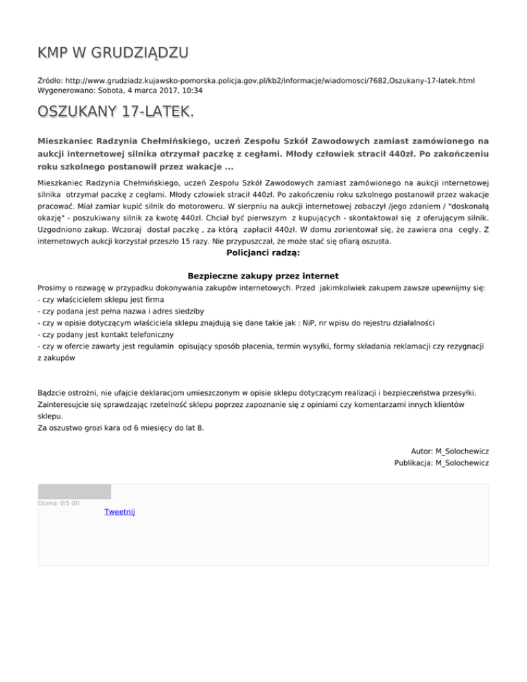 KMP W GRUDZIĄDZU Źródło: http://www.grudziadz.kujawsko-pomorska.policja.gov.pl/kb2/informacje/wiadomosci/7682,Oszukany-17-latek.html Wygenerowano: Sobota, 4 marca 2017, 10:34 OSZUKANY 17-LATEK. Mieszkaniec Radzynia Chełmińskiego, uczeń Zespołu Szkół Zawodowych zamiast zamówionego na aukcji internetowej silnika otrzymał paczkę z cegłami. Młody człowiek stracił 440zł. Po zakończeniu roku szkolnego postanowił przez wakacje ... Mieszkaniec Radzynia Chełmińskiego, uczeń Zespołu Szkół Zawodowych zamiast zamówionego na aukcji internetowej silnika otrzymał paczkę z cegłami. Młody człowiek stracił 440zł. Po zakończeniu roku szkolnego postanowił przez wakacje pracować. Miał zamiar kupić silnik do motoroweru. W sierpniu na aukcji internetowej zobaczył /jego zdaniem / "doskonałą okazję" - poszukiwany silnik za kwotę 440zł. Chciał być pierwszym z kupujących - skontaktował się z oferującym silnik. Uzgodniono zakup. Wczoraj dostał paczkę , za którą zapłacił 440zł. W domu zorientował się, że zawiera ona cegły. Z internetowych aukcji korzystał przeszło 15 razy. Nie przypuszczał, że może stać się ofiarą oszusta. Policjanci radzą: Bezpieczne zakupy przez internet Prosimy o rozwagę w przypadku dokonywania zakupów internetowych. Przed jakimkolwiek zakupem zawsze upewnijmy się: - czy właścicielem sklepu jest firma - czy podana jest pełna nazwa i adres siedziby - czy w opisie dotyczącym właściciela sklepu znajdują się dane takie jak : NiP, nr wpisu do rejestru działalności - czy podany jest kontakt telefoniczny - czy w ofercie zawarty jest regulamin opisujący sposób płacenia, termin wysyłki, formy składania reklamacji czy rezygnacji z zakupów Bądzcie ostrożni, nie ufajcie deklaracjom umieszczonym w opisie sklepu dotyczącym realizacji i bezpieczeństwa przesyłki. Zainteresujcie się sprawdzając rzetelność sklepu poprzez zapoznanie się z opiniami czy komentarzami innych klientów sklepu. Za oszustwo grozi kara od 6 miesięcy do lat 8. Autor: M_Solochewicz Publikacja: M_Solochewicz Ocena: 0/5 (0) Tweetnij