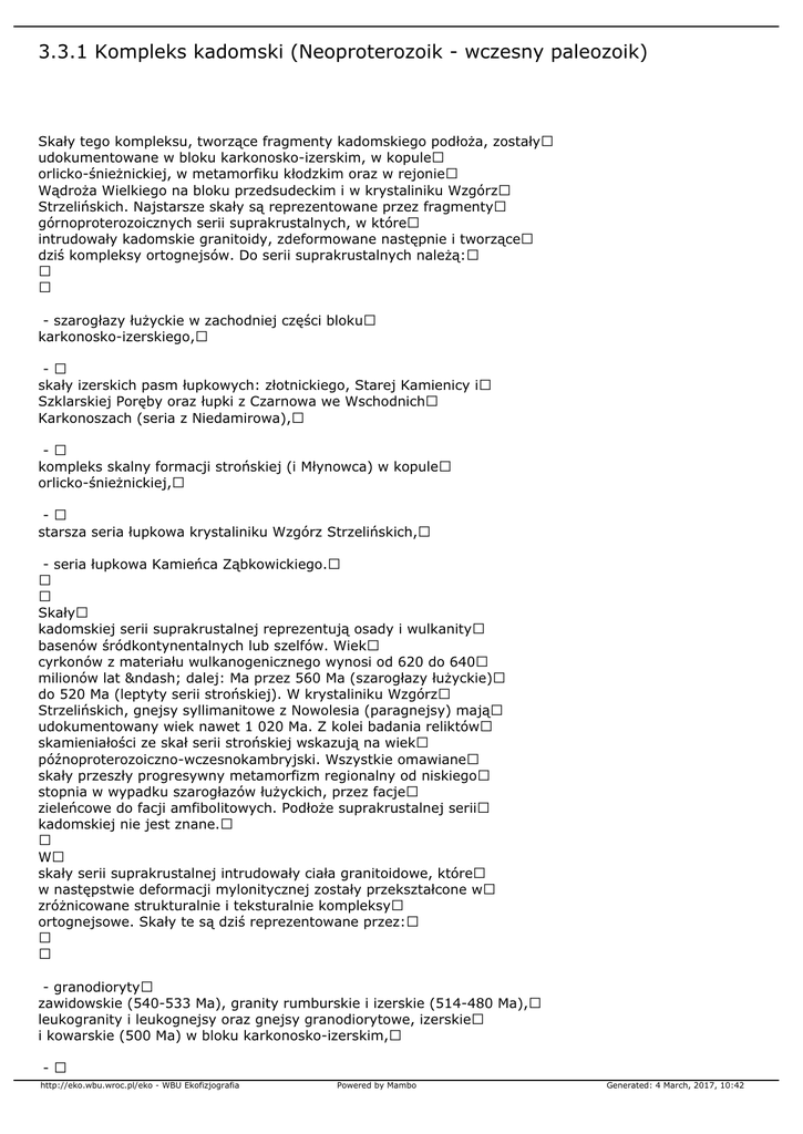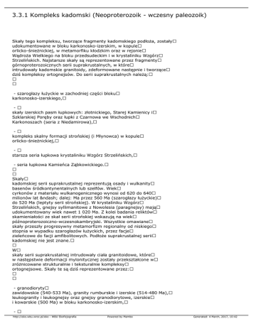 3.3.1 Kompleks kadomski (Neoproterozoik - wczesny paleozoik) Skały tego kompleksu, tworzące fragmenty kadomskiego podłoża, zostały udokumentowane w bloku karkonosko-izerskim, w kopule orlicko-śnieżnickiej, w metamorfiku kłodzkim oraz w rejonie Wądroża Wielkiego na bloku przedsudeckim i w krystaliniku Wzgórz Strzelińskich. Najstarsze skały są reprezentowane przez fragmenty górnoproterozoicznych serii suprakrustalnych, w które intrudowały kadomskie granitoidy, zdeformowane następnie i tworzące dziś kompleksy ortognejsów. Do serii suprakrustalnych należą: - szarogłazy łużyckie w zachodniej części bloku karkonosko-izerskiego, - skały izerskich pasm łupkowych: złotnickiego, Starej Kamienicy i Szklarskiej Poręby oraz łupki z Czarnowa we Wschodnich Karkonoszach (seria z Niedamirowa), - kompleks skalny formacji strońskiej (i Młynowca) w kopule orlicko-śnieżnickiej, - starsza seria łupkowa krystaliniku Wzgórz Strzelińskich, - seria łupkowa Kamieńca Ząbkowickiego. Skały kadomskiej serii suprakrustalnej reprezentują osady i wulkanity basenów śródkontynentalnych lub szelfów. Wiek cyrkonów z materiału wulkanogenicznego wynosi od 620 do 640 milionów lat – dalej: Ma przez 560 Ma (szarogłazy łużyckie) do 520 Ma (leptyty serii strońskiej). W krystaliniku Wzgórz Strzelińskich, gnejsy syllimanitowe z Nowolesia (paragnejsy) mają udokumentowany wiek nawet 1 020 Ma. Z kolei badania reliktów skamieniałości ze skał serii strońskiej wskazują na wiek późnoproterozoiczno-wczesnokambryjski. Wszystkie omawiane skały przeszły progresywny metamorfizm regionalny od niskiego stopnia w wypadku szarogłazów łużyckich, przez facje zieleńcowe do facji amfibolitowych. Podłoże suprakrustalnej serii kadomskiej nie jest znane. W skały serii suprakrustalnej intrudowały ciała granitoidowe, które w następstwie deformacji mylonitycznej zostały przekształcone w zróżnicowane strukturalnie i teksturalnie kompleksy ortognejsowe. Skały te są dziś reprezentowane przez: - granodioryty zawidowskie (540-533 Ma), granity rumburskie i izerskie (514-480 Ma), leukogranity i leukognejsy oraz gnejsy granodiorytowe, izerskie i kowarskie (500 Ma) w bloku karkonosko-izerskim, - http://eko.wbu.wroc.pl/eko - WBU Ekofizjografia Powered by Mambo Generated: 4 March, 2017, 10:42 gnejsy Wądroża Wielkiego (548 Ma) występujące na bloku przedsudeckim wśród skał kompleksu kaczawskiego, - ortognejsy i gnejsy jednostki Orlej – Gołogłów (500-590 Ma) w SW części metamorfiku kłodzkiego, - ortognejsy śnieżnickie i bystrzyckie oraz migmatyczne gnejsy gierałtowskie (488-522 Ma) w skałach kopuły orlicko-śnieżnickiej, - gnejsy strzelińskie (568 - 600 Ma) w krystaliniku Wzgórz Strzelińskich. Dotychczasowe dane na temat ewolucji tektono-metamorficznej tych skał nie zawsze pozwalają na stwierdzenie wieku zgnejsowania. Dane radiometryczne dotyczące gnejsów gierałtowskich i śnieżnickich (Rb-Sr, U-Pb), sugerują metamorfizm tych skał o wieku około 340 Ma. http://eko.wbu.wroc.pl/eko - WBU Ekofizjografia Powered by Mambo Generated: 4 March, 2017, 10:42