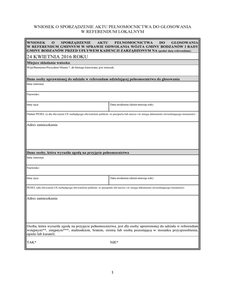 WNIOSEK O SPORZĄDZENIE AKTU PEŁNOMOCNICTWA DO GŁOSOWANIA W REFERENDUM LOKALNYM WNIOSEK O SPORZĄDZENIE AKTU PEŁNOMOCNICTWA DO GŁOSOWANIA W REFERENDUM GMINNYM W SPRAWIE ODWOŁANIA WÓJTA GMINY BODZANÓW I RADY GMINY BODZANÓW PRZED UPŁYWEM KADENCJI ZARZĄDZONYM NA (podać datę referendum): 24 KWIETNIA 2016 ROKU Miejsce składania wniosku Wójt/Burmistrz/Prezydent Miasta *, do którego kierowany jest wniosek: Dane osoby uprawnionej do udziału w referendum udzielającej pełnomocnictwa do głosowania Imię (imiona): Nazwisko: Imię ojca: Data urodzenia (dzień-miesiąc-rok): Numer PESEL (a dla obywatela UE niebędącego obywatelem polskim- nr paszportu lub nazwa i nr innego dokumentu stwierdzającego tożsamość) : Adres zamieszkania: Dane osoby, która wyraziła zgodą na przyjęcie pełnomocnictwa Imię (imiona): Nazwisko: Imię ojca: Data urodzenia (dzień-miesiąc-rok): PESEL (dla obywatela UE niebędącego obywatelem polskim- nr paszportu lub nazwa i nr innego dokumentu stwierdzającego tożsamość): Adres zamieszkania: Osoba, która wyraziła zgodę na przyjęcie pełnomocnictwa, jest dla osoby uprawnionej do udziału w referendum wstępnym**, zstępnym***, małżonkiem, bratem, siostrą lub osobą pozostającą w stosunku przysposobienia, opieki lub kurateli: TAK* NIE* 1 Do wniosku załączono: 1. 2. 3. pisemną zgodę osoby, która wyraziła zgodę na przyjęcie pełnomocnictwa; kopię aktualnego orzeczenia właściwego organu orzekającego o ustaleniu stopnia niepełnosprawności osoby uprawnionej do udziału w referendum (nie dotyczy wyborców, którzy najpóźniej w dniu głosowania kończą 75 lat); kopię dokumentu potwierdzającego pozostawanie wyborcy z osobą, która wyraziła zgodę na przyjęcie pełnomocnictwa, w stosunku przysposobienia/opieki/kurateli* (załącza się wyłącznie w przypadku, gdy taki stosunek istnieje); Miejsce sporządzenia aktu pełnomocnictwa do głosowania (wypełnić jedynie w przypadku, gdy ma być ono inne niż miejsce zamieszkania osoby uprawnionej do udziału w referendum udzielającej pełnomocnictwa do głosowania): Oświadczenia Oświadczam, że wszystkie dane zawarte we wniosku są zgodne z prawdą. Osoba uprawniona do udziału w referendum wyraża zgodę na to, by w postępowaniu w sprawie sporządzenia aktu pełnomocnictwa do głosowania był reprezentowany przez osobę, która wyraziła zgodę na przyjęcie pełnomocnictwa: TAK NIE* Osoba uprawniona do udziału w referendum nie może lub nie umie złożyć podpisu: TAK NIE* Data wypełnienia (dzień-miesiąc-rok); - - Podpis osoby uprawnionej do udziału w referendum (w przypadku, gdy osoba uprawniona do udziału w referendum nie może lub nie umie złożyć podpisu, w tym miejscu podpis składa osoba, która wyraziła zgodę na przyjęcie pełnomocnictwa): ---------------------------------------------------------------------- Pouczenie W przypadku udzielenia pełnomocnictwa do głosowania przez obywatela UE niebędącego obywatelem polskim, pełnomocnictwo nie obejmuje referendum powiatowego i wojewódzkiego. Adnotacje urzędowe Numer wniosku: Uwagi: Podpis przyjmującego wniosek: ---------------------------------------------------------------------* Niepotrzebne skreślić ** Wstępnym jest ojciec, matka, dziadek, babka itd. *** Zstępnym jest syn, córka, wnuk, wnuczka itd. 2 ZGODA NA PRZYJĘCIE PEŁNOMOCNICTWA DO GŁOSOWANIA W REFERENDUM LOKALNYM Miejsce składania Wójt/Burmistrz/Prezydent Miasta *, do którego kierowany jest wniosek: Wyrażam zgodę na przyjęcie pełnomocnictwa do głosowania w referendum gminnym w sprawie odwołania Wójta Gminy Bodzanów i Rady Gminy Bodzanów przed upływem kadencji, zarządzonym na (podać datę referendum): 24 kwietnia 2016 roku Dane osoby, która wyraziła zgodę na przyjęcie pełnomocnictwa Imię (imiona): Nazwisko: Imię ojca: Data urodzenia (dzień-miesiąc-rok): Numer PESEL (a dla obywatela UE niebędącego obywatelem polskim- nr paszportu lub nazwa i nr innego dokumentu stwierdzającego tożsamość): Adres zamieszkania: Osoba, która wyraziła zgodę na przyjęcie pełnomocnictwa, jest dla osoby uprawnionej do udziału w referendum wstępnym**, zstępnym***, małżonkiem, bratem, siostrą lub osobą pozostającą w stosunku przysposobienia, opieki lub kurateli: TAK* NIE* Dane osoby uprawnionej do udziału w referendum udzielającej pełnomocnictwa do głosowania Imię (imiona): Nazwisko: Imię ojca: Data urodzenia (dzień-miesiąc-rok): Numer PESEL (a dla obywatela UE niebędącego obywatelem polskim- nr paszportu lub nazwa i nr innego dokumentu stwierdzającego tożsamość): Adres zamieszkania: 3 Oświadczenia i wnioski: Proszę o pozostawienie aktu pełnomocnictwa do głosowania do odbioru w urzędzie gminy/doręczenie na wskazany poniżej adres*: Informuję, że wyraziłam/wyraziłem* zgodę na przyjęcie pełnomocnictwa do głosowania od (należy podać imię i nazwisko, numer PESEL a dla obywatela UE niebędącego obywatelem polskim - nr paszportu lub nazwę i nr innego dokumentu stwierdzającego tożsamość oraz adres zamieszkania osoby uprawnionej do udziału w referendum): Oświadczam, że wszystkie dane powyższe są zgodne z prawdą. Data wypełnienia (dzień-miesiąc-rok); - - Podpis osoby, która wyraziła zgodę na przyjęcie pełnomocnictwa: ---------------------------------------------------------------------- Pouczenie W przypadku udzielenia pełnomocnictwa do głosowania przez obywatela UE niebędącego obywatelem polskim, pełnomocnictwo nie obejmuje referendum powiatowego i wojewódzkiego. Adnotacje urzędowe Uwagi: Podpis przyjmującego wniosek: ---------------------------------------------------------------------* Niepotrzebne skreślić ** Wstępnym jest ojciec, matka, dziadek, babka itd. *** Zstępnym jest syn, córka, wnuk, wnuczka itd. 4
