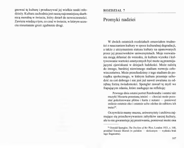 gnować tę kulturę i przekazywać jej wielkie nauki mło dzieży. Kultura zachodnia jest naszą najcenniejszą skarb nicą moralną w świecie, który dotarł do nowoczesności. Zawiera wiedzą o tym, co czuć w świecie, w którym uczu ciu nieustannie grozi zgubienie drogi. R O Z D Z IA Ł 7 Promyki nadziei W dwóch ostatnich rozdziałach omawiałem trudno ści z nauczaniem kultury w epoce kulturalnej degradacji, a także z utrzymaniem statusu kultury na opanowanych przez jej przeciwników uniwersytetach. Moje rozważa nia mogą skłaniać do wniosku, że kultura wysoka i kul tywowanie wartości estetycznych być może są przemija jącymi zjawiskami w dziejach ludzkości. Może należą do innego, bardziej niewinnego stadium rozwoju czło wieczeństwa. Może przechodzimy z tego stadium do po rządku społecznego, w którym kultura przestaje ucho dzić za coś dobrego i nie jest już nawet uważana za od rębną formę świadomości. Spengler zawarł tę myśl we frapującym zdaniu, które zasługuje na refleksję: Pewnego dnia ostatni portret Rembrandta i ostatni takt muzyki Mozarta przestaną istnieć — chociaż może pozo stać pokolorowane płótno i karta z nutami — ponieważ zniknie ostatnie oko i ostatnie ucho zdolne do odbioru ich treści36. Oczywiście mamy muzea, uniwersytety i archiwa zaj mujące się przechowywaniem zabytków naszej kultury, ale to nie gwarantuje jej przetrwania, ponieważ może ona 36 Oswald Spengler, The Decline o f the West, London 1921, s. 168, przekład Tomasz Bieroń (w polskim — skróconym — wydaniu brak tego fragmentu). 107 przetrwać tylko w nas, widzach i użytkownikach wszyst kich tych rzeczy. A jeśli relikty nie mają na nas wpływu, to co pozostaje z ich sensu? Czy nie powinniśmy ich po równać do ofiar wotywnych jakiejś martwej religii, któ rej wyznawcy zniknęli i której artefakty zbierają kurz w jakichś nieodwiedzanych piwnicach? Nie są to pytania retoryczne czy akademickie. Naj więksi artyści dwudziestowieczni raz po raz do nich po wracali, nie udzielając odpowiedzi, lecz niuansując py tania, aż stały się częścią klimatu intelektualnego. Mann, Schónberg, Eliot, Auden, Gide, Camus — oni i wielu in nych tak bardzo oswoiło nas z doświadczeniem rozkładu kultury, że zrodziło się powszechne podejrzenie, iż sztu ka współczesna jest bardziej znakiem zapytania niż fak tem. Czy sztuka może istnieć w epoce, w której zanikły tradycje smaku, kiedy oczy i uszy są nieustannie bom bardowane bodźcami, kiedy ludzkie życie jest wprawio ne w tak szybki ruch, że chwile kontemplacji prawie nie istnieją? Czy nie jesteśmy pogrobowcami kultury wyso kiej, a zresztą czy nie straciliśmy wiary w kulturę, ponie waż nie stanęła na przeszkodzie zbrodni? W odpowiedzi pragnę wskazać na pewne promyki nadziei: wydarzenia, ruchy, ludzi, którzy obcują z kultu rą zachodnią w duchu afirmacji. To, co powiem, ze swej natury będzie miało charakter przyczynkarski. Zachęcam czytelników, aby rozejrzeli się wokół siebie za przykła dami nadziei i wybitnych dzieł, jeśli tak jak ja chcą mieć swój wkład w utrwalenie naszego dziedzictwa. Spuścizna judeochrześcijańska W tle wszystkich dzieł sztuki i myśli zachodniej kry je się dziedzictwo judeochrześcijańskiego monoteizmu 108 i duch dociekliwości, który musiał doprowadzić do za kwestionowania sensu tego dziedzictwa. Błędem byłoby założenie, że filozofia akademicka wciąż należy do tra dycji myślenia opartego na wierze i zainspirowanego wia rą, ale w Kościołach, zwłaszcza w rzymskokatolickim, tradycja ta przeżywa okres wyraźnego ożywienia; Jan Paweł II zrozumiałym i dobitnym językiem przekazywał idee filozoficzne szerokiej publiczności. Jego wyzwanie zostało podjęte zarówno w samym Kościele, jak i na uni wersytetach i w społeczeństwie. Ruchy młodzieżowe ta kie jak założony we Włoszech przez ojca Giussaniego (Communione e Liberazione) i nurty filozoficzne zwią zane z takimi osobami jak Rene Girard we Francji, Jan Patoćka w Europie Środkowej, Czesław Miłosz w Pol sce i Aleksander Sołżenicyn w Rosji nadały nowego im petu idei zachodniej kultury i zainspirowały wielu przed stawicieli młodszego pokolenia do szukania metod jej obrony. W mrocznych czasach komunizmu w powojen nej Europie kultura w nie mniejszym stopniu niż religia podtrzymywała nadzieje i wartości młodych ludzi i po śród powszechnego zepsucia przechowała dla nich „wie dzę o tym, co czuć”, którą komuniści pragnęli unicestwić. Dzieło takich ludzi jak Kundera, Havel i Klima w Cze chach świadczy o sile tego dziedzictwa filozoficznego, które dla nich nie było oparte na religii, lecz wyłącznie na ideale cywilizacji zachodniej i „trosce o duszę”, w któ rej Platon widział zadanie polis. Interesujący w tym odrodzeniu się teologicznego i fi lozoficznego myślenia jest fakt, że na ogół następuje ono poza uniwersytetami. W krajach komunistycznych uni wersytety były narzędziem partyjnej indoktrynacji dła wiącymi wszelkie dociekania intelektualne, toteż trans 109 misja kultury odbywała się w „podziemnych” uniwersy tetach w prywatnych mieszkaniach, których historia zo stała opowiedziana przez Barbarę Day i innych37. Rów nież w wolnych krajach Europy i Ameryki Północnej z a a n g a ż o w a n e m y ś l e n i e przeniosło się z uni wersytetów do prywatnych instytutów badawczych, krę gów literackich i małych czasopism — takich jak „PN Review”, który od ćwierćwiecza utrzymuje przy życiu ducha poezji w Wielkiej Brytanii, jak „New Criterion”, dzięki któremu przetrwał duch amerykańskiej krytyki, i jak „The New Republic”, magazyn przejawiający szcze rą wiarę w kulturę jako forum debaty, na którym lewico wy intelektualista jest równie zaangażowany jak jego konserwatywny przeciwnik. Tradycje artystyczne i umy słowe naszej kultury żyją na przykład w powieściach lana McEwana i Michela Ho