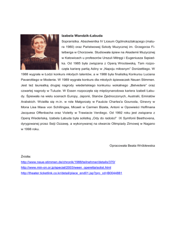 Izabela Wandzik-Łabuda Sopranistka. Absolwentka IV Liceum Ogólnokształcącego (matura 1980) oraz Państwowej Szkoły Muzycznej im. Grzegorza Fitelberga w Chorzowie. Studiowała śpiew na Akademii Muzycznej w Katowicach u profesorów Urszuli Mitręgi i Eugeniusza Sąsiadka. Od 1985 była związana z Operą Wrocławską. Tam rozpoczęła karierę partią Adiny w „Napoju miłosnym” Donizettiego. W 1988 wygrała w Łodzi konkurs młodych talentów, a w 1988 była finalistką Konkursu Luciana Pavarottiego w Modenie. W 1989 wygrała konkurs dla młodych śpiewaczek Neuen Stimmen. Jest też laureatką drugiej nagrody wiedeńskiego konkursu wokalnego „Belvedere” oraz czwartej nagrody w Tuluzie. W Essen rozpoczęła się międzynarodowa kariera Izabeli Łabudy. Śpiewała na wielu scenach Europy, Japonii, Stanów Zjednoczonych, Australii, Emiratów Arabskich. Wcieliła się m.in. w role Małgorzaty w Fauście Charles'a Gounoda, Ginevry w Mona Lisa Maxa von Schillingsa, Micaeli w Carmen Bizeta, Antoni w Opowieści Hoffmana Jacquesa Offenbacha oraz Violetty w Trawiacie Verdiego. Od 1992 roku jest związana z Operą Wiedeńską. Izabela Łabuda była solistką „Ody do radości" IX Symfonii Beethovena, dyrygowanej przez Seiji Ozzawę, a wykonywanej na otwarcie Olimpiady Zimowej w Nagano w 1998 roku. Opracowała Beata Wróblewska Źródła: http://www.neue-stimmen.de/chronik/1988/teilnehmer/details/370/ http://www.min-on.or.jp/special/2003/ween_operetta/solist.html http://theater.ticketlink.co.kr/detail/place_end01.jsp?pro_cd=B0044881