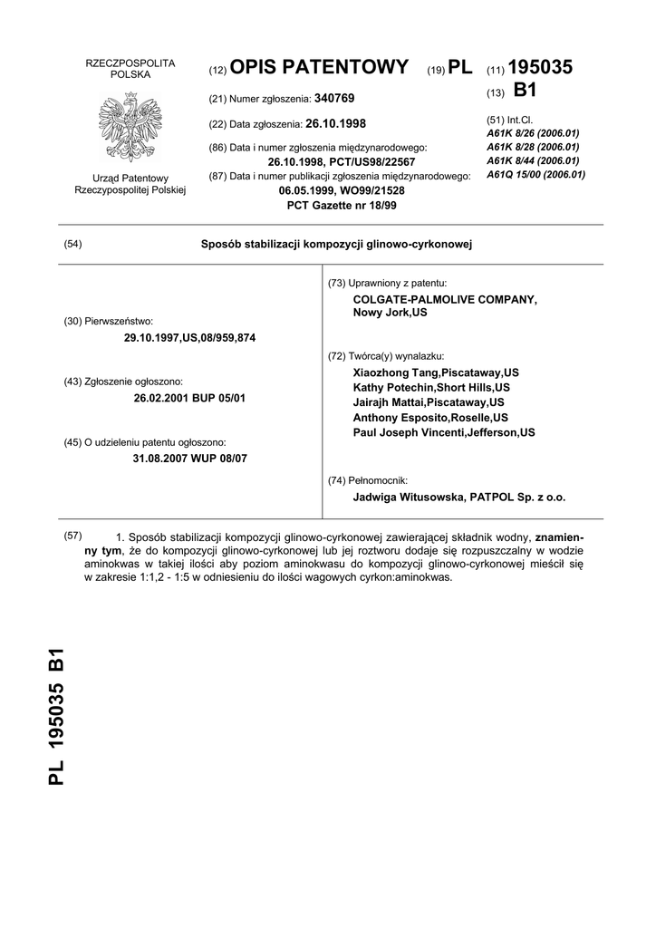 do stabilizowanej glinowo-cyrkonowej kompozycji lub do roztworu wodnego wytworzonego ze stabilizowanej glinowo-cyrkonowej kompozycji.