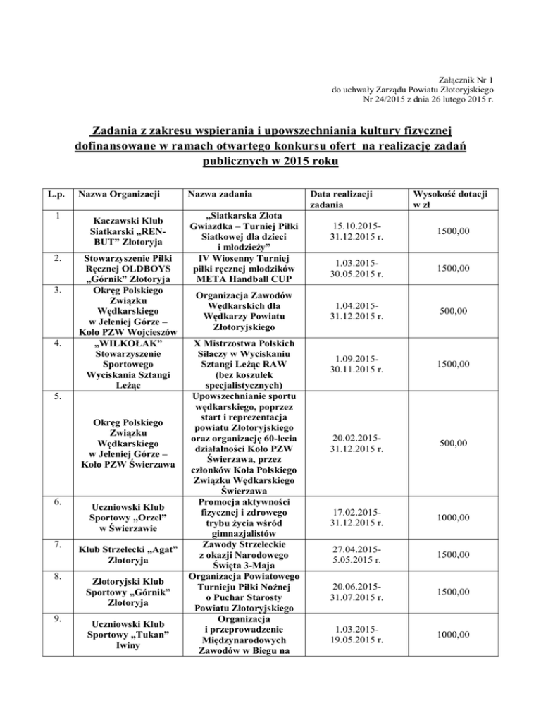 Załącznik Nr 1 do uchwały Zarządu Powiatu Złotoryjskiego Nr 24/2015 z dnia 26 lutego 2015 r. Zadania z zakresu wspierania i upowszechniania kultury fizycznej dofinansowane w ramach otwartego konkursu ofert na realizację zadań publicznych w 2015 roku L.p. 1 2. 3. 4. Nazwa Organizacji Kaczawski Klub Siatkarski „RENBUT” Złotoryja Stowarzyszenie Piłki Ręcznej OLDBOYS „Górnik” Złotoryja Okręg Polskiego Związku Wędkarskiego w Jeleniej Górze – Koło PZW Wojcieszów „WILKOŁAK” Stowarzyszenie Sportowego Wyciskania Sztangi Leżąc 5. Okręg Polskiego Związku Wędkarskiego w Jeleniej Górze – Koło PZW Świerzawa 6. 7. 8. 9. Uczniowski Klub Sportowy „Orzeł” w Świerzawie Klub Strzelecki „Agat” Złotoryja Złotoryjski Klub Sportowy „Górnik” Złotoryja Uczniowski Klub Sportowy „Tukan” Iwiny Nazwa zadania „Siatkarska Złota Gwiazdka – Turniej Piłki Siatkowej dla dzieci i młodzieży” IV Wiosenny Turniej piłki ręcznej młodzików META Handball CUP Organizacja Zawodów Wędkarskich dla Wędkarzy Powiatu Złotoryjskiego X Mistrzostwa Polskich Siłaczy w Wyciskaniu Sztangi Leżąc RAW (bez koszulek specjalistycznych) Upowszechnianie sportu wędkarskiego, poprzez start i reprezentacja powiatu Złotoryjskiego oraz organizację 60-lecia działalności Koło PZW Świerzawa, przez członków Koła Polskiego Związku Wędkarskiego Świerzawa Promocja aktywności fizycznej i zdrowego trybu życia wśród gimnazjalistów Zawody Strzeleckie z okazji Narodowego Święta 3-Maja Organizacja Powiatowego Turnieju Piłki Nożnej o Puchar Starosty Powiatu Złotoryjskiego Organizacja i przeprowadzenie Międzynarodowych Zawodów w Biegu na Data realizacji zadania Wysokość dotacji w zł 15.10.201531.12.2015 r. 1500,00 1.03.201530.05.2015 r. 1500,00 1.04.201531.12.2015 r. 500,00 1.09.201530.11.2015 r. 1500,00 20.02.201531.12.2015 r. 500,00 17.02.201531.12.2015 r. 1000,00 27.04.20155.05.2015 r. 1500,00 20.06.201531.07.2015 r. 1500,00 1.03.201519.05.2015 r. 1000,00 Orientację Tajemnice Dolnego Śląska – Złoto – Srebro – Miedź 10. 11. Stowarzyszenie Sportowe „OLAWS Złotoryja” Towarzystwo Przyjaciół Dzieci Oddział Okręgowy w Legnicy 12. Klub Piłki Halowej „Lider” 13. Klub Żeglarski „Reda” 14. 15. 16. Stowarzyszenie Progress Złotoryjskie Towarzystwo Tenisowe Fundacja Piłka CV 17. Klub Sportowy „Pogoń” Świerzawa 18. 19. Klub Sportowy „Wilkowianka” Wilków Klub Sportowy Aurum Kobud w Złotoryi Powiatowa Akcja „Polska Biega” 1.05.201530.06.2015 r. 1000,00 XIII Paraolimpiada Dzieci i Młodzieży Niepełnosprawnej 15.08.201515.10.2015 r. 450,00 1.10.201531.12.2015 r. 1000,00 3.04.201531.07.2015 r. 500,00 15.03.201515.05.2015 r. 500,00 1.05.201530.10.2015 r. 500,00 1.03.20153.08.2015 r. 500,00 1.03.201530.06.2015 r. 500,00 1.04.201531.08.2015 r. 1000,00 1.03.201521.06.2015 r. 1500,00 Powiatowy Turniej w Halową Piłkę Nożną dla Szkół Ponadgimnazjalnych o Puchar Starosty Powiatu Złotoryjskiego „Gwiazdka” „WACHTA – 2015 r.” Powiatowy Turniej Ratowniczy i Sportów Wodnych o Błękitną Wstęgę Starosty Złotoryjskiego Cykl Czterech Weekendów I Złotoryjski turniej DARTA Organizacja cyklu czterech turniejów „Tenis 10” dla dzieci do lat 10 Piłkarska Selekcja DEICHMANN MINIMISTRZOSTWA 2015 – udział dzieci w turnieju piłki nożnej II-gi Mini Turniej o Puchar 55-lecia Wilkowianki Wilków VI Bieg Szlakiem Wygasłych Wulkanów Łącznie 17 950,00