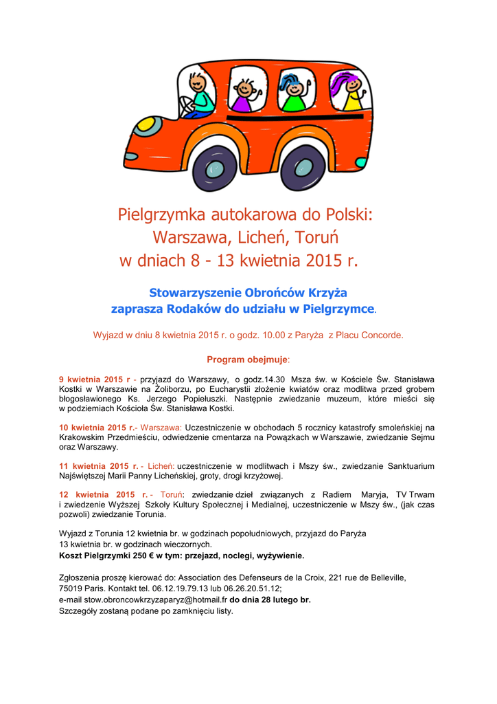 Pielgrzymka autokarowa do Polski: Warszawa, Licheń, Toruń w dniach 8 - 13 kwietnia 2015 r. Stowarzyszenie Obrońców Krzyża zaprasza Rodaków do udziału w Pielgrzymce. Wyjazd w dniu 8 kwietnia 2015 r. o godz. 10.00 z Paryża z Placu Concorde. Program obejmuje: 9 kwietnia 2015 r - przyjazd do Warszawy, o godz.14.30 Msza św. w Kościele Św. Stanisława Kostki w Warszawie na Żoliborzu, po Eucharystii złożenie kwiatów oraz modlitwa przed grobem błogosławionego Ks. Jerzego Popiełuszki. Następnie zwiedzanie muzeum, które mieści się w podziemiach Kościoła Św. Stanisława Kostki. 10 kwietnia 2015 r.- Warszawa: Uczestniczenie w obchodach 5 rocznicy katastrofy smoleńskiej na Krakowskim Przedmieściu, odwiedzenie cmentarza na Powązkach w Warszawie, zwiedzanie Sejmu oraz Warszawy. 11 kwietnia 2015 r. - Licheń: uczestniczenie w modlitwach i Mszy św., zwiedzanie Sanktuarium Najświętszej Marii Panny Licheńskiej, groty, drogi krzyżowej. 12 kwietnia 2015 r. - Toruń: zwiedzanie dzieł związanych z Radiem Maryja, TV Trwam i zwiedzenie Wyższej Szkoły Kultury Społecznej i Medialnej, uczestniczenie w Mszy św., (jak czas pozwoli) zwiedzanie Torunia. Wyjazd z Torunia 12 kwietnia br. w godzinach popołudniowych, przyjazd do Paryża 13 kwietnia br. w godzinach wieczornych. Koszt Pielgrzymki 250 € w tym: przejazd, noclegi, wyżywienie. Zgłoszenia proszę kierować do: Association des Defenseurs de la Croix, 221 rue de Belleville, 75019 Paris. Kontakt tel. 06.12.19.79.13 lub 06.26.20.51.12; e-mail [email protected] do dnia 28 lutego br. Szczegóły zostaną podane po zamknięciu listy.