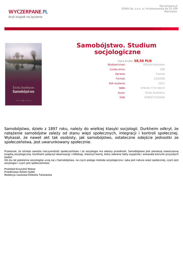 Wyczerpane.pl SOWA Sp. z o.o. ul. Hrubieszowska 6a 01-209 Warszawa Samobójstwo. Studium socjologiczne Cena brutto: Wydawnictwo: 58,50 PLN Oficyna Naukowa Liczba stron: 508 Oprawa: Twarda Format: 103x208 Rok wydania: 2011 ISBN: 978-83-7737-004-9 Autor: Émile Durkheim EAN: 9788377370049 Samobójstwo, dzieło z 1897 roku, należy do wielkiej klasyki socjologii. Durkheim odkrył, że natężenie samobójstw zależy od stanu więzi społecznych, integracji i kontroli społecznej. Wykazał, że nawet akt tak osobisty, jak samobójstwo, ostateczne odejście jednostki ze społeczeństwa, jest uwarunkowany społecznie. Przekonał, że istnieje swoista rzeczywistość społeczeństwa i że socjologia ma własny przedmiot. Samobójstwo jest pierwszą nowoczesną książką socjologiczną: Durkheim połączył obserwację i refleksję, stworzył teorię, która zebrane fakty wyjaśniła i wskazała kierunki przyszłych badań. Od stu lat pokolenia socjologów uczą się z Samobójstwa, na czym polega metoda socjologiczna i jaka jest natura więzi społecznej, czym jest socjologia i czym jest społeczeństwo Przekład Krzysztof Wakar Przedmowa Antoni Sułek Redakcja naukowa Elżbieta Tarkowska
