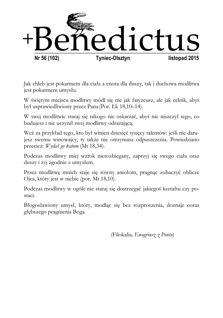 Nr 56 (102) Tyniec-Olsztyn listopad 2015 Jak chleb jest pokarmem dla ciała a cnota dla duszy, tak i duchowa modlitwa jest pokarmem umysłu. W świętym miejscu modlitwy módl się nie jak faryzeusz, ale jak celnik, abyś był usprawiedliwiony przez Pana (Por. Łk 18,10–14). W swej modlitwie staraj się nikogo nie oskarżać, abyś nie niszczył tego, co budujesz i nie uczynił swej modlitwy odrażającą. Weź za przykład tego, kto był winien dziesięć tysięcy talentów: jeśli nie darujesz swemu winowajcy, ty także nie otrzymasz odpuszczenia. Powiedziano przecież: Wydał go katom (Mt 18,34). Podczas modlitwy miej wzrok nierozbiegany, zaprzyj się swego ciała oraz duszy i żyj zgodnie z umysłem. Przez modlitwę mnich staje się równy aniołom, pragnąc zobaczyć oblicze Ojca, który jest w niebie (por. Mt 18,10). Podczas modlitwy w ogóle nie staraj się dostrzegać jakiegoś kształtu czy postaci. Błogosławiony umysł, który, modląc się bez rozproszenia, doznaje coraz głębszego pragnienia Boga. (Filokalia, Ewagriusz z Pontu) PROŚBA DO DUCHA ŚWIĘTEGO O WIERNOŚĆ Duchu Święty, Ty zawsze jesteś wierny i nie porzucasz tych, co Tobie zaufali. Wierny Ojcu i Synowi, wierny Kościołowi świętemu, wierny każdej duszy, która się Tobie powierzyła od dnia chrztu świętego. Wierny w doli i niedoli, w radości i smutku, w życiu i śmierci. Duchu wiernej miłości, obdarzaj nas wiernością, która nigdy nie zawodzi. Nie zawsze jest łatwo być wiernym. Czasem strach, czasem chciwość, czasem lekkomyślność skłaniają nas do niewierności. Umacniaj w nas wierność, wyzwalając nas od naporu samolubnych przywiązań lub lęków. Spraw, by nic nie hamowało i nie krępowało naszej wolności, która chce być wierna dobru, prawdzie, sprawiedliwości, miłosierdziu i obowiązkom, w których zawarta jest wola Boża. Usłysz nas i wysłuchaj, Duchu Święty. –2– Duchowość monastyczna CHRZEŚCIJANINIE, POZNAJ SWOJĄ GODNOŚĆ! Godność a moralna postawa człowieka Któż jest człowiekiem, co miłuje życie i pragnie widzieć dni szczęśliwe? Kto z nas jest takim człowiekiem? To pytanie może budzić zdziwienie. Przecież każdy człowiek pragnie żyć i być szczęśliwy! To, wydawałoby się, oczywiste stwierdzenie nie jest takie oczywiste. Co bowiem znaczy życie i szczęście? Kto wie, na czym one polegają? Zadane na wstępie pytanie nie jest przeze mnie wymyślone. Stawia je psalmista w Ps 34[33],13, a św. Benedykt powtarza w Prologu do Reguły (RegBen Prol 15). Dopiero pozytywna odpowiedź na nie staje się podstawą do wejścia na drogę życia. Wcześniej życie człowieka płynie pomiędzy tym, co bardziej lub mniej przyjemne. Tak czy inaczej, zarówno przyjemność, jak i jej brak, przeżywa się na poziomie doznań, które przemijają. Czym jest prawdziwe życie człowieka, czym jest nasze prawdziwe życie, pozostaje pytaniem, na które musimy sami znaleźć odpowiedź. Aby na nie odpowiedzieć, musimy wpierw zdać sobie sprawę, kim jesteśmy. Kim jesteśmy jako ludzie? Kim ja jestem? Nie są to pytania li tylko filozoficzne. Każdy z nas odpowiada na nie w swoim życiu, czy sobie z tego zdaje sprawę, czy nie. Zawsze bowiem, gdy dokonujemy wyboru, robimy to według określonej hierarchii wartości. A ta hierarchia wartości wynika z właściwego rozumienia siebie i sensu własnego życia. Jeżeli dla przykładu weźmiemy rozpowszechnione dzisiaj hasło życiowe: „W życiu liczą się tylko pieniądze”, to chociaż brzmi ono bardzo prymitywnie i nie wszyscy by się chcieli oficjalnie do niego przyznać, to w praktyce jednak wielu je przyjmuje za swoje przez konkretne wybory. Żyją tak, jak gdyby nic innego się nie liczyło. A właśnie to, co jest naszą prawdziwą filozofią życia, ukazuje się w konkretnych wyborach na co dzień. W naszych rozważaniach interesuje nas tylko ta autentyczna filozofia życia. Jeżeli praktycznie liczy się dla nas jedynie pieniądz, to jednocześnie odpowiadamy sobie na pytanie, kim jesteśmy. Przez swoje wybory mówimy: „jesteśmy konsumentami dóbr, które można nabyć za pieniądze”. Sensem naszego życia jest przyjemność konsumpcji. Z tego podstawowego rozumienia siebie i sensu –3– własnego życia wynika nasza zasadnicza postawa życiowa i sposób podejmowania decyzji. Inną filozofię życiową można wyrazić hasłem: „Liczy się tylko to, czego w życiu doświadczę, co przeżyję”. Wówczas jestem podmiotem doznań, przeżyć. Ich głębia, wielkość, oryginalność są dla mnie najważniejsze. Żyć to tyle, co doświadczać ciągle czegoś nowego, wspaniałego. Jeszcze inną filozofię można by wyrazić zdaniem: „Liczy się tylko to, co po sobie zostawię”. Wówczas jestem twórcą, którego życie polega na tworzeniu czegoś wspaniałego dla potomnych. Sensem mojego życia będzie pozostawienie po sobie jakichś szlachetnych dokonań. Jakkolwiek szlachetne byłyby te rozmaite filozofie, których można by tutaj przytoczyć wiele, to jednak stają przed nami nieuniknione pytania: czy „ja” ogranicza się do: konsumenta, podmiotu doznań, twórcy…? Czy to wszystko? Co naprawdę wiemy o sobie? Co będzie z nami w chwili śmierci? Czy jest ona ostatecznym końcem, zapadnięciem się w nicość? Jeżeli nie, to co nas po niej czeka i jaki sens ma nasze życie w kontekście tej przyszłości po śmierci? Zarówno konsumpcja, jak i doznania w tym kontekście przestają mieć jakikolwiek sens. Także nasza twórczość pozostająca na tym świecie w chwili śmierci przestaje mieć dla nas jakiekolwiek znaczenie. Miałaby sens, gdyby życie doczesne było ważniejsze od przyszłego. Ale jeżeli się ono kończy, a tamto ma trwać wiecznie, to chyba jest odwrotnie. Co zatem zostaje? Jaka jest nasza zasadnicza perspektywa? Kim jesteśmy? O naszym życiu na co dzień ostatecznie rozstrzyga nasze rozumienie siebie. Jeżeli będziemy dla siebie konsumentami, to będziemy żyli jak ko