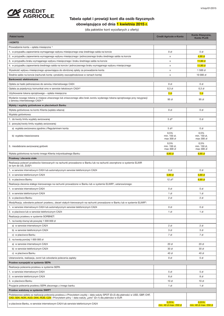 k/toip/01/2015 Tabela opłat i prowizji kont dla osób fizycznych obowiązująca od dnia 1 kwietnia 2015 r. (dla pakietów kont wycofanych z oferty) Pakiet konta Credit Agricole e-Konto Konto Klasyczne, Konto PLUS I KONTO Prowadzenie konta – opłata miesięczna 1) 1. w przypadku zapewnienia wymaganego wpływu miesięcznego oraz średniego salda na koncie 0 zł 0 zł 2. w przypadku zapewnienia wymaganego wpływu miesięcznego i jednoczesnego braku średniego salda na koncie x 4,90 zł 3. w przypadku braku wymaganego wpływu miesięcznego i braku średniego salda na koncie x 11,90 zł 4. w przypadku zapewnienia średniego salda na koncie i jednoczesnego braku wymaganego wpływu miesięcznego x 11,90 zł Wysokość wpływu miesięcznego uprawniająca do obniżonej opłaty za prowadzenie konta x 1 500 zł Średnie saldo na koncie (rachunek konta +produkty oszczędnościowe w ramach konta) x 10 000 zł Bankowość elektroniczna Opłata za hasło jednorazowe do serwisu internetowego CA24 0 zł 0 zł 0,3 zł 0,3 zł Użytkowanie tokena sprzętowego – opłata miesięczna 5 zł 5 zł Wydanie nowego tokena w miejsce utraconego lub zniszczonego albo brak zwrotu wydanego tokena sprzętowego przy rezygnacji z serwisu internetowego CA24 3) 95 zł 95 zł 0 zł 0 zł 5 zł4) 0 zł Opłata za pojedynczy komunikat sms w serwisie tekstowym CA242) Wpłaty i wypłaty gotówkowe w placówkach Banku Wpłata gotówkowa na konto Klienta (wpłata własna) Wypłata gotówkowa: 1. do kwoty limitu wypłaty awizowanej 2. powyżej kwoty limitu wypłaty awizowanej: a) wypłata awizowana zgodnie z Regulaminem konta 5 zł4) 0 zł 0,5% min. 150 zł, max 300 zł 0,5% min. 150 zł, max 300 zł 0,5% min. 150 zł, max 300 zł 0,5% min. 150 zł, max 300 zł 8,90 zł 8,90 zł 0 zł 0 zł 2. w serwisie telefonicznym CA24 5,90 zł 5,90 zł 3. w placówce Banku 12 zł4) 8,90 zł 1. w serwisie internetowym CA24 0 zł 0 zł 2. w serwisie telefonicznym CA24 1 zł 1 zł 3. w placówce Banku 2 zł 2 zł 1. w serwisie internetowym CA24 lub automatycznym serwisie telefonicznym CA24 0 zł 0 zł 2. w placówce lub w serwisie telefonicznym CA24 1 zł 1 zł a) w serwisie internetowym CA24 2 zł 2 zł b) w serwisie telefonicznym CA24 3 zł 3 zł c) w placówce Banku 7 zł 7 zł a) w serwisie internetowym CA24 20 zł 20 zł b) w serwisie telefonicznym CA24 30 zł 30 zł c) w placówce Banku 40 zł 40 zł 0 zł 0 zł 1. w serwisie internetowym CA24 5 zł 5 zł 2. w serwisie telefonicznym CA24 8 zł 8 zł 3. w placówce Banku 10 zł 10 zł Przyjęcie polecenia przelewu SEPA zleconego z innego banku 1 zł 1 zł 0,25% min. 40 zł max. 250 zł 0,25% min. 40 zł max. 250 zł b) wypłata nieawizowana 3. nieodebranie awizowanej gotówki Wpłata gotówkowa na konto innego Klienta indywidualnego Banku Przelewy i zlecenia stałe Realizacja poleceń przelewów kierowanych na rachunki prowadzone w Banku lub na rachunki zewnętrzne w systemie ELIXIR (w tym do US, ZUS)5): 1. w serwisie internetowym CA24 lub automatycznym serwisie telefonicznym CA24 Realizacja zlecenia stałego kierowanego na rachunki prowadzone w Banku lub w systemie ELIXIR5), ustanowionego: Modyfikacja, odwołanie poleceń przelewu, zleceń stałych kierowanych na rachunki prowadzone w Banku lub w systemie ELIXIR5): Realizacja przelewu w systemie SORBNET: 1. na kwotę równą lub powyżej 1 000 000 zł 2. na kwotę poniżej 1 000 000 zł Ustanowienie, realizacja, zwrot lub odwołanie polecenia zapłaty Przelew europejski w systemie SEPA Realizacja polecenia przelewu w systemie SEPA Przelew walutowy w systemie SWIFT Podstawowa opłata za realizację polecenia przelewu z Priorytetem zwykły – data waluty SPOT (D+2) dla płatności w USD, GBP, CHF, CAD, SEK, NOK, AUD, DKK, RUB, CZK i Priorytetem pilny – data waluty „jutro” (D+1) dla płatności w EUR w placówce Banku, w serwisie internetowym CA24 lub serwisie telefonicznym CA24 Credit Agricole e-Konto Konto Klasyczne, Konto PLUS Dodatkowa opłata za realizację przelewu z Priorytetem pilny – data waluty „jutro” (D+1) dla płatności w USD i GBP (nie dotyczy płatności w EUR realizowanych z Priorytetem pilny). 6) Priorytet pilny niedostępny dla płatności w CHF, CAD, SEK, NOK, AUD, DKK, RUB, CZK. 30 zł 30 zł Dodatkowa opłata za realizacja przelewu z Priorytetem ekspresowy – data waluty „dziś” (D) dla płatności w EUR i USD. Priorytet ekspresowy niedostępny dla płatności w CHF, GBP, CAD, SEK, NOK, AUD, DKK, RUB, CZK.6) 50 zł 50 zł Opcja kosztowa OUR (całość kosztów po stronie banku nadawcy i odbiorcy przelewu pokrywa nadawca) Pakiet konta 80 zł 80 zł Przyjęcie polecenia przelewu SWIFT zleconego z innego banku 5 zł 5 zł Wydanie na wniosek nadawcy przelewu kopii komunikatu SWIFT dotyczącego przekazania środków za granicę 20 zł 20 zł 1. w serwisie internetowym CA24 0 zł 0 zł 2. w placówce Banku lub w serwisie telefonicznym CA24 1 zł 1 zł Postępowanie wyjaśniające (reklamacja) na wniosek nadawcy przelewu w sprawie realizacji przelewu za granicę. Opłaty nie pobiera się, jeśli stwierdzono błędy po stronie Banku 50 zł + koszty innych banków 50 zł + koszty innych banków Poszukiwanie przelewu wysłanego za granicę na wniosek nadawcy przelewu 50 zł + koszty innych banków 50 zł + koszty innych banków Zwrot przelewu zrealizowanego za granicę na wniosek nadawcy przelewu 50 zł + koszty innych banków 50 zł + koszty innych banków Zwrot kosztów pobranych od Banku przez bank beneficjenta z tytułu podania błędnych danych przez nadawcę przelewu koszty innych banków koszty innych banków Visa Electron Visa Electron 6) Dodatkowe opłaty dotyczące przelewów walutowych Modyfikacja/odwołanie polecenia przelewu walutowego z przyszłą datą realizacji: II KARTY PŁATNICZE Karty dostępne w pakiecie konta: Wydanie karty: 1. w trybie normalnym 0 zł 0 zł 2. w trybie przyspieszonym 30 zł 30 zł Wznowienie karty po upływie okresu ważności lub wydanie duplikatu karty 0 zł 0 zł a) 