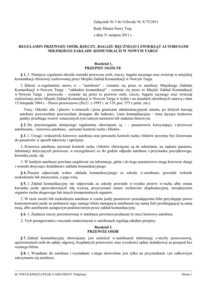 Załącznik Nr 5 do Uchwały Nr X/75/2011 Rady Miasta Nowy Targ z dnia 31 sierpnia 2011 r. REGULAMIN PRZEWOZU OSÓB, RZECZY, BAGAŻU RĘCZNEGO I ZWIERZĄT AUTOBUSAMI MIEJSKIEGO ZAKŁADU KOMUNIKACJI W NOWYM TARGU Rozdział 1. PRZEPISY OGÓLNE § 1. 1. Niniejszy regulamin określa warunki przewozu osób, rzeczy, bagażu ręcznego oraz zwierząt w miejskiej komunikacji zbiorowej realizowanej przez Miejski Zakład Komunikacji w Nowym Targu 2. Ilekroć w regulaminie mowa o: - "autobusie" - rozumie się przez to autobusy Miejskiego Zakładu Komunikacji w Nowym Targu - "zakładzie komunikacji" - rozumie się przez to Miejski Zakład Komunikacji w Nowym Targu - przewozie - rozumie się przez to przewóz osób, rzeczy, bagażu ręcznego oraz zwierząt realizowany przez Miejski Zakład Komunikacji w Nowym Targu w trybie i na zasadach określonych ustawą z dnia 15 listopada 1984 r. - Prawo przewozowe (Dz.U. z 1995 r. nr 119, poz. 575 z późn. zm.). Trasy: Odcinki ulic i placów w miastach i poza granicami administracyjnymi miasta, po których kursują autobusy powszechnie powszechnie dostępne dla ludności, Linia komunikacyjna - trasa łącząca krańcowe punkty przebiegu wozów oznaczonych tym samym numerem lub znakiem literowym. § 2. Do przestrzegania niniejszego regulaminu obowiązani są : - pasażerowie korzystający z przewozu autobusami, - kierowca autobusu, - personel kontroli ruchu i biletów. § 3. 1. Uwagi i wskazówki kierowcy autobusu oraz personelu kontroli ruchu i biletów powinny być kierowane do pasażerów w sposób taktowny i uprzejmy. 2. Kierowca autobusu, personel kontroli ruchu i biletów obowiązani są do udzielania, na żądanie pasażera, informacji dotyczących przewozu, w szczególności co do godzin odjazdu autobusu z przystanku początkowego, kierunku jazdy, itp. 3. W każdym autobusie powinna znajdować się informacja, gdzie i do kogo pasażerowie mogą kierować skargi i wnioski dotyczące działalności zakładu komunikacyjnego. § 4. Pasażer odpowiada wobec zakładu komunikacyjnego za szkody w autobusie, powstałe wskutek uszkodzenia lub zniszczenia, z jego winy. § 5. 1. Zakład komunikacyjny nie odpowiada za szkody powstałe w wyniku przerw w ruchu albo zmian kierunku jazdy spowodowanych siłą wyższą, przyczynami natury techniczno eksploatacyjnej, zarządzeniem organów ruchu drogowego lub innych kompetentnych organów. 2. W razie awarii lub uszkodzenia autobusu w czasie jazdy pasażerowi posiadającemu bilet przysługuje prawo kontynuowania jazdy na podstawie tego samego biletu następnym autobusem tej samej linii przebiegającej tą samą trasą, albo autobusem zastępczym podstawionym przez zakład komunikacyjny. § 6. 1. Znalazca rzeczy pozostawionej w autobusie powinien przekazać te rzecz kierowcy autobusu. 2. Tryb postępowania z rzeczami znalezionymi w autobusach regulują odrębne przepisy. Rozdział 2. PRZEWÓZ OSÓB § 7. Zakład komunikacyjny obowiązany jest umieścić w autobusach informację o taryfie przewozowej, uprawnieniach osób do opłaty ulgowej, bezpłatnych przewozów oraz wysokości opłaty dodatkowej za przejazd bez ważnego biletu. § 8. 1. Wsiadanie do autobusu i wysiadanie z niego dozwolone jest tylko na przystankach i po całkowitym zatrzymaniu się autobusu. Id: WIFLR-KPKEZ-UPLGK-UAIDJ-HIXCP. Podpisany Strona 1 2. Wsiadanie do autobusu na przystankach końcowych dozwolone jest dopiero po zakończeniu czynności związanych ze zmianą kierunku jazdy. 3. Kierowca autobusu po zakończeniu czynności związanych ze zmianą kierunku jazdy obowiązany jest niezwłocznie podjechać autobusem do przystanku dla wsiadających w celu umożliwienia osobom oczekującym na przystanku zajęcia miejsca w autobusie (z wyjątkiem przerw na spożycie posiłków lub awarii). 4. Kierowca autobusu obowiązany jest ruszyć z przystanku po uprzednim sprawdzeniu, ze wszystkie osoby wsiadające są wewnątrz autobusu, a wysiadające opuściły autobus. § 9. 1. Pasażerowie stojący w czasie jazdy powinni trzymać się uchwytów lub poręczy. 2. Po sygnale dźwiękowym wsiadanie i wysiadanie z autobusu jest surowo zabronione ( jeżeli pojazd wyposażony jest w takie urządzenie) 3. Pasażerowi, który doznał uszczerbku na zdrowiu wskutek niezastosowania się do powyższych zapisów, nie przysługuje prawo do roszczeń wobec MZK Nowy Targ. § 10. 1. W autobusach wyznaczone są odpowiednio oznakowane miejsca: a) dla osób z dzieckiem na ręku (dotyczy również kobiet ciężarnych), b) dla osób niepełnosprawnych. 2. Pasażer, który zajmuje miejsce oznaczone jak w pkt 1 obowiązany jest zwolnić miejsce w razie zgłoszenia się na nie innej osoby, dla której miejsce takie jest przeznaczone. § 11. 1. Pasażer po wejściu do autobusu zobowiązany jest bezzwłocznie i bez wezwania zakupić bilet lub skasować posiadany bilet w kasowniku. 2. Kierowca sprzedaje bilety podczas postoju na przystanku. § 12. 1. Z autobusu można usunąć osoby: a) nietrzeźwe, zachowujące się agresywnie wobec współpasażerów i kierowcy autobusu, b) wzbudzające odrazę brudem lub niechlujstwem, c) które z innych powodów są niebezpieczne lub uciążliwe dla współpasażerów. 2. W szczególnie uzasadnionych przypadkach, w celu uzyskania pomocy, kierowca autobusu może zjechać z trasy przejazdu do najbliższego komisariatu Policji lub Straży Miejskiej. § 13. 1. Pasażerowie nie mogą zajmować miejsca w pobliżu kierowcy w sposób ograniczający jego pole widzenia oraz w sposób utrudniający kierującemu prowadzenie autobusu. 2. Kierowcy autobusu zabrania się w czasie jazdy prowadzenia rozmów, spożywania posiłków i palenia tytoniu. 3. Zabrania się w autobusach: - otwierania drzwi autobusu podczas jazdy, - dawania nieuzasadnionego sygnału odjazdu lub zatrzymywania autobusu, - wsiadania do autobusu po sygnale odjazdu, - palenia tytoniu, zanieczyszczania i zaśmiecania autobusu lub niszczenia jego urządzeń oraz wyposażenia, - wychylania się z autobusu