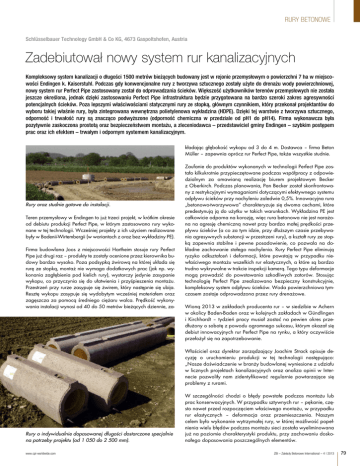 RURY BETONOWE Schlüsselbauer Technology GmbH & Co KG, 4673 Gaspoltshofen, Austria Zadebiutował nowy system rur kanalizacyjnych Kompleksowy system kanalizacji o długości 1500 metrów bieżących budowany jest w rejonie przemysłowym o powierzchni 7 ha w miejscowości Endingen k. Kaiserstuhl. Podczas gdy konwencjonalne rury z tworzywa sztucznego zostały użyte do drenażu wody powierzchniowej, nowy system rur Perfect Pipe zastosowany został do odprowadzania ścieków. Większość użytkowników terenów przemysłowych nie została jeszcze określona, jednak dzięki zastosowaniu Perfect Pipe infrastruktura będzie przygotowana na bardzo szeroki zakres agresywności potencjalnych ścieków. Poza lepszymi właściwościami statycznymi rury ze stopką, głównym czynnikiem, który przekonał projektantów do wyboru takiej właśnie rury, była zintegrowana wewnętrzna polietylenowa wykładzina (HDPE). Dzięki tej warstwie z tworzywa sztucznego, odporność i trwałość rury są znacząco podwyższone (odporność chemiczna w przedziale od pH1 do pH14). Firma wykonawcza była pozytywnie zaskoczona prostotą oraz bezpieczeństwem montażu, a zleceniodawca – przedstawiciel gminy Endingen – szybkim postępem prac oraz ich efektem – trwałym i odpornym systemem kanalizacyjnym. kładając głębokość wykopu od 3 do 4 m. Dostawca – firma Beton Müller – zapewnia oprócz rur Perfect Pipe, także wszystkie studnie. Rury oraz studnie gotowe do instalacji. Teren przemysłowy w Endingen to już trzeci projekt, w krótkim okresie od debiutu produkcji Perfect Pipe, w którym zastosowano rury wykonane w tej technologii. Wcześniej projekty z ich użyciem realizowane były w Badenii-Wirtembergii (w wariantach z oraz bez wykładziny PE). Firma budowlana Joos z miejscowości Hartheim stosuje rury Perfect Pipe już drugi raz – produkty te zostały ocenione przez kierownika budowy bardzo wysoko. Poza podsypką żwirową na której układa się rurę ze stopką, montaż nie wymaga dodatkowych prac (jak np. wykonania zagłębienia pod kielich rury), wystarczy jedynie zasypanie wykopu, co przyczynia się do ułatwienia i przyśpieszenia montażu. Przestrzeń przy rurze zasypuje się żwirem, który następnie się ubija. Resztę wykopu zasypuje się wydobytym wcześniej materiałem oraz zagęszcza za pomocą średniego ciężaru walca. Prędkość wykonywania instalacji wynosi od 40 do 50 metrów bieżących dziennie, za- Zaufanie do produktów wykonanych w technologii Perfect Pipe zostało kilkukrotnie przypieczętowane podczas współpracy z odpowiedzialnym za omawianą realizację biurem projektowym Becker z Oberkirch. Podczas planowania, Pan Becker został skonfrontowany z restrykcyjnymi wymaganiami dotyczącymi efektywnego systemu odpływu ścieków przy nachyleniu zaledwie 0,5%. Innowacyjna rura „betonowo-tworzywowa” charakteryzuje się dwoma cechami, które predestynują ją do użytku w takich warunkach. Wykładzina PE jest całkowicie odporna na korozję, więc rura betonowa nie jest narażona na agresję chemiczną nawet przy bardzo małej prędkości przepływu ścieków (a co za tym idzie, przy dłuższym czasie przebywania agresywnych substancji w przestrzeni rury), a kształt rury ze stopką zapewnia stabilne i pewne posadowienie, co pozwala na dokładne zachowanie stałego nachylenia. Rury Perfect Pipe eliminują ryzyko odkształceń i deformacji, które powstają w przypadku niewłaściwego montażu wszelkich rur elastycznych, a które są bardzo trudno wykrywalne w trakcie inspekcji kamerą. Tego typu deformacje mogą prowadzić do powstawania szkodliwych zatorów. Stosując technologię Perfect Pipe zrealizowano bezpieczny konstrukcyjnie, kompleksowy system odpływu ścieków. Woda powierzchniowa tymczasem zostaje odprowadzona przez rury drenażowe. Wioną 2013 w zakładach producenta rur – w siedzibie w Achern w okolicy Baden-Baden oraz w kolejnych zakładach w Gündlingen i Kirchhardt – tydzień pracy musiał zostać na pewien okres przedłużony o sobotę z powodu ogromnego sukcesu, którym okazał się debiut innowacyjnych rur Perfect Pipe na rynku, a który oczywiście przełożył się na zapotrzebowanie. Właściciel oraz dyrektor zarządzający Joachim Strack opisuje decyzję o uruchomieniu produkcji w tej technologii następująco: „Nasze doświadczenie w branży budowlanej wyniesione z udziału w licznych projektach kanalizacyjnych oraz analiza opinii w Internecie pozwoliły nam zidentyfikować regularnie powtarzające się problemy z rurami. Rury o indywidualnie dopasowanej długości dostarczone specjalnie na potrzeby projektu (od 1 050 do 2 500 mm). www.cpi-worldwide.com W szczególności chodzi o błędy powstałe podczas montażu lub prac konserwacyjnych. W przypadku sztywnych rur – pękanie, często nawet przed rozpoczęciem właściwego montażu, w przypadku rur elastycznych – deformacja oraz przemieszczenia. Naszym celem było wykonanie wytrzymałej rury, w której możliwość popełnienia wielu błędów podczas montażu sieci została wyeliminowana już na poziomie charakterystyki produktu, przy zachowaniu doskonałego dopasowania poszczególnych elementów. ZBI – Zakłady Betonowe International – 4 | 2013 79 RURY BETONOWE Łatwość montażu zaskoczyła zleceniodawcę, projektanta oraz wykonawców. Kolejne istotne aspekty to posadowienie rury oraz zagęszczenie wykopu – czynności te powinny być szybkie i proste w wykonaniu, a przedłużanie w czasie prac wskutek źle skalkulowanego rurociągu z powodu konieczności dostawy dodatkowych materiałów lub wymiany błędnie wykonanych podstaw studni nie powinno mieć miejsca. Biorąc pod uwagę powyższe kryteria, technologia Perfect Pipe spełniła wszystkie nasze oczekiwania. Razem z naszym partnerem technologicznym – firmą Schlüsselbauer – uruchomiliśmy wysoko zautomatyzowaną linię produkcyjną, która redefiniuje wytwarzanie rur, różniąc się całkowicie od znanych dotychc