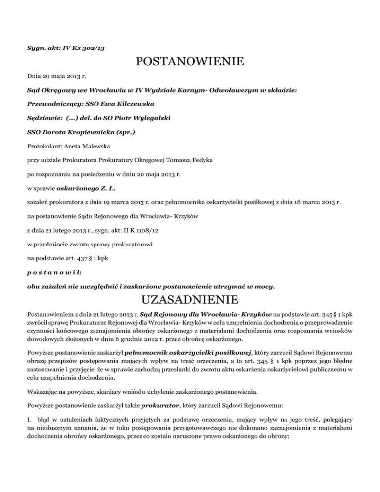 Sygn. akt: IV Kz 302/13 POSTANOWIENIE Dnia 20 maja 2013 r. Sąd Okręgowy we Wrocławiu w IV Wydziale Karnym- Odwoławczym w składzie: Przewodniczący: SSO Ewa Kilczewska Sędziowie: (...) del. do SO Piotr Wylegalski SSO Dorota Kropiewnicka (spr.) Protokolant: Aneta Malewska przy udziale Prokuratora Prokuratury Okręgowej Tomasza Fedyka po rozpoznaniu na posiedzeniu w dniu 20 maja 2013 r. w sprawie oskarżonego Z. Ł. zażaleń prokuratora z dnia 19 marca 2013 r. oraz pełnomocnika oskarżycielki posiłkowej z dnia 18 marca 2013 r. na postanowienie Sądu Rejonowego dla Wrocławia- Krzyków z dnia 21 lutego 2013 r., sygn. akt: II K 1108/12 w przedmiocie zwrotu sprawy prokuratorowi na podstawie art. 437 § 1 kpk p o s t a n o w i ł: obu zażaleń nie uwzględnić i zaskarżone postanowienie utrzymać w mocy. UZASADNIENIE Postanowieniem z dnia 21 lutego 2013 r. Sąd Rejonowy dla Wrocławia- Krzyków na podstawie art. 345 § 1 kpk zwrócił sprawę Prokuraturze Rejonowej dla Wrocławia- Krzyków w celu uzupełnienia dochodzenia o przeprowadzenie czynności końcowego zaznajomienia obrońcy oskarżonego z materiałami dochodzenia oraz rozpoznania wniosków dowodowych złożonych w dniu 6 grudnia 2012 r. przez obrońcę oskarżonego. Powyższe postanowienie zaskarżył pełnomocnik oskarżycielki posiłkowej, który zarzucił Sądowi Rejonowemu obrazę przepisów postępowania mających wpływ na treść orzeczenia, a to art. 345 § 1 kpk poprzez jego błędne zastosowanie i przyjęcie, że w sprawie zachodzą przesłanki do zwrotu aktu oskarżenia oskarżycielowi publicznemu w celu uzupełnienia dochodzenia. Wskazując na powyższe, skarżący wniósł o uchylenie zaskarżonego postanowienia. Powyższe postanowienie zaskarżył także prokurator, który zarzucił Sądowi Rejonowemu: I. błąd w ustaleniach faktycznych przyjętych za podstawę orzeczenia, mający wpływ na jego treść, polegający na niesłusznym uznaniu, że w toku postępowania przygotowawczego nie dokonano zaznajomienia z materiałami dochodzenia obrońcy oskarżonego, przez co zostało naruszone prawo oskarżonego do obrony; II. obrazę przepisów postępowania mających wpływ na treść orzeczenia, a to art. 345 § 1 kpk poprzez jego błędne zastosowanie i przyjęcie, że w sprawie zachodzą istotne braki postępowania przygotowawczego, których usunięcie przez sąd spowodowałoby znaczne trudności. Wskazując na powyższe, skarżący wniósł o uchylenie zaskarżonego postanowienia. Sąd Okręgowy zważył, co następuje: Oba wniesione w sprawie zażalenia były oczywiście bezzasadne. Sąd Rejonowy prawidłowo uznał, że w toku przeprowadzonego w sprawie postępowania przygotowawczego nie wykonano wszystkich istotnych dla rozstrzygnięcia sprawy czynności dowodowych, co uzasadniało zwrot sprawy prokuratorowi na podstawie art. 345 § 1 kpk. Niezrozumiałe były zwłaszcza przyczyny, dla których prowadzący postępowanie przygotowawcze nie tylko nie przeprowadził dowodów wnioskowanych przez obronę w piśmie z dnia 6 grudnia 2012 r., ale nawet nie odniósł się merytorycznie do zasadności ich przeprowadzenia. Zaniechanie wydania postanowienia o dopuszczeniu lub odmowie dopuszczenia wskazanych dowodów dziwi tym bardziej, że wniosek o przeprowadzenie ww. czynności dowodowych został przez obronę ponowiony w trakcie końcowego zaznajomienia z aktami postępowania przygotowawczego. Sąd Rejonowy w pełni zasadnie podniósł, że sposób przeprowadzenia dochodzenia świadczy o nienależytym uwzględnieniu interesów oskarżonego i rodzi uzasadnione wątpliwości co do zachowania przez oskarżyciela publicznego zasady obiektywizmu. Skoro bowiem prowadzący postępowanie przygotowawcze w całości uwzględnił wnioski dowodowe pokrzywdzonej, przeprowadzając wszystkie wnioskowane przez nią czynności dowodowe, to zweryfikowanie linii obrony oskarżonego wymagało przesłuchania także świadków wskazywanych przez oskarżonego. Z przeprowadzonych dotychczas dowodów wynika, że między stronami istnieje utrwalony konflikt, czego wyrazem jest m.in. prowadzone postępowanie rozwodowe. W tych okolicznościach prokurator powinien szczególnie wnikliwie badać relacje obu stron postępowania, dążąc do przesłuchania świadków nie związanych stosunkami rodzinnymi z żadną ze stron konfliktu. Niewątpliwie należało także ponownie przesłuchać oskarżonego, który w trakcie pierwszego przesłuchania nie miał jeszcze obrońcy i odmówił wówczas składania wyjaśnień. Skoro jednak we wniosku z dnia 6 grudnia 2012 r. obrońca wniósł o ponowne przesłuchanie oskarżonego, precyzując okoliczności mające być owym dowodem stwierdzone, to obowiązkiem prowadzącego postępowanie przygotowawcze było nie tylko ponowne przesłuchanie oskarżonego, ale nawet rozważenie przeprowadzenia konfrontacji między oskarżonym a oskarżycielką posiłkową, ewentualnie między oskarżonym a przesłuchanymi dotychczas w sprawie świadkami. Całkowicie nieuzasadniona była argumentacja prokuratora, że skoro znane są miejsca zamieszkania wnioskowanych przez obronę świadków, to nie istnieją przeszkody aby Sąd I instancji wezwał ich na rozprawę i odebrał od nich zeznania. Wszak zasadniczym obowiązkiem prowadzącego postępowanie przygotowawcze jest przeprowadzenie wszystkich dowodów, mogących mieć istotne znaczenie dla czynionych w sprawie ustaleń faktycznych, co wprost wynika z normy art. 297 § 1 pkt 1 i 4 kpk. Przeprowadzenie wnioskowanych przez obronę czynności dowodowych mogłoby wpływać na całościową ocenę zgromadzonego w sprawie materiału dowodowego, a przez to istotnie usprawnić tok postępowania sądowego. Nie można przy tym wykluczyć, że wnioskowani jeszcze na etapie postępowania przygotowawczego świadkowie nie posiadają żadnej wiedzy odnośnie zarzucanego oskarżonemu czynu, stąd ich przesłuchiwanie przez Sąd mogłoby się okazać bezprzedmiotowe i skutkowałoby jedynie przed