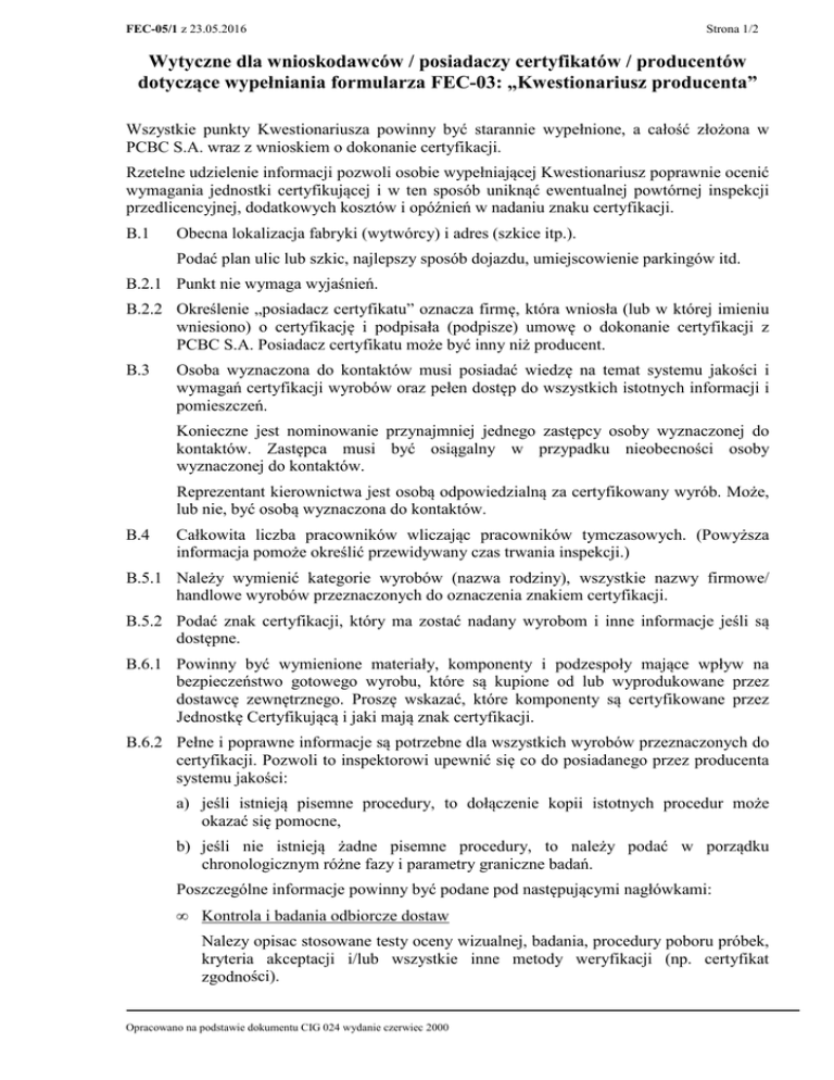 FEC-05/1 z 23.05.2016 Strona 1/2 Wytyczne dla wnioskodawców / posiadaczy certyfikatów / producentów dotyczące wypełniania formularza FEC-03: „Kwestionariusz producenta” Wszystkie punkty Kwestionariusza powinny być starannie wypełnione, a całość złożona w PCBC S.A. wraz z wnioskiem o dokonanie certyfikacji. Rzetelne udzielenie informacji pozwoli osobie wypełniającej Kwestionariusz poprawnie ocenić wymagania jednostki certyfikującej i w ten sposób uniknąć ewentualnej powtórnej inspekcji przedlicencyjnej, dodatkowych kosztów i opóźnień w nadaniu znaku certyfikacji. B.1 Obecna lokalizacja fabryki (wytwórcy) i adres (szkice itp.). Podać plan ulic lub szkic, najlepszy sposób dojazdu, umiejscowienie parkingów itd. B.2.1 Punkt nie wymaga wyjaśnień. B.2.2 Określenie „posiadacz certyfikatu” oznacza firmę, która wniosła (lub w której imieniu wniesiono) o certyfikację i podpisała (podpisze) umowę o dokonanie certyfikacji z PCBC S.A. Posiadacz certyfikatu może być inny niż producent. B.3 Osoba wyznaczona do kontaktów musi posiadać wiedzę na temat systemu jakości i wymagań certyfikacji wyrobów oraz pełen dostęp do wszystkich istotnych informacji i pomieszczeń. Konieczne jest nominowanie przynajmniej jednego zastępcy osoby wyznaczonej do kontaktów. Zastępca musi być osiągalny w przypadku nieobecności osoby wyznaczonej do kontaktów. Reprezentant kierownictwa jest osobą odpowiedzialną za certyfikowany wyrób. Może, lub nie, być osobą wyznaczona do kontaktów. B.4 Całkowita liczba pracowników wliczając pracowników tymczasowych. (Powyższa informacja pomoże określić przewidywany czas trwania inspekcji.) B.5.1 Należy wymienić kategorie wyrobów (nazwa rodziny), wszystkie nazwy firmowe/ handlowe wyrobów przeznaczonych do oznaczenia znakiem certyfikacji. B.5.2 Podać znak certyfikacji, który ma zostać nadany wyrobom i inne informacje jeśli są dostępne. B.6.1 Powinny być wymienione materiały, komponenty i podzespoły mające wpływ na bezpieczeństwo gotowego wyrobu, które są kupione od lub wyprodukowane przez dostawcę zewnętrznego. Proszę wskazać, które komponenty są certyfikowane przez Jednostkę Certyfikującą i jaki mają znak certyfikacji. B.6.2 Pełne i poprawne informacje są potrzebne dla wszystkich wyrobów przeznaczonych do certyfikacji. Pozwoli to inspektorowi upewnić się co do posiadanego przez producenta systemu jakości: a) jeśli istnieją pisemne procedury, to dołączenie kopii istotnych procedur może okazać się pomocne, b) jeśli nie istnieją żadne pisemne procedury, to należy podać w porządku chronologicznym różne fazy i parametry graniczne badań. Poszczególne informacje powinny być podane pod następującymi nagłówkami: • Kontrola i badania odbiorcze dostaw Nalezy opisac stosowane testy oceny wizualnej, badania, procedury poboru próbek, kryteria akceptacji i/lub wszystkie inne metody weryfikacji (np. certyfikat zgodności). Opracowano na podstawie dokumentu CIG 024 wydanie czerwiec 2000 FEC-05/1 z 23.05.2016 • Strona 2/2 Kontrola i badania w toku produkcji Tak jak powyżej należy wskazać czy inspekcje i badania są badaniami na linii produkcyjnej i/lub inspekcjami i badaniami losowymi. • Badania rutynowe Typowym przykładem badań rutynowych kuchenki mikrofalowej może być 100% badanie końcowe: Ciągłość obwodu ochronnego >10 A a.c. R<0,2Ω, Wytrzymałość dielektryczna izolacji 1000 V a.c. 5 mA 1s 2 Upływ mikrofal <= 50W/m Sprawdzenie działania układu blokady drzwi Sprawdzenie ostrzeżeń dotyczących mikrofal na odpowiednich pokrywach • Badania weryfikacyjne wyrobu Należy podać czy są prowadzone badania weryfikacyjne i jeżeli tak, to jakie są stawiane wymagania. Jeśli są przeprowadzone badania dodatkowe do wymienionych powyżej, to należy je opisać. B.7 Jakie znaki certyfikacji, jeśli są, zostały dotąd nadane dla tej grupy wyrobów przez inne Jednostki Certyfikujące? B.8 Szczegóły powinny obejmować normy, nazwę jednostki, która przyznała certyfikat, datę certyfikatu. Możliwe jest dołączenie kopii odpowiedniego certyfikatu. B.9 Kwestionariusz musi być sprawdzony i podpisany przez upoważnionego przedstawiciela kierownictwa w fabryce, w której wyrób jest lub będzie produkowany. Opracowano na podstawie dokumentu CIG 024 wydanie czerwiec 2000