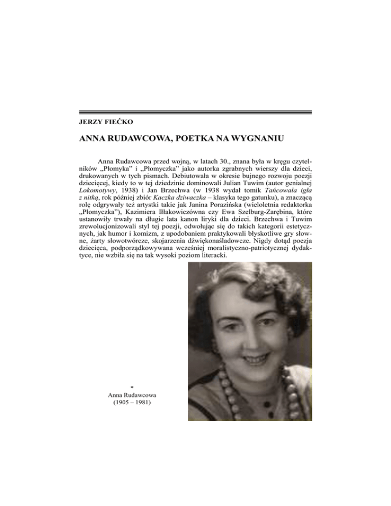 JERZY FIEĆKO ANNA RUDAWCOWA, POETKA NA WYGNANIU Anna Rudawcowa przed wojną, w latach 30., znana była w kręgu czytelników „Płomyka” i „Płomyczka” jako autorka zgrabnych wierszy dla dzieci, drukowanych w tych pismach. Debiutowała w okresie bujnego rozwoju poezji dziecięcej, kiedy to w tej dziedzinie dominowali Julian Tuwim (autor genialnej Lokomotywy, 1938) i Jan Brzechwa (w 1938 wydał tomik Tańcowała igła z nitką, rok później zbiór Kaczka dziwaczka – klasyka tego gatunku), a znaczącą rolę odgrywały też artystki takie jak Janina Porazińska (wieloletnia redaktorka „Płomyczka”), Kazimiera Iłłakowiczówna czy Ewa Szelburg-Zarębina, które ustanowiły trwały na długie lata kanon liryki dla dzieci. Brzechwa i Tuwim zrewolucjonizowali styl tej poezji, odwołując się do takich kategorii estetycznych, jak humor i komizm, z upodobaniem praktykowali błyskotliwe gry słowne, żarty słowotwórcze, skojarzenia dźwiękonaśladowcze. Nigdy dotąd poezja dziecięca, podporządkowywana wcześniej moralistyczno-patriotycznej dydaktyce, nie wzbiła się na tak wysoki poziom literacki. * Anna Rudawcowa (1905 – 1981) 38 JERZY FIEĆKO Poetce z Grodna niełatwo zatem było zdobyć miejsce na parnasie polskiej poezji dziecięcej. W utworach publikowanych w „Płomyczku” i „Płomyku” stroniła raczej od eksperymentów językowych i stylistycznych, właściwych dla Tuwima i Brzechwy, wybierała linię zapoczątkowaną przez Marię Konopnicką, pierwszą pisarkę, która literaturę dziecięcą podniosła na wysoki pułap artystyczny, a ponad subtelnie wyrażany dydaktyzm stawiała wrażliwość dziecka, eksponowała jego postrzeganie świata. Wiersze Rudawcowej, drukowane w „Płomyczku” (1937-1938), cechuje zrytmizowany porządek wersowy, czytelne rymy, klarowny język, odwołujący się do wyobraźni dziecięcej. Poetka często wykorzystywała chwyt scenki dialogowej, która pozwalała przedstawiać różne modele dziecięcego odbioru świata i siebie. Ważną cechą tych wierszy był humor, życzliwe podejście do dziecięcych zachowań, stroniące od natrętnego dydaktyzmu i moralizatorskiego pouczania. I tak w liryku Jak to było na choince znajdziemy zabawną scenkę dialogu między figurkami z choinki, wiodącymi spór o to, kto z nich jest tam postacią najważniejszą, dialogu stylizowanego na dziecięce polemiki, w których każde stara się podkreślać swoją ważność i wyjątkowość; podobny charakter miał wiersz O ropusze plotkarze i obrażonym komarze, wykorzystujący bajkowy zabieg wpisywania w kłótnię figur ze świata zwierzęcego/owadziego sytuacji właściwych dla doświadczeń człowieka, w tym wypadku dziecka. W owym czasie był to klasyczny chwyt stosowany w poezji przeznaczonej dla najmłodszego czytelnika. Zdarzały się też akcenty patriotyczne, choćby w liryku Jak dzieci do Pana Prezydenta wędrowały, gdzie szło nie tyle o podtrzymywanie kultu Mościckiego, co raczej naukę czystego przywiązania i szacunku dla instytucji niepodległego państwa (ten wiersz też miał charakter fabularny, epicki, przedstawiał rzeszę dzieci wędrujących zimą do stolicy z życzeniami dla Prezydenta, dzieci, które wciągnęły do tej pielgrzymki nawet srogi, upersonifikowany miesiąc Luty). Podobnie udramatyzowany charakter miały wiersze z „Płomyka”, przedstawiające a to monolog dziewczynki wykonującej akrobacje na linie w cyrku (Taniec na linie), a to wynurzenia „cudaczki-księżniczki” Echo powtarzającej cudze głosy (wiersz Echo), czy wreszcie marzenie zaklętej, śpiącej królewny o dobrej wróżce i królewiczu Maju, którzy niedługo powinni wyrwać ją z okowów długiego snu (Śpiąca Królewna). W wierszach bodaj nie publikowanych, częściej pojawiały się akcenty i tematy modlitewno-religijne, a ich bohaterami i adresatami bywały dzieci poetki, Halinka i Danek (Bohdan). *** Anna Rudawcowa pochodziła z rodziny szlacheckiej Okuszko-Boska (nazwisko panieńskie pisarki), pieczętującej się herbem Leliwa, urodziła się w Dorpacie 7 sierpnia 1905 r. (tam zdobyła wykształcenie gimnazjalne), w niepodległej Polsce ukończyła w Wilnie z wyróżnieniem liceum, później kłopoty rodzinne (przedwczesna śmierć ojca, adwokata z zawodu) uniemożliwiły podjęcie studiów i zmusiły – po odbyciu koniecznych kursów pedagogicznych – do wczesnego podjęcia pracy w zawodzie nauczyciela (jednym z jej wychowanków był wybitny poeta Wiktor Woroszylski, o czym sam wspominał). W r. 1924 wyszła za mąż za Michała Rudawca, dyrektora szkoły w Mostach, w której pracowała, mieli dwoje dzieci, Halinę i Bohdana. W r. 1931 osiedli Anna Rudawcowa, poetka na wygnaniu 39 w Grodnie, Rudawcowa uprawiała tam poezję dziecięcą (współpracując właśnie z „Płomykiem” i „Płomyczkiem”) oraz oddawała się drugiej pasji, aktorstwu, grywała w teatrach amatorskich, ale i w profesjonalnym Teatrze Grodzieńskim im. Elizy Orzeszkowej. W Grodnie razem przeżyli początek wojny, która dramatycznie wpłynęła na ich losy. Michał Rudawiec w styczniu 1940 r. został aresztowany przez NKWD i osadzony w obozie, z którego zbiegł tuż po wybuchu wojny niemiecko-sowieckiej, powrócił do Grodna i tam doczekał końca dziejowej apokalipsy, ukrywając inteligencką tożsamość. Poetka z córką Haliną i synem Bohdanem – Grodno 1939 Annę Rudawcową wraz z dwójką dzieci w kwietniu 1940 r., w ramach drugiej fali aresztowań i wywózek Polaków z tych terenów, wywieziono w głąb Kazachstanu. Dramatyczne koleje ich sześcioletniej zsyłki przedstawiła Halina Łupinowicz, córka poetki, w książce Skrzywdzeni (tekst dostępny w sieci internetowej). Najpierw trafili do małego „posiołka” Lubimowka, leżącego w stepie w odległości 40 wiorst od Irtysza i zamieszkałego głównie przez Kirgizów, żyjących w rytmie starodawnej tradycji, nastawionych do nowych przybyszów w większości życzliwie. Powstała tam ma