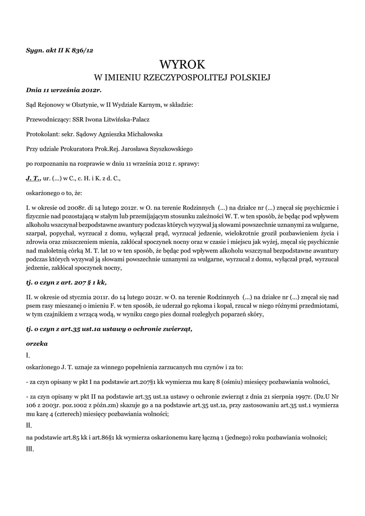 Sygn. akt II K 836/12 WYROK W IMIENIU RZECZYPOSPOLITEJ POLSKIEJ Dnia 11 września 2012r. Sąd Rejonowy w Olsztynie, w II Wydziale Karnym, w składzie: Przewodniczący: SSR Iwona Litwińska-Palacz Protokolant: sekr. Sądowy Agnieszka Michałowska Przy udziale Prokuratora Prok.Rej. Jarosława Szyszkowskiego po rozpoznaniu na rozprawie w dniu 11 września 2012 r. sprawy: J. T., ur. (...) w C., c. H. i K. z d. C., oskarżonego o to, że: I. w okresie od 2008r. di 14 lutego 2012r. w O. na terenie Rodzinnych (...) na działce nr (...) znęcał się psychicznie i fizycznie nad pozostającą w stałym lub przemijającym stosunku zależności W. T. w ten sposób, że będąc pod wpływem alkoholu wszczynał bezpodstawne awantury podczas których wyzywał ją słowami powszechnie uznanymi za wulgarne, szarpał, popychał, wyrzucał z domu, wyłączał prąd, wyrzucał jedzenie, wielokrotnie groził pozbawieniem życia i zdrowia oraz zniszczeniem mienia, zakłócał spoczynek nocny oraz w czasie i miejscu jak wyżej, znęcał się psychicznie nad małoletnią córką M. T. lat 10 w ten sposób, że będąc pod wpływem alkoholu wszczynał bezpodstawne awantury podczas których wyzywał ją słowami powszechnie uznanymi za wulgarne, wyrzucał z domu, wyłączał prąd, wyrzucał jedzenie, zakłócał spoczynek nocny, tj. o czyn z art. 207 § 1 kk, II. w okresie od stycznia 2011r. do 14 lutego 2012r. w O. na terenie Rodzinnych (...) na działce nr (...) znęcał się nad psem rasy mieszanej o imieniu F. w ten sposób, że uderzał go rękoma i kopał, rzucał w niego różnymi przedmiotami, w tym czajnikiem z wrzącą wodą, w wyniku czego pies doznał rozległych poparzeń skóry, tj. o czyn z art.35 ust.1a ustawy o ochronie zwierząt, orzeka I. oskarżonego J. T. uznaje za winnego popełnienia zarzucanych mu czynów i za to: - za czyn opisany w pkt I na podstawie art.207§1 kk wymierza mu karę 8 (ośmiu) miesięcy pozbawiania wolności, - za czyn opisany w pkt II na podstawie art.35 ust.1a ustawy o ochronie zwierząt z dnia 21 sierpnia 1997r. (Dz.U Nr 106 z 2003r. poz.1002 z późn.zm) skazuje go a na podstawie art.35 ust.1a, przy zastosowaniu art.35 ust.1 wymierza mu karę 4 (czterech) miesięcy pozbawiania wolności; II. na podstawie art.85 kk i art.86§1 kk wymierza oskarżonemu karę łączną 1 (jednego) roku pozbawiania wolności; III. na podstawie art. 69 § 1 i 2 kk w zw. z art. 70 § 1 pkt 1 kk i art.73§1 kk wykonanie orzeczonej kary pozbawienia wolności warunkowo zawiesza oskarżonemu na okres lat 4 (czterech) tytułem próby i oddaje go w tym czasie pod dozór kuratora; IV. na podstawie art.72§1 pkt 5 kk zobowiązuje oskarżonego do powstrzymania się od nadużywania alkoholu; V. na podstawie art. 624§1 kpk zwalnia oskarżonego od zapłaty na rzecz Skarbu Państwa kosztów sądowych.