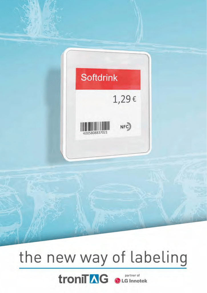 |1 Wstęp ESL - Nowy wymiar komunikacji cenowej Prezentujemy Państwu Electronic Shelf Labels (ESL), cyfrowe wyświetlacze do komunikacji cenowej, jak i produktowej w miejscu sprzedaży (POS). Rozwiązanie troniTAG ESL w prosty i dostępny sposób łączy system gospodarki magazynowej z miejscem sprzedaży. Udostępniamy Państwu nieograniczone możliwości w zakresie szybkiego dostępu do informacji o cenach i wyrobach. Co jednak ważniejsze, przede wszystkim możliwość błyskawicznej zmiany tych informacji. ESL-SerwerOprogramowanie Serwer Optimus LTE € 5.50 20140724 MP 20140724 01-07 ESL - Oprogramowanie Klienta (nadawcy) Indeks Korzyści.................................................................................................................. 3 Zagadnienia technicze............................................................................................4 Legenda..................................................................................................................5 Seria BL............................................................................................................6- 13 Seria IL........................................................................................................... 14 - 19 Produkty mocujące.........................................................................................20 - 35 Rozwiązania uzupełniające.............................................................................36 - 38 Podsumowanie..................................................................................................... 39 Kontakt................................................................................................................. 42 Korzyści Odkryj siłę możliwości Korzyści płynące z zastosowania elektronicznych wyświetlaczy ESL w stosunku do tradycyjnych nośników papierowych są ogromne, najważniejsze prezentujemy poniżej: Trwała prezentacja informacji cenowo - produktowych Bezpieczeństwo transmisji danych Sichere Datenübertragung Zmiana informacji w czasie rzeczywistym Unmittelbare Darstellung von Änderungen Centralnie zarządzana oraz monitorowana informacja cenowo produktowa Stała kontrola aktualnych stanów towarowych Przyszłościowy kierunek zarządzania informacją Szeroki wachlarz dodatków montażowych Wysoka efektywność energetyczna Łatwa oraz natychmiastowa aktualizacja danych oparta jest na bezprzewodowej transmisji danych. Dzięki zastosowaniu systemu etykiet elektronicznych rezygnujecie Państwo ze żmudnej oraz obarczonej błędami pracy ręcznego nanoszenia etykiet cenowych. Zmiana cen, informacji o akcjach promocyjnych, wyprzedażach następuje poprzez jedno kliknięcie i pojawia się równocześnie na wszystkich wytypowanych nośnikach ESL. Dodatkowo nasze etykiety, poprzez zastosowanie e-papieru umożliwiają wyświetlanie ilustracji graficznych, w ten sposób efektywnie wspierając działania sprzedażowe. Zakodowany sygnał radiowy pomiędzy Gateway (transmiter) a elektroniczną etykietą uniemożliwia ingerencję osób niepowołanych. Cechą charakterystyczną naszego systemu jest również bardzo niskie zużycie energii elektrycznej. Wszystkie informacje o produktach mogą Państwo za pomocą technologii ESL nadzorować centralnie. System stanowi idealne narzędzie do kontroli cen i przekazywania informacji klientom. Wysoka rozdzielczość wyświetlaczy umożliwia ilustrację kodów kreskowych, odczytywanych za pomocą skanerów. Tym samym ESL wspiera kontrolę stanów towarowych w danym obiekcie. Opcjonalne zastosowanie technologii NFC (Near Field Communication) daje klientom sklepu możliwość pozyskanie dodatkowych informacji o produktach, za pośrednictwem smartfonów z funkcją NFC. I co najważniejsze - technologia troniTAG ESL umożliwia rozbudowanie systemu w przyszłości. TroniTAG stanowi kompleksowy system komunikowania w miejscu sprzedaży, bez żadnych ograniczeń. Nasz system możecie Państwo stosować w każdym miejscu i przy każdym produkcie. Bogata oferta elementów dodatkowych takich jak: profile, uchwyty, adaptery, stojaczki czy też szyny pozwoli nam dostosować ofertę do Państwa potrzeb i oczekiwań. |3 Zagadnienia techniczne ESL - jak to działa ? Serwer Serwer łączy oprogramowanie ESL - Klienta z systemem kasowym, przekazując tym samym dane do Transmitera (gateway). ESL - Klient Dział IT może w ten sposób nadzorować oraz kontrolować system ESL (status wyświetlaczy, informacje o produktach, ilustracje, itp.). Transmiter (Gateway) Gateway nadaje informacje w kierunku wyświetlaczy, odczytując równolegle informacje o stanie akumulatorów, ewentualnych błędach oraz aktywności sieci. Tag - Elektroniczny wyświetlacz Ilustracja informacji cenowo - produktowych, komunikuje z transmiterem. Pełnią funkcję nośnika informacji (ceny, opisy, kody kreskowe, ilustracje). Produkty pomocnicze Szeroki wachlarz produktów pomocniczych w postaci szyn montażowych, uchwytów czy też adapterów pozwala na stosowanie systemu ESL praktycznie w każdym miejscu sprzedaży. ESL - Klient Serwer System kasowy Transmiter € 5.50 € 5.50 100 g 100 g Pinapple Elektroniczne wyświetlacze € 5.50 100 g 4| Profile montażowe Pinapple Pinapple Pinapple € 5.50 100 g Adaptery Legenda Seria - BL BL15 (S. 8) BL21 (S. 8) BL29 (S. 10) BL42 (S. 10) BL74 (S. 12) 37 x 43 70 x 35 91,5 x 43,5 104 x 88,5 127 x 180 200 x 200 S/W 27,6 x 27,6 S/W/R 212 x 104 S/W 48,5 x 23,8 S/W/R 296 x 128 S/W 66,9 x 29,1 S/W/R 400 x 300 S/W 84,4 x 63,6 S/W/R 480 x 800 S/W 97 x 162 S/W/R 188 dpi 2x AAAA ✓ ✓ 0 °C 45 °C 112 dpi 2x AAAA ✓ ✓ 0 °C 45 °C 114 dpi 2x AAAA ✓ ✓ 0 °C 45 °C 121 dpi 4x AAAA ✓ ✓ 0 °C 45 °C 96 dpi 8x AAAA ✓ ✓ 0 °C 45 °C Seria - IL IL15 (S. 16) IL21 (S. 16) IL29 (S. 18) IL42 (S. 18) 43,5 x 45 70 x 35 91,5 x 43,5 104 x 88,5 200 x 200 S/W 27,6 x 27,6 S/W/R 212 x 104 S/W 48,5 x 23,8 S/W/R 296 x 128 S/W 66,9 x 29,1 S/W/R 400 x 300 S/W 84,4 x 63,6 S/W/R 188 
