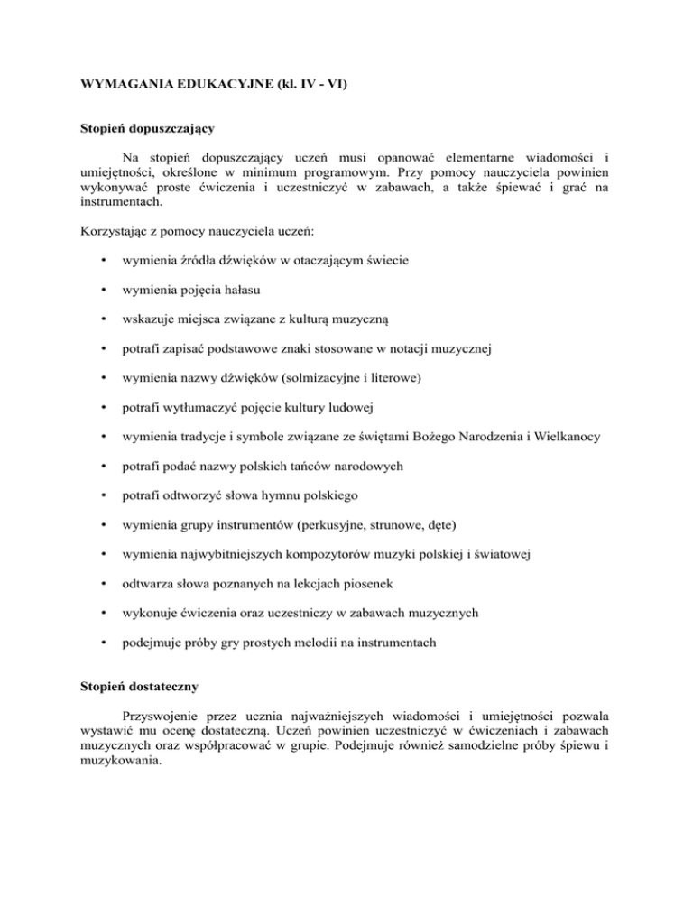 WYMAGANIA EDUKACYJNE (kl. IV - VI) Stopień dopuszczający Na stopień dopuszczający uczeń musi opanować elementarne wiadomości i umiejętności, określone w minimum programowym. Przy pomocy nauczyciela powinien wykonywać proste ćwiczenia i uczestniczyć w zabawach, a także śpiewać i grać na instrumentach. Korzystając z pomocy nauczyciela uczeń: • wymienia źródła dźwięków w otaczającym świecie • wymienia pojęcia hałasu • wskazuje miejsca związane z kulturą muzyczną • potrafi zapisać podstawowe znaki stosowane w notacji muzycznej • wymienia nazwy dźwięków (solmizacyjne i literowe) • potrafi wytłumaczyć pojęcie kultury ludowej • wymienia tradycje i symbole związane ze świętami Bożego Narodzenia i Wielkanocy • potrafi podać nazwy polskich tańców narodowych • potrafi odtworzyć słowa hymnu polskiego • wymienia grupy instrumentów (perkusyjne, strunowe, dęte) • wymienia najwybitniejszych kompozytorów muzyki polskiej i światowej • odtwarza słowa poznanych na lekcjach piosenek • wykonuje ćwiczenia oraz uczestniczy w zabawach muzycznych • podejmuje próby gry prostych melodii na instrumentach Stopień dostateczny Przyswojenie przez ucznia najważniejszych wiadomości i umiejętności pozwala wystawić mu ocenę dostateczną. Uczeń powinien uczestniczyć w ćwiczeniach i zabawach muzycznych oraz współpracować w grupie. Podejmuje również samodzielne próby śpiewu i muzykowania. Uczeń: • potrafi wymienić i opisać dźwięki w otaczającym świecie • wskazuje źródła hałasu • wyjaśnia w jaki sposób należy dbać o środowisko przyrodnicze • wymienia miejsca, w których można posłuchać poszczególnych gatunków muzyki • rozróżnia znaki stosowane w notacji muzycznej i określa ich funkcję • wymienia • prawidłowo określa położenie nut na pięciolinii • podaje podstawowe schematy taktowania • wyjaśnia znaczenie dynamiki i tempa w utworze muzycznym • wymienia podstawowe oznaczenia tempa i artykulacji oraz znaki dynamiczne • wyjaśnia pojęcia: muzyka jednogłosowa i wielogłosowa • potrafi wymienić elementy folkloru oraz polskie regiony folklorystyczne • wyjaśnia znaczenie niektórych tradycji i symboli związanych ze świętami Bożego wartości rytmiczne Narodzenia i Wielkanocy • charakteryzuje polskie tańce narodowe • potrafi opisać grupy instrumentów i podać ich przykłady • wymienia różne typy zespołów wokalnych i instrumentalnych • wyjaśnia jak powstaje głos • przedstawia sylwetki wybranych kompozytorów muzyki polskiej i światowej • aktywnie uczestniczy w ćwiczeniach i zabawach muzycznych • odtwarza słowa i melodie poznanych na lekcjach piosenek • potrafi zagrać proste melodie na instrumentach • współpracuje w grupie Stopień dobry Stosowanie wiedzy muzycznej w praktyce oraz aktywne uczestnictwo w działaniach muzycznych na lekcji pozwala wystawić uczniowi stopień dobry. Uczeń powinien właściwie posługiwać się terminologią przedmiotową i rozwiązywać typowe problemy. Uczeń: • klasyfikuje źródła dźwięków w otaczającym świecie • dostrzega i analizuje problemy ekologiczne • wyjaśnia wpływ hałasu na samopoczucie i zdrowie człowieka • wyjaśnia pojęcia: muzyka ilustracyjna i programowa • posługuje się podstawowymi znakami stosowanymi w notacji muzycznej • rozróżnia poznane wartości rytmiczne • potrafi zapisać symbole graficzne poznanych wartości rytmicznych • wykonuje wybrane schematy taktowania • rozpoznaje zmiany tempa i dynamiki w trakcie słuchania utworów • wyjaśnia pojęcia: gama, interwał, cały ton, półton, akord • charakteryzuje różne formy muzyczne (pieśń, rondo, wariację, operę, balet) • potrafi wytłumaczyć czym zajmuje się etnograf na przykładzie działalności Oskara Kolberga • wskazuje odmienności kulturowe na przykładzie wybranych regionów świata • opisuje wybrane instrumenty i przyporządkowuje je do określonej grupy (instrumenty perkusyjne, strunowe, dęte) • potrafi scharakteryzować różne typy zespołów instrumentalnych • potrafi sklasyfikować i opisać zespoły wokalne • podaje rodzaje głosów ludzkich (alt, mezzosopran, sopran, bas, baryton, tenor) • przedstawia sylwetki wybitnych kompozytorów muzyki polskiej i światowej • potrafi wymienić twórców i animatorów kultury muzycznej swojej miejscowości • rozpoznaje wysłuchane wcześniej utwory muzyczne • chętnie śpiewa i gra na instrumentach, wykorzystując zdobytą wiedzę muzyczną • wykazuje dużą aktywność podczas ćwiczeń i zabaw muzycznych Stopień bardzo dobry Stopień bardzo dobry otrzymuje uczeń, który opanował i wykorzystuje w praktyce wszystkie określone w programie wiadomości i umiejętności. Ponadto bierze udział w dyskusjach na temat muzyki i potrafi uzasadniać swoje poglądy. Chętnie uczestniczy również w różnorodnych działaniach muzycznych na terenie szkoły i poza nią. Uczeń: • dyskutuje na temat roli hymnów w życiu człowieka • wskazuje sposoby zmniejszania poziomu hałasu w najbliższym otoczeniu • podaje propozycje rozwiązania problemów ekologicznych • wykazuje troskę o najbliższe środowisko • swobodnie posługuje się notacją muzyczną • odtwarza kształt linii melodycznej na podstawie zapisu nutowego • analizuje utwory pod względem dynamiki, tempa i artykulacji • potrafi zastosować w działalności muzycznej poznane wartości rytmiczne • potrafi samodzielnie utworzyć rondo rytmiczne lub melodyczne • uzasadnia potrzebę znajomości kultury ludowej własnego kraju • potrafi ocenić zasługi etnografów dla kultury narodowej • potrafi odtworzyć rytmy polskich tańców narodowych • rozróżnia rodzaje zespołów wokalnych i instrumentalnych • rozróżnia rodzaje głosów ludzkich • dba o higienę głosu • posługuje się w praktyce poznaną terminologią muzyczną • potrafi korzystać z 