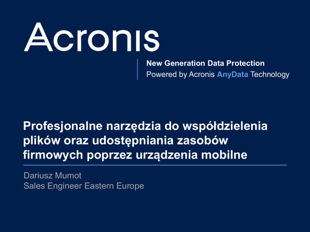 New Generation Data Protection Powered by Acronis AnyData Technology Profesjonalne narzędzia do współdzielenia plików oraz udostępniania zasobów firmowych poprzez urządzenia mobilne Dariusz Mumot Sales Engineer Eastern Europe 96% © 2014 60% Proprietary and Confidential 2 © 2014 Proprietary and Confidential 3 2 światy © 2014 Proprietary and Confidential 4 Wymagania – Bezpieczeństwo i Zarządzanie • Lokalna autentykacja użytkownika • Autentykacja wielopoziomowa – hasło, certyfikat, SmartCard • Implementacja lokalna, w środowisku użytkownika • Szyfrowanie zasobów i komunikacji – AES, FIPS • Logowanie działań użytkowników • Integracja z Active Directory • Polityki bezpieczeństwa • Kontrola nad współdzieleniem zasobów (tylko wewnątrz, białe i czarne listy, itp.) Wymagania – Bezpieczeństwo i Zarządzanie • Natywna integracja z systemami Mobile Device Management (MDM) • Kontrola nad poszczególnymi funkcjami aplikacji mobilnej • Intuicyjny, łatwy do opanowania interfejs • BYOD – Kontrola nad dostępem do danych – Bezpieczeństwo danych • Sprawdzony w wielu środowiskach (instytucje finansowe, ubezpieczyciele, produkcja, sprzedaż, służba zdrowia, itp.) Oczekiwania użytkowników • Osobisty dysk wirtualny – Duża pojemność – Dostęp przez www – Klient na Win/Mac – Klient na urządzenia mobilne • Dostęp do zasobów sieciowych korporacji – Klient na urządzenia mobilne – Dostęp do tych samych danych jak z poziomu komputera – Edycja dokumentów Oczekiwania użytkowników • Środowisko pracy – Współdzielenie i synchronizacja plików na wielu urządzeniach – BYOD – Wbudowany edytor plików office – Wersjonowanie plików – Praca online i offline – Interakcja z innymi aplikacjami Optymalne rozwiązanie? • Porównanie funkcjonalności Optymalne rozwiązanie? • Porównanie funkcjonalności – Bezpieczeństwo – Architektura – Łatwość administracji – Funkcje dla użytkowników • Licencjonowanie – Licencja dożywotnia / Subskrypcja roczna • Instalacja testowa POC New Generation Data Protection Powered by Acronis AnyData Technology Acronis Access Comprehensive Solution for Secure File Access, Sync and Share New Generation Data Protection Powered by Acronis AnyData Technology www.acronis.com twitter.com/acronis blog.acronis.com facebook.com/acronis