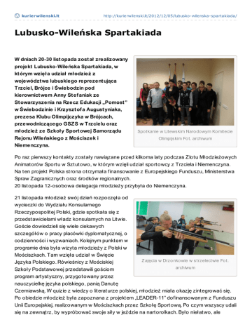 kurierwilenski.lt http://kurierwilenski.lt/2012/12/05/lubusko-wilenska-spartakiada/ Lubusko-Wileńska Spartakiada W dniach 20-30 list opada zost ał zrealizowany projekt Lubusko-Wileńska Spart akiada, w kt órym wzięła udział młodzież z województ wa lubuskiego reprezent ująca Trzciel, Brójce i Świebodzin pod kierownict wem Anny St ef aniak ze St owarzyszenia na Rzecz Edukacji „Pomost ” w Świebodzinie i Krzyszt of a August yniaka, prezesa Klubu Olimpijczyka w Brójcach, przewodniczącego GSZS w Trzcielu oraz młodzież ze Szkoły Sport owej Samorządu Rejonu Wileńskiego z Mościszek i Niemenczyna. Spotkanie w Litewskim Narodowym Komitecie Olimpijskim Fot. archiwum Po raz pierwszy kontakty zostały nawiązane przed kilkoma laty podczas Zlotu Młodzieżowych Animatorów Sportu w Sztutowo, w którym wzięli udział sportowcy z Trzciela i Niemenczyna. Na ten projekt Polska strona otrzymała finansowanie z Europejskiego Funduszu, Ministerstwa Spraw Zagranicznych oraz środków regionalnych. 20 listopada 12-osobowa delegacja młodzieży przybyła do Niemenczyna. 21 listopada młodzież swój dzień rozpoczęła od wycieczki do Wydziału Konsularnego Rzeczypospolitej Polski, gdzie spotkała się z przedstawicielami władz konsularnych na Litwie. Goście dowiedzieli się wiele ciekawych szczegółów o pracy placówki dyplomatycznej, o codzienności i wyzwaniach. Kolejnym punktem w programie dnia była wizyta młodzieży z Polski w Mościszkach. Tam wzięła udział w Święcie Języka Polskiego. Rówieśnicy z Mościskiej Szkoły Podstawowej przedstawili gościom program artystyczny, przygotowany przez nauczycielkę języka polskiego, panią Danutę Z ajęcia w Drzonkowie w strzelectwie Fot. archiwum Czerniawską. W quizie z wiedzy o literaturze polskiej, młodzież miała okazję zintegrować się. Po obiedzie młodzież była zapoznana z projektem „LEADER-11” dofinansowanym z Funduszu Unii Europejskiej, realizowanym w Mościszkach przez Szkołę Sportową. Po czym wszyscy udali się na zewnątrz, by wypróbować swoje siły w jeździe na nartorolkach. Było niełatwo, ale wysportowana młodzież sprostała zadaniu. Po powrocie do Niemenczyna, goście prowadzili zajęcia unihokeja dla uczniów Gimnazjum im. Konstantego Parczewskiego w Niemenczynie. W końcu zajęć gimnazjaliści i goście z Polski rozegrali towarzyski mecz. Goście grali bardzo technicznie i ostro, zadziwiali szybkością w atakach, celnymi strzałami do bramek, na co miejscowa młodzież przeciwstawiła hazardową grę, ale zwycięstwo świętowali goście z Polski. 23 listopada uczestnicy projektu gościli w Gimnazjum im. Konstantego Parczewskiego w Niemenczynie. Tam zwiedzili klasy, bibliotekę i muzeum. Jelena Garliauskienė opowiedziała o historii Niemenczyna oraz gimnazjum, po czym odbyła się prezentacja gimnazjum oraz spotkanie z dyrekcją i starostą miasta Niemenczyn Mieczysławem Borusewiczem. Kolejnym punktem integracji były warsztaty kulinarne regionalnych dań: uczniowie sami T rening na nartorolkach Fot. archiwum szykowali kibiny, cepeliny, które potem podano na wspólny stół. Punktualnie o godz.14 goście rozpoczęli lekcję kaligrafii — pisanie gęsim piórem w Muzeum im. Władysława Syrokomli w Borejkowszczyźnie. Krótka lekcja zapamiętała się bardzo, gdyż młodzież coraz częściej posługuje się komputerem, coraz rzadziej wiecznym piórem, co już mówić o gęsim. Życiorys Władysława Syrokomli oraz historię Borejkowszczyzny gościom przedstawił profesor Uniwersytetu Wileńskiego Józef Szostakowski. Karmą dla duszy była wycieczka, natomiast dla ciała — ziołowa herbata ugotowana w samowarze z pysznym ciastem. Wieczorem w Centrum Kultury w Niemenczynie odbyły się wspólne zajęcia młodzieży polskiej i niemenczyńskiej w tenisie stołowym. W piątek zwiedzanie Wilna goście rozpoczęli od wizyty w Litewskim Narodowym Komitecie Olimpijskim. Mistrzyni olimpijska z Calgary Vida Vencienė opowiedziała o działalności Komitetu Olimpijskiego Litwy, następnie delegacja z Polski spotkała się z prezydentem LNKO (LTOK) Dainą Gudzinavičiutė, mistrzynią olimpijską z Seulu. Zrobiono wspólne pamiątkowe zdjęcie. Następnie młodzież z Polski udała się do redakcji „Kuriera Wileńskiego”. W redakcji zastępca naczelnego redaktora dziennika Aleksander Borowik opowiedział o historii dziennika mniejszości narodowych, jak powstaje numer gazety. Goście zwiedzili muzeum redakcji oraz oglądali proces wydawania gazety. Następnie pojechali na cmentarz na Rossie, zapalili znicze przy Mauzoleum Marszałka Józefa Piłsudskiego, zatem zwiedzili Starówkę. Rozpoczynając od Ostrej Bramy, młodzież udała się do cerkwi św. Ducha. Następnie kroki swoje skierowała w kierunku Ratusza, skąd krętymi i wąskimi ulicami byłej dzielnicy żydowskiej dotarła do Uniwersytetu Wileńskiego. Minąwszy Pałac Prezydencki, uczestnicy projektu zwiedzili Katedrę Wileńską pod wezwaniem św. Stanisława i św. Władysława. Po krótkiej modlitwie przy grobie patrona młodzieży św. Kazimierza goście udali się w kierunku zakątka gotyckiego, skąd szybkim krokiem do autobusu, by pojechać na obiad. Po obiedzie nastąpił czas rozrywki i odbył się koleżeński mecz piłki nożnej między gimnazjalistami i gośćmi z Polski. Tym razem zwycięstwo świętowali gospodarze, a wieczorem odbyła się dyskoteka integracyjna. W sobotę odbyło się zwiedzanie Trok i Alei Olimpijczyków w Wilnie, po obiedzie był trening unihokeju oraz zwiedzanie centrum handlowego „Ozas”. 25 listopada delegacja z Polski wyjechała z powrotem do Polski. W sobotę 24 listopada 12-osobowa delegacja rejonu wileńskiego z Mościszek i Niemenczyna pod kierownictwem Mariana Kaczanowskiego wyjechała do Trzciela. W niedzielę zwiedziła bunkry, była w Świebodzinie przy drugiej według wielkości figurze Jezusa na świecie. W kolejnym dniu pobytu delegacje rejonu wileńskiego przyjechała do Ośr