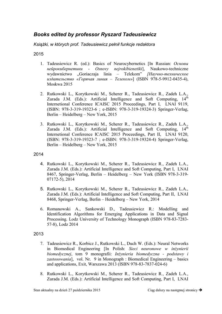 Books edited by professor Ryszard Tadeusiewicz Książki, w których prof. Tadeusiewicz pełnił funkcje redaktora 2015 1. Tadeusiewicz R. (ed.): Basics of нейрокибернетики - Osnovy wydawnictwo „Goriaczaja linia издательство «Горячая линия – Moskwa 2015 Neurocybernetics [In Russian: Основы nejrokibienetiki], Naukowo-techniczne – Telekom” [Научно-техническое Телеком»] (ISBN 978-5-9912-0435-4), 2. Rutkowski L., Korytkowski M., Scherer R., Tadeusiewicz R., Zadeh L.A., Zurada J.M. (Eds.): Artificial Intelligence and Soft Computing, 14th Internetional Conference ICAISC 2015 Proceedings, Part I, LNAI 9119, (ISBN: 978-3-319-19323-6 ; e-ISBN: 978-3-319-19324-3) Springer-Verlag, Berlin – Heidelberg – New York, 2015 3. Rutkowski L., Korytkowski M., Scherer R., Tadeusiewicz R., Zadeh L.A., Zurada J.M. (Eds.): Artificial Intelligence and Soft Computing, 14th Internetional Conference ICAISC 2015 Proceedings, Part II, LNAI 9120, (ISBN: 978-3-319-19323-7 ; e-ISBN: 978-3-319-19324-4) Springer-Verlag, Berlin – Heidelberg – New York, 2015 2014 4. Rutkowski L., Korytkowski M., Scherer R., Tadeusiewicz R., Zadeh L.A., Zurada J.M. (Eds.): Artificial Intelligence and Soft Computing, Part I, LNAI 8467, Springer-Verlag, Berlin – Heidelberg – New York (ISBN 978-3-31907172-5), 2014 5. Rutkowski L., Korytkowski M., Scherer R., Tadeusiewicz R., Zadeh L.A., Zurada J.M. (Eds.): Artificial Intelligence and Soft Computing, Part II, LNAI 8468, Springer-Verlag, Berlin – Heidelberg – New York, 2014 6. Romanowski A., Sankowski D., Tadeusiewicz R.: Modelling and Identification Algorithms for Emerging Applications in Data and Signal Processing. Lodz University of Technology Monograph (ISBN 978-83-728357-8), Lodz 2014 2013 7. Tadeusiewicz R., Korbicz J., Rutkowski L., Duch W. (Eds.): Neural Networks in Biomedical Engineering [In Polish: Sieci neuronowe w inżynierii biomedycznej, tom 9 monografii: Inżynieria biomedyczna - podstawy i zastosowania], vol. Nr. 9 in Monograph : Biomedical Engineering – basics and applications, Exit, Warszawa 2013 (ISBN 978-83-7837-024-6) 8. Rutkowski L., Korytkowski M., Scherer R., Tadeusiewicz R., Zadeh L.A., Zurada J.M. (Eds.): Artificial Intelligence and Soft Computing, Part I, LNAI Stan aktualny na dzień 27 października 2015 Ciąg dalszy na następnej stronicy 7894, Springer-Verlag, Berlin – Heidelberg – New York (ISBN 978-3-64238657-2), 2013 9. Rutkowski L., Korytkowski M., Scherer R., Tadeusiewicz R., Zadeh L.A., Zurada J.M. (Eds.): Artificial Intelligence and Soft Computing, Part II, LNAI 7895, Springer-Verlag, Berlin – Heidelberg – New York (ISBN 978-3-64238609-1), 2013 2012 10. Rutkowski L., Korytkowski M., Scherer R., Tadeusiewicz R., Zadeh L.A., Zurada J.M. (Eds.): Swarm and Evolutionary Computation. LNCS 7269, Springer-Verlag, Berlin – Heidelberg – New York (ISBN 978-3-642-293528), 2012 11. Rutkowski L., Korytkowski M., Scherer R., Tadeusiewicz R., Zadeh L.A., Zurada J.M. (Eds.): Artificial Intelligence and Soft Computing, Part I, LNAI 7267, Springer-Verlag, Berlin – Heidelberg – New York (ISBN 978-3-64229346-7), 2012 12. Rutkowski L., Korytkowski M., Scherer R., Tadeusiewicz R., Zadeh L.A., Zurada J.M. (Eds.): Artificial Intelligence and Soft Computing, Part II, LNAI 7268, Springer-Verlag, Berlin – Heidelberg – New York (ISBN 978-3-64229349-8), 2012 13. Bolc L., Tadeusiewicz R., Chmielewski L.J., Wojciechowski K. (eds.): Computer Vision and Graphics, Springer-Verlag, Berlin – Heidelberg – New York (ISBN 978-3-642-33563-1), 2012 2011 14. Tadeusiewicz R. (Ed.): Yesterday, today and tomorrow of Polish Computer Science [In Polish: Wczoraj, dziś i jutro polskiej informatyki]. Polskie Towarzystwo Informatyczne, ISBN: 978-83-922646-6-8, Warszawa 2011 15. Tadeusiewicz R., Rowiński T. (Eds.): Computer Science and Psychology in Information Society. [In Polish: Informatyka i psychologia w społeczeństwie informacyjnym]. ISBN: 978-83-7464-417-4, Wydawnictwa AGH, Krakow 2011 2010 16. Rowiński T., Tadeusiewicz R. (Eds.): Psychology and computer science. Synergy and contradictions. [In Polish: Psychologia i informatyka. Synergia i kontradykcje]. ISBN: 978-83-7072-679-9, Wydawnictwo Uniwersytetu Kardynała Stefana Wyszyńskiego, Warszawa, 2010 17. Rutkowski L., Scherer R., Tadeusiewicz R., Zadeh L.A., Zurda J.M. (Eds.): Artificial Intelligence and Soft Computing, LNAI 6114, Springer-Verlag, Berlin – Heidelberg – New York, 2010 Stan aktualny na dzień 27 października 2015 Ciąg dalszy na następnej stronicy 18. Bolc L., Tadeusiewicz R., Chmielewski L.J., Wojciechowski K. (Eds.): Computer Vision and Graphics – Part 1, LNCS 6374, Springer-Verlag, Berlin – Heidelberg – New York, 2010 19. Bolc L., Tadeusiewicz R., Chmielewski L.J., Wojciechowski K. (Eds.): Computer Vision and Graphics – Part 2, LNCS 6374, Springer-Verlag, Berlin – Heidelberg – New York, 2010 20. Tadeusiewicz R, Byrski W., Mikrut Z. (eds.): Automatics [In Polish: Automatyka]; półrocznik Akademii Górniczo-Hutniczej im. Stanisława Staszica w Krakowie 2010; ISSN 1429-3447, tom 14, zeszyt 3, vol. 1 2009 21. Tadeusiewicz R. and Augustyniak P. (eds.): Basic biomedical engineering – vol. I [In Polish: Podstawy inżynierii biomedycznej – tom I]. (ISBN 978-837464-263-7) Uczelniane Wydawnictwa Naukowo-Dydaktyczne AGH, Kraków 2009 22. Tadeusiewicz R. and Augustyniak P. (eds.): Basic biomedical engineering – vol. II [In Polish: Podstawy inżynierii biomedycznej – tom II]. (ISBN 978-837464-263-7) Uczelniane Wydawnictwa Naukowo-Dydaktyczne AGH, Kraków 2009 23. Tadeusiewicz R., Ligęza A., Mitkowski W., Szymkat M. (eds.): 7th Conference Computer Methods and Systems. ISBN 83-926420-5-4, ONT, Kraków, 2009 24. Tadeusiewicz R. (ed.): Theoretical Neurocybernetics [In Polish: Neurocybernetyka teoretyczna], ISBN 978-83-235-0479-5, Wydawnictwo Uniwersytetu Warszawskiego, Warszawa 2009 25. Jarzębski J., 