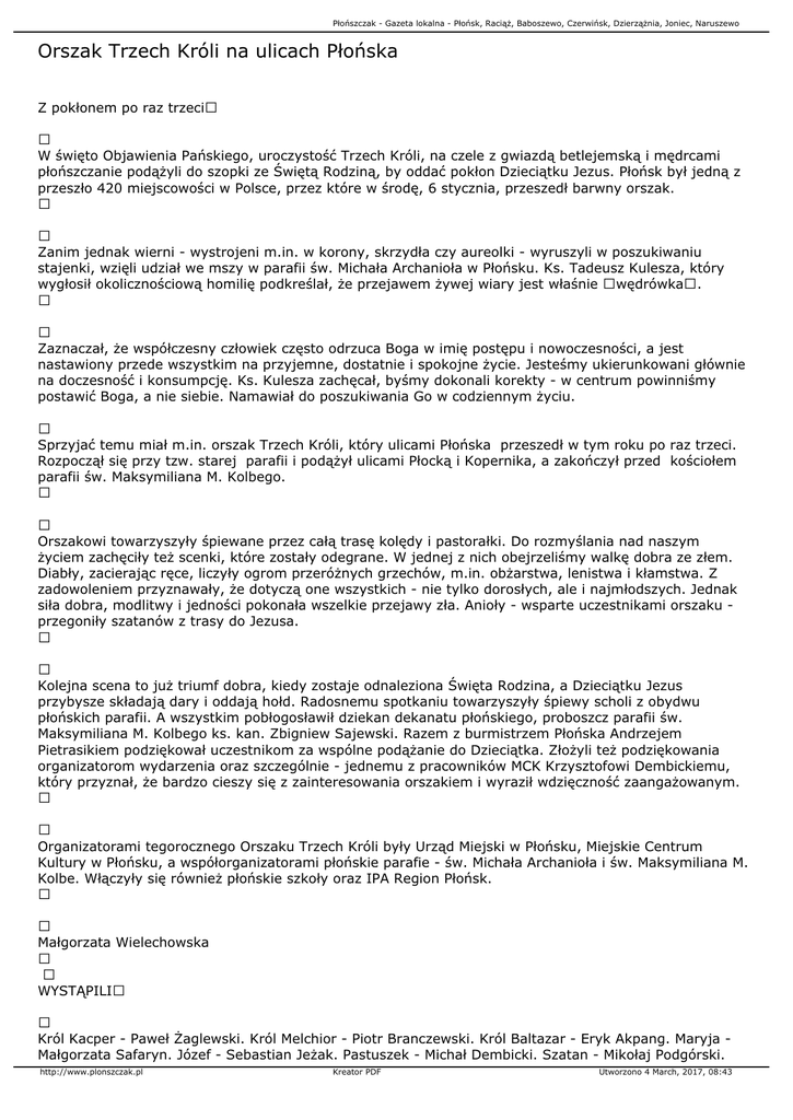 Płońszczak - Gazeta lokalna - Płońsk, Raciąż, Baboszewo, Czerwińsk, Dzierzążnia, Joniec, Naruszewo Orszak Trzech Króli na ulicach Płońska Z pokłonem po raz trzeci W święto Objawienia Pańskiego, uroczystość Trzech Króli, na czele z gwiazdą betlejemską i mędrcami płońszczanie podążyli do szopki ze Świętą Rodziną, by oddać pokłon Dzieciątku Jezus. Płońsk był jedną z przeszło 420 miejscowości w Polsce, przez które w środę, 6 stycznia, przeszedł barwny orszak. Zanim jednak wierni - wystrojeni m.in. w korony, skrzydła czy aureolki - wyruszyli w poszukiwaniu stajenki, wzięli udział we mszy w parafii św. Michała Archanioła w Płońsku. Ks. Tadeusz Kulesza, który wygłosił okolicznościową homilię podkreślał, że przejawem żywej wiary jest właśnie wędrówka. Zaznaczał, że współczesny człowiek często odrzuca Boga w imię postępu i nowoczesności, a jest nastawiony przede wszystkim na przyjemne, dostatnie i spokojne życie. Jesteśmy ukierunkowani głównie na doczesność i konsumpcję. Ks. Kulesza zachęcał, byśmy dokonali korekty - w centrum powinniśmy postawić Boga, a nie siebie. Namawiał do poszukiwania Go w codziennym życiu. Sprzyjać temu miał m.in. orszak Trzech Króli, który ulicami Płońska przeszedł w tym roku po raz trzeci. Rozpoczął się przy tzw. starej parafii i podążył ulicami Płocką i Kopernika, a zakończył przed kościołem parafii św. Maksymiliana M. Kolbego. Orszakowi towarzyszyły śpiewane przez całą trasę kolędy i pastorałki. Do rozmyślania nad naszym życiem zachęciły też scenki, które zostały odegrane. W jednej z nich obejrzeliśmy walkę dobra ze złem. Diabły, zacierając ręce, liczyły ogrom przeróżnych grzechów, m.in. obżarstwa, lenistwa i kłamstwa. Z zadowoleniem przyznawały, że dotyczą one wszystkich - nie tylko dorosłych, ale i najmłodszych. Jednak siła dobra, modlitwy i jedności pokonała wszelkie przejawy zła. Anioły - wsparte uczestnikami orszaku przegoniły szatanów z trasy do Jezusa. Kolejna scena to już triumf dobra, kiedy zostaje odnaleziona Święta Rodzina, a Dzieciątku Jezus przybysze składają dary i oddają hołd. Radosnemu spotkaniu towarzyszyły śpiewy scholi z obydwu płońskich parafii. A wszystkim pobłogosławił dziekan dekanatu płońskiego, proboszcz parafii św. Maksymiliana M. Kolbego ks. kan. Zbigniew Sajewski. Razem z burmistrzem Płońska Andrzejem Pietrasikiem podziękował uczestnikom za wspólne podążanie do Dzieciątka. Złożyli też podziękowania organizatorom wydarzenia oraz szczególnie - jednemu z pracowników MCK Krzysztofowi Dembickiemu, który przyznał, że bardzo cieszy się z zainteresowania orszakiem i wyraził wdzięczność zaangażowanym. Organizatorami tegorocznego Orszaku Trzech Króli były Urząd Miejski w Płońsku, Miejskie Centrum Kultury w Płońsku, a współorganizatorami płońskie parafie - św. Michała Archanioła i św. Maksymiliana M. Kolbe. Włączyły się również płońskie szkoły oraz IPA Region Płońsk. Małgorzata Wielechowska WYSTĄPILI Król Kacper - Paweł Żaglewski. Król Melchior - Piotr Branczewski. Król Baltazar - Eryk Akpang. Maryja Małgorzata Safaryn. Józef - Sebastian Jeżak. Pastuszek - Michał Dembicki. Szatan - Mikołaj Podgórski. http://www.plonszczak.pl Kreator PDF Utworzono 4 March, 2017, 08:43 Płońszczak - Gazeta lokalna - Płońsk, Raciąż, Baboszewo, Czerwińsk, Dzierzążnia, Joniec, Naruszewo Diabeł księgowy - Daniel Sadkowski. Diabły: Karolina Adamiec, Kacper Krysiak, Milena Laskowska. Diabeł kierowca - Dariusz Jasiński. Anioły: Eda Celik, Wojciech Iwańczyk, Aleksandra Wiśniewska. Narrator Krzysztof Dembicki. Osoba niosąca gwiazdę - Łukasz Słowik. Osoby niosące sztandar: Eliza Brzezińska, Gabriela Brzezińska, Artur Kapitan. foto: Małgorzata Wielechowska Więcej zdjęć w Galerii http://www.plonszczak.pl Kreator PDF Utworzono 4 March, 2017, 08:43