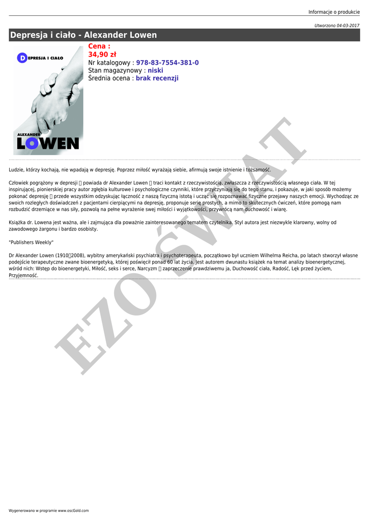 Informacje o produkcie Utworzono 04-03-2017 Depresja i ciało - Alexander Lowen Cena : 34,90 zł IA T Nr katalogowy : 978-83-7554-381-0 Stan magazynowy : niski Średnia ocena : brak recenzji Ludzie, którzy kochają, nie wpadają w depresję. Poprzez miłość wyrażają siebie, afirmują swoje istnienie i tożsamość. ŚW Człowiek pogrążony w depresji powiada dr Alexander Lowen traci kontakt z rzeczywistością, zwłaszcza z rzeczywistością własnego ciała. W tej inspirującej, pionierskiej pracy autor zgłębia kulturowe i psychologiczne czynniki, które przyczyniają się do tego stanu, i pokazuje, w jaki sposób możemy pokonać depresję przede wszystkim odzyskując łączność z naszą fizyczną istotą i ucząc się rozpoznawać fizyczne przejawy naszych emocji. Wychodząc ze swoich rozległych doświadczeń z pacjentami cierpiącymi na depresję, proponuje serię prostych, a mimo to skutecznych ćwiczeń, które pomogą nam rozbudzić drzemiące w nas siły, pozwolą na pełne wyrażenie swej miłości i wyjątkowości, przywrócą nam duchowość i wiarę. Książka dr. Lowena jest ważna, ale i zajmująca dla poważnie zainteresowanego tematem czytelnika. Styl autora jest niezwykle klarowny, wolny od zawodowego żargonu i bardzo osobisty. "Publishers Weekly" EZ O Dr Alexander Lowen (19102008), wybitny amerykański psychiatra i psychoterapeuta, początkowo był uczniem Wilhelma Reicha, po latach stworzył własne podejście terapeutyczne zwane bioenergetyką, której poświęcił ponad 60 lat życia. Jest autorem dwunastu książek na temat analizy bioenergetycznej, wśród nich: Wstęp do bioenergetyki, Miłość, seks i serce, Narcyzm zaprzeczenie prawdziwemu ja, Duchowość ciała, Radość, Lęk przed życiem, Przyjemność. Wygenerowano w programie www.oscGold.com