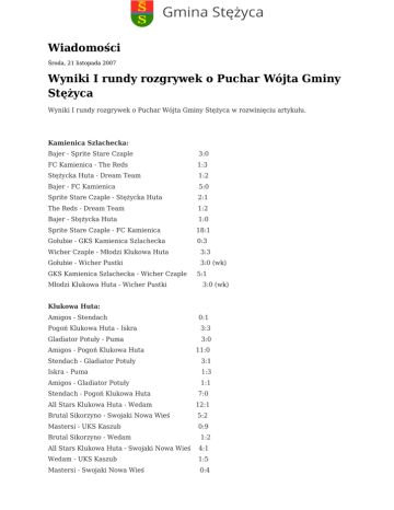 Wiadomości Środa, 21 listopada 2007 Wyniki I rundy rozgrywek o Puchar Wójta Gminy Stężyca Wyniki I rundy rozgrywek o Puchar Wójta Gminy Stężyca w rozwinięciu artykułu. Kamienica Szlachecka: Bajer - Sprite Stare Czaple 3:0 FC Kamienica - The Reds 1:3 Stężycka Huta - Dream Team 1:2 Bajer - FC Kamienica 5:0 Sprite Stare Czaple - Stężycka Huta 2:1 The Reds - Dream Team 1:2 Bajer - Stężycka Huta 1:0 Sprite Stare Czaple - FC Kamienica 18:1 Gołubie - GKS Kamienica Szlachecka 0:3 Wicher Czaple - Młodzi Klukowa Huta 3:3 Gołubie - Wicher Pustki 3:0 (wk) GKS Kamienica Szlachecka - Wicher Czaple Młodzi Klukowa Huta - Wicher Pustki 5:1 3:0 (wk) Klukowa Huta: Amigos - Stendach 0:1 Pogoń Klukowa Huta - Iskra 3:3 Gladiator Potuły - Puma 3:0 Amigos - Pogoń Klukowa Huta 11:0 Stendach - Gladiator Potuły 3:1 Iskra - Puma 1:3 Amigos - Gladiator Potuły 1:1 Stendach - Pogoń Klukowa Huta 7:0 All Stars Klukowa Huta - Wedam 12:1 Brutal Sikorzyno - Swojaki Nowa Wieś 5:2 Mastersi - UKS Kaszub 0:9 Brutal Sikorzyno - Wedam 1:2 All Stars Klukowa Huta - Swojaki Nowa Wieś 4:1 Wedam - UKS Kaszub 1:5 Mastersi - Swojaki Nowa Wieś 0:4