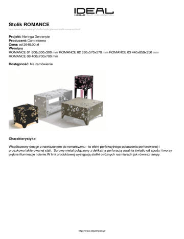 Stolik ROMANCE http://www.idealmeble.pl/pl/offer/style/glamour/stolik-romance.html/ Projekt: Neringa Dervenyte Producent: Contraforma Cena: od 2645.00 zł Wymiary ROMANCE 01 800x300x300 mm ROMANCE 02 330x570x570 mm ROMANCE 03 440x850x350 mm ROMANCE 08 400x700x700 mm Dostępność: Na zamówienie Charakterystyka: Współczesny design z nawiązaniem do romantyzmu - to efekt perfekcyjnego połączenia perforowanej i proszkowo lakierowanej stali. Surowy metal połączony z delikatną perforacją uwalnia światło od spodu i tworzy piękne illuminacje i cienie.W linii produktowej występują stoliki o różnych rozmiarach jak również lampy. http://www.idealmeble.pl Dostępne wersje produktu: nazwa produktu warianty Stolik ROMANCE 01 80 cm x 30 cm x 30 cm Stolik ROMANCE 02 33 cm x 57 cm x 57 cm Stolik ROMANCE 03 44 cm x 85 cm x 35 cm Stolik ROMANCE 08 40 cm x70 cm x70 cm cena 2522.00zł dostępne Na zamówienie 2522.00zł Na zamówienie 2875.00zł Na zamówienie 3328.00zł Na zamówienie http://www.idealmeble.pl Zdjęcia produktu: http://www.idealmeble.pl Powered by TCPDF (www.tcpdf.org)