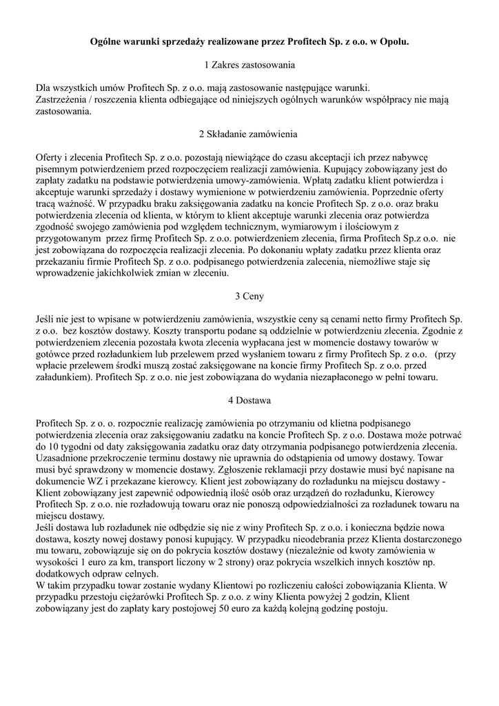 Ogólne warunki sprzedaży realizowane przez Profitech Sp. z o.o. w Opolu. 1 Zakres zastosowania Dla wszystkich umów Profitech Sp. z o.o. mają zastosowanie następujące warunki. Zastrzeżenia / roszczenia klienta odbiegające od niniejszych ogólnych warunków współpracy nie mają zastosowania. 2 Składanie zamówienia Oferty i zlecenia Profitech Sp. z o.o. pozostają niewiążące do czasu akceptacji ich przez nabywcę pisemnym potwierdzeniem przed rozpoczęciem realizacji zamówienia. Kupujący zobowiązany jest do zapłaty zadatku na podstawie potwierdzenia umowy-zamówienia. Wpłatą zadatku klient potwierdza i akceptuje warunki sprzedaży i dostawy wymienione w potwierdzeniu zamówienia. Poprzednie oferty tracą ważność. W przypadku braku zaksięgowania zadatku na koncie Profitech Sp. z o.o. oraz braku potwierdzenia zlecenia od klienta, w którym to klient akceptuje warunki zlecenia oraz potwierdza zgodność swojego zamówienia pod względem technicznym, wymiarowym i ilościowym z przygotowanym przez firmę Profitech Sp. z o.o. potwierdzeniem zlecenia, firma Profitech Sp.z o.o. nie jest zobowiązana do rozpoczęcia realizacji zlecenia. Po dokonaniu wpłaty zadatku przez klienta oraz przekazaniu firmie Profitech Sp. z o.o. podpisanego potwierdzenia zalecenia, niemożliwe staje się wprowadzenie jakichkolwiek zmian w zleceniu. 3 Ceny Jeśli nie jest to wpisane w potwierdzeniu zamówienia, wszystkie ceny są cenami netto firmy Profitech Sp. z o.o. bez kosztów dostawy. Koszty transportu podane są oddzielnie w potwierdzeniu zlecenia. Zgodnie z potwierdzeniem zlecenia pozostała kwota zlecenia wypłacana jest w momencie dostawy towarów w gotówce przed rozładunkiem lub przelewem przed wysłaniem towaru z firmy Profitech Sp. z o.o. (przy wpłacie przelewem środki muszą zostać zaksięgowane na koncie firmy Profitech Sp. z o.o. przed załadunkiem). Profitech Sp. z o.o. nie jest zobowiązana do wydania niezapłaconego w pełni towaru. 4 Dostawa Profitech Sp. z o. o. rozpocznie realizację zamówienia po otrzymaniu od klietna podpisanego potwierdzenia zlecenia oraz zaksięgowaniu zadatku na koncie Profitech Sp. z o.o. Dostawa może potrwać do 10 tygodni od daty zaksięgowania zadatku oraz daty otrzymania podpisanego potwierdzenia zlecenia. Uzasadnione przekroczenie terminu dostawy nie uprawnia do odstąpienia od umowy dostawy. Towar musi być sprawdzony w momencie dostawy. Zgłoszenie reklamacji przy dostawie musi być napisane na dokumencie WZ i przekazane kierowcy. Klient jest zobowiązany do rozładunku na miejscu dostawy Klient zobowiązany jest zapewnić odpowiednią ilość osób oraz urządzeń do rozładunku, Kierowcy Profitech Sp. z o.o. nie rozładowują towaru oraz nie ponoszą odpowiedzialności za rozładunek towaru na miejscu dostawy. Jeśli dostawa lub rozładunek nie odbędzie się nie z winy Profitech Sp. z o.o. i konieczna będzie nowa dostawa, koszty nowej dostawy ponosi kupujący. W przypadku nieodebrania przez Klienta dostarczonego mu towaru, zobowiązuje się on do pokrycia kosztów dostawy (niezależnie od kwoty zamówienia w wysokości 1 euro za km, transport liczony w 2 strony) oraz pokrycia wszelkich innych kosztów np. dodatkowych odpraw celnych. W takim przypadku towar zostanie wydany Klientowi po rozliczeniu całości zobowiązania Klienta. W przypadku przestoju ciężarówki Profitech Sp. z o.o. z winy Klienta powyżej 2 godzin, Klient zobowiązany jest do zapłaty kary postojowej 50 euro za każdą kolejną godzinę postoju. 5 Gwarancja Szczegółowe warunki gwarancji znajdują się w Kartach Gwarancyjnych Profitech Sp z o.o. Kupujący zobowiązany jest sprawdzić towar niezwłocznie przy jego dostawie w obecności kierowcy / przewoźnika i w przypadku jakichś braków lub wad natychmiast zaznaczyć to pisemnie na dokumencie WZ oraz przekazać kierowcy. Jeśli towar jest wadliwy i niezgodny z zamówieniem zlecenia, po rozpatrzeniu przez firmę Profitech Sp. z o.o. podlega naprawie. Jednoznacznie podkreśla się, że Profitech Sp. z o.o. nie ponosi żadnej odpowiedzialności za nieprawidłowy montaż konstrukcji lub uszkodzenia spowodowane jego niewłaściwy rozładunkiem jaki i niewłaściwym użytkowaniem dostarczonych elementów. Montaż okien w obiekcie jest równoznaczny z ich odbiorem. Reklamacja nie stanowi powodu do wstrzymania płatności za towar. Towar nieopłacony jest własnością Profitech Sp. z o.o. oraz nie podlega reklamacji. W przypadku niezasadnej reklamacji Profitech Sp. z o.o. ma prawo obciążyć kupującego wszelkimi powstałymi kosztami, np. dojazd, koszt pracy zaangażowanych osób, materiały itd. W przypadku zasadnych reklamacji dotyczących umów-zamówień dostarczonych poza obszar Polski, Profitech Sp. z o.o. zobowiązany jest tylko do dostarczenia materiałów zamiennych. Koszt wymiany dostarczonych materiałów zamiennych ponosi kupujący. Wszelkie uwagi dotyczące oceny ewentualnych wad surowców, z których wykonane są produkty Profitech Sp z o.o., mogą być oceniane tylko wg kryteriów oceny wyrobów producentów dostarczających te surowce. Na życzenie klienta Profitech Sp z o.o. może wykonać produkty wykraczające poza zakresy wymiarów maksymalnych i minimalnych konstrukcji okien, drzwi, rolet, bez konieczności zamieszczania dodatkowych ostrzeżeń w obrębie dokumentu zamówienia, jednakże w takim wypadku gwarancja zostaje wyłączona automatycznie a klient nie może w takim wypadku dochodzić odpowiedzialności Profitech Sp z o.o. w tym zakresie. Jeżeli klient nie znajdzie na stronie internetowej Profitech Sp z o.o. odpowiednich wytycznych dotyczących dopuszczalnych gabarytów produktów lub innych informacji takich jak np. kryteria oceny wyrobów - surowców, Profitech Sp z o.o. ma obowiązek, na pisemna prośbę klienta, przedstawić/przesłać odpowiednie informacje (jeśli takowe istnieją). Klient nie może zarzucać Profitech Sp z o.o. nieprzekazania mu wyczerpującej wiedzy na temat wszelkic
