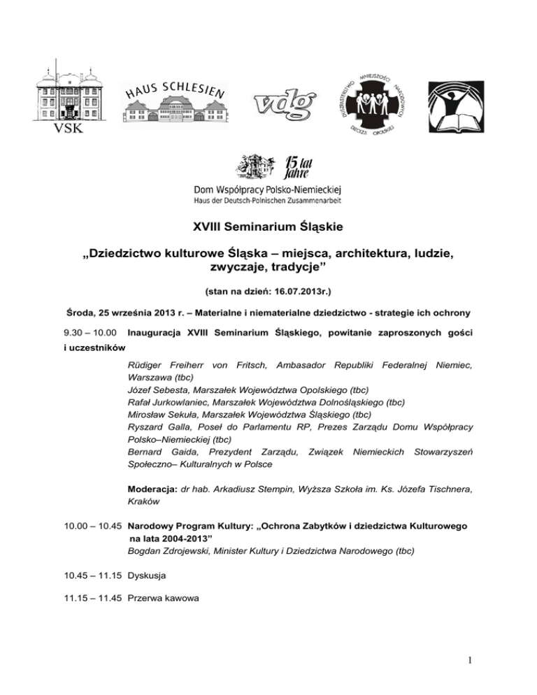 XVIII Seminarium Śląskie „Dziedzictwo kulturowe Śląska – miejsca, architektura, ludzie, zwyczaje, tradycje” (stan na dzień: 16.07.2013r.) Środa, 25 września 2013 r. – Materialne i niematerialne dziedzictwo - strategie ich ochrony 9.30 – 10.00 Inauguracja XVIII Seminarium Śląskiego, powitanie zaproszonych gości i uczestników Rüdiger Freiherr von Fritsch, Ambasador Republiki Federalnej Niemiec, Warszawa (tbc) Józef Sebesta, Marszałek Województwa Opolskiego (tbc) Rafał Jurkowlaniec, Marszałek Województwa Dolnośląskiego (tbc) Mirosław Sekuła, Marszałek Województwa Śląskiego (tbc) Ryszard Galla, Poseł do Parlamentu RP, Prezes Zarządu Domu Współpracy Polsko–Niemieckiej (tbc) Bernard Gaida, Prezydent Zarządu, Związek Niemieckich Stowarzyszeń Społeczno– Kulturalnych w Polsce Moderacja: dr hab. Arkadiusz Stempin, Wyższa Szkoła im. Ks. Józefa Tischnera, Kraków 10.00 – 10.45 Narodowy Program Kultury: „Ochrona Zabytków i dziedzictwa Kulturowego na lata 2004-2013” Bogdan Zdrojewski, Minister Kultury i Dziedzictwa Narodowego (tbc) 10.45 – 11.15 Dyskusja 11.15 – 11.45 Przerwa kawowa 1 11.45 – 12.30 Ochrona zabytków i jej znaczenie w działaniach z zakresu polityki oświatowej i kulturalnej dr hab. Janusz Krawczyk, prof. UMK, Kierownik Zakładu Konserwatorstwa Uniwersytetu Mikołaja Kopernika, Toruń 12.30 – 13.30 Założenia Konwencji UNESCO w sprawie ochrony niematerialnego dziedzictwa kulturowego i ich realizacja w Polsce i Niemczech prof. dr Sławomir Ratajski, Sekretarz Generalny Polskiego Komitetu ds. UNESCO (tbc) Benjamin Hanke, Referent, Oddział Niematerialne Dziedzictwo, Niemiecka Komisja ds. UNESCO 13.30 – 14.00 Dyskusja 14.00 – 14.30 Stosunek mieszkańców Dolnego Śląska do ochrony dziedzictwa kulturalnego regionu Barbara Nowak-Obelinda, Dolnośląski Wojewódzki Konserwator Zabytków 14.30 – 15.00 Dyskusja, podsumowanie pierwszego dnia Seminarium Śląskiego 15.00 Obiad Czas do dyspozycji uczestników 18.00 Kolacja Program wieczorny: von Donnersmarck" Prezentacja książki pt.: "Śląskie dziedzictwo rodziny Czwartek, 26 września 2013 r. Referaty wygłaszane będą równocześnie w grupie I. i II., następnie po przerwie w grupie III. i IV. Zakończeniem będzie wspólne podsumowanie pracy we wszystkich grupach. GRUPA I Śląskie archiwa, muzea oraz media 9.00 – 9.20 Krajowy Urząd Dokumentacji Fotograficznej - Górny Śląsk (Landesbildstelle Oberschlesien) w zasobie Narodowego Archiwum Cyfrowego dr Henryk Niestrój, Narodowe Archiwum Cyfrowe, Warszawa 9.20 – 9.40 Tradycyjne i informatyczne systemy korzystania z zasobu Archiwum Państwowego w Katowicach w badaniach śląskoznawczych dr hab. Piotr Greiner, Archiwum Państwowe w Katowicach 2 9.40 – 10.00 Rozproszone, digitalizowane materiały dawnego urzędu Konserwatora Prowincji Dolnośląskiej jako źródło dla powiatu brzeskiego. Maszynopis nieopublikowanej książki o zabytkach powiatu brzeskiego z serii: Die Bauund Kunstdänkmäler dr Ksenia Stanicka-Brzezicka, Uniwersytet Wrocławski, Instytut Sztuki Polskiej Akademii Nauk, Instytut Herdera w Marburgu 10.00 – 10.20 Przeszłość w rękach muzealników - konstruktywistyczna wizja dziedzictwa kulturowego Śląska Opolskiego dr Elżbieta Nieroba, Instytut Socjologii, Uniwersytet Opolski 10.20 – 10.40 Willa "Łąkowy Kamień" - dawniej rezydencja śląskiego noblisty, dziś muzeum i międzynarodowe centrum dialogu kulturowego Julita Zaprucka, Dyrektor, Muzeum Miejskie "Dom Gerharta Hauptmanna", Jelenia Góra 10.40 – 11.00 Izby regionalne, Izby Tradycji - wartość poznawcza dla dzieci i młodzieży Monika Czok, Instytut Filologii Germańskiej, Uniwersytet Wrocławski 11.00 – 11.30 Przerwa kawowa GRUPA II Ludzie, którzy zmieniali Śląsk, Ślązacy, którzy poruszyli świat 9.00 – 9.20 Joseph Wilpert i Josef Strzygowski. Naukowcy ze Śląska tworzą historię prof. dr Piotr O. Scholz, Uniwersytet Marii Curie-Skłodowskiej, Lublin 9.20 – 9.40 Działalność ks. prałata Karla Ulitzki (1873 - 1953) na rzecz dziedzictwa kulturowego Górnego Śląska ks. dr hab. Konrad Glombik, Wydział Teologiczny,Uniwersytet Opolski 9.40 – 10.00 Hans Lutsch (1854-1922) konserwator zabytków Śląska dr Barbara Ochendowska-Grzelak, Instytut Polonistyki i Kulturoznawstwa, Zakład Wiedzy o kulturze, Uniwersytet Szczeciński 10.00 – 10.20 Społeczna odpowiedzialność jako szczególne dziedzictwo Śląska. Ludzie i przedsiębiorstwa - między tradycją i nowoczesnością dr Małgorzata Suchacka, Uniwersytet Śląski, Katowice 10.20 – 10.40 Robert Bednorz jeden z najzdolniejszych niemieckich rzeźbiarzy XX wieku Johanes Golawski, Historyk, Referent ds. Kultury, Landmanschaft Schlesien 3 10.40 – 11.00 Arthur Nicolaier (1862-1942) znany na całym świecie lekarz i uczony z Koźla i starania o jego uczczenie w Kędzierzynie-Koźlu w roku jublileuszu Matthias Lempart, Uniwersytet Vechta 11.00 – 11.30 Przerwa kawowa GRUPA III Co mówią nam historyczne miejsca pamięci i pomniki na Śląsku? 11.30 – 11.50 Rozumice (Rösnitz) Polifoniczność tradycji luterańskiej dr hab. Krzysztof Gładkowski, prof. UW-M., Instytut Nauk Politycznych Uniwersytetu Warmińsko-Mazurskiego w Olsztynie 11.50 – 12.10 Ideologiczna i estetyczna funkcja pomnika w przestrzeni publicznej wybranych śląskich miast dr Elżbieta Sekuła, Instytut Badań Przestrzeni Publicznej, Warszawa 12.10 – 12.30 Architektura kolejowa na Śląsku jako dziedzictwo kulturowe regionu dr Przemysław Dominas, Wrocławska Wyższa Szkoła Informatyki Stosowanej we Wrocławiu 12.30 – 12.50 Architektura przemysłowa Śląska Opolskiego przed 1945 r. i jej współczesny stan zachowania Bogdan Jasiński, Muzeum Wsi Opolskiej 12.50 – 13.10 "Taniec śmierci” w labiryncie świata - Oskar Kokoschka i Max Berg w pracy nad projektami dla Wrocławia Magdalena Długosz, Instytut Kulturoznawstwa, Uniwersytet Marii CurieSkłodowskiej, Lublin GRUPA IV Czym jest „n