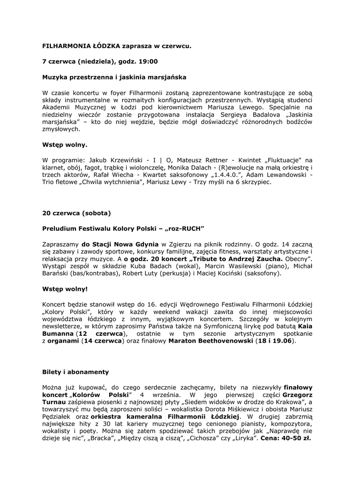 FILHARMONIA ŁÓDZKA zaprasza w czerwcu. 7 czerwca (niedziela), godz. 19:00 Muzyka przestrzenna i jaskinia marsjańska W czasie koncertu w foyer Filharmonii zostaną zaprezentowane kontrastujące ze sobą składy instrumentalne w rozmaitych konfiguracjach przestrzennych. Wystąpią studenci Akademii Muzycznej w Łodzi pod kierownictwem Mariusza Lewego. Specjalnie na niedzielny wieczór zostanie przygotowana instalacja Sergieya Badalova „Jaskinia marsjańska” – kto do niej wejdzie, będzie mógł doświadczyć różnorodnych bodźców zmysłowych. Wstęp wolny. W programie: Jakub Krzewiński - I | O, Mateusz Rettner - Kwintet „Fluktuacje" na klarnet, obój, fagot, trąbkę i wiolonczelę, Monika Dalach - (R)ewolucje na małą orkiestrę i trzech aktorów, Rafał Wiecha - Kwartet saksofonowy „1.4.4.0.”, Adam Lewandowski Trio fletowe „Chwila wytchnienia", Mariusz Lewy - Trzy myśli na 6 skrzypiec. 20 czerwca (sobota) Preludium Festiwalu Kolory Polski – „roz-RUCH” Zapraszamy do Stacji Nowa Gdynia w Zgierzu na piknik rodzinny. O godz. 14 zaczną się zabawy i zawody sportowe, konkursy familijne, zajęcia fitness, warsztaty artystyczne i relaksacja przy muzyce. A o godz. 20 koncert „Tribute to Andrzej Zaucha. Obecny”. Wystąpi zespół w składzie Kuba Badach (wokal), Marcin Wasilewski (piano), Michał Barański (bas/kontrabas), Robert Luty (perkusja) i Maciej Kociński (saksofony). Wstęp wolny! Koncert będzie stanowił wstęp do 16. edycji Wędrownego Festiwalu Filharmonii Łódzkiej „Kolory Polski”, który w każdy weekend wakacji zawita do innej miejscowości województwa łódzkiego z innym, wyjątkowym koncertem. Szczegóły w kolejnym newsletterze, w którym zaprosimy Państwa także na Symfoniczną lirykę pod batutą Kaia Bumanna (12 czerwca), ostatnie w tym sezonie artystycznym spotkanie z organami (14 czerwca) oraz finałowy Maraton Beethovenowski (18 i 19.06). Bilety i abonamenty Można już kupować, do czego serdecznie zachęcamy, bilety na niezwykły finałowy koncert „Kolorów Polski” 4 września. W jego pierwszej części Grzegorz Turnau zaśpiewa piosenki z najnowszej płyty „Siedem widoków w drodze do Krakowa”, a towarzyszyć mu będą zaproszeni soliści – wokalistka Dorota Miśkiewicz i oboista Mariusz Pędziałek oraz orkiestra kameralna Filharmonii Łódzkiej. W drugiej zabrzmią największe hity z 30 lat kariery muzycznej tego cenionego pianisty, kompozytora, wokalisty i poety. Można się zatem spodziewać takich przebojów jak „Naprawdę nie dzieje się nic”, „Bracka”, „Między ciszą a ciszą”, „Cichosza” czy „Liryka”. Cena: 40-50 zł. Warto też już teraz pomyśleć o zakupie abonamentów na Metropolitan Opera Live. W tym tygodniu uruchomiliśmy pierwszą pulę dla członków Salonu Przyjaciół FŁ. Wszystkich Melomanów zapraszamy od 8 czerwca. Abonament w pierwszej strefie na wszystkie 9 transmisji kosztuje 432 zł, zaś w drugiej 324 zł (co daje 40-procentowy rabat w stosunku do normalnej ceny biletu na pojedynczą transmisję). 3.10.2015 17.10 2015 7.11.2015 16.01.2016 30.01.2016 5.03.2016 2.04.2016 16.04.2016 30.04.2016 -Trubadur, Verdi’ego – Otello, Verdi’ego - Tannhäuser, Wagnera – Poławiacze pereł, Bizeta – Turandot, Puccini’ego – Manon Lescaut, Puccini’ego – Madame Butterfly, Puccini’ego – Roberto Devereux,Donizetti’ego - Elektra,Richarda Straussa