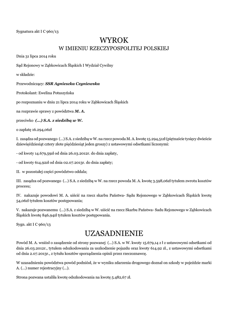 Sygnatura akt I C 960/13 WYROK W IMIENIU RZECZYPOSPOLITEJ POLSKIEJ Dnia 31 lipca 2014 roku Sąd Rejonowy w Ząbkowicach Śląskich I Wydział Cywilny w składzie: Przewodniczący: SSR Agnieszka Czyniewska Protokolant: Ewelina Potuszyńska po rozpoznaniu w dniu 21 lipca 2014 roku w Ząbkowicach Śląskich na rozprawie sprawy z powództwa M. A. przeciwko (...) S.A. z siedzibą w W. o zapłatę 16.294,06zł I. zasądza od pozwanego (...) S.A. z siedzibą w W. na rzecz powoda M. A. kwotę 15.294,51zł (piętnaście tysięcy dwieście dziewięćdziesiąt cztery złote pięćdziesiąt jeden groszy) z ustawowymi odsetkami liczonymi: - od kwoty 14.679,59zł od dnia 26.03.2012r. do dnia zapłaty, - od kwoty 614,92zł od dnia 02.07.2013r. do dnia zapłaty; II. w pozostałej części powództwo oddala; III. zasądza od pozwanego (...) S.A. z siedzibą w W. na rzecz powoda M. A. kwotę 3.598,06zł tytułem zwrotu kosztów procesu; IV. nakazuje powodowi M. A. uiścić na rzecz skarbu Państwa- Sądu Rejonowego w Ząbkowicach Śląskich kwotę 54,06zł tytułem kosztów postępowania; V. nakazuje pozwanemu (...) S.A. z siedzibą w W. uiścić na rzecz Skarbu Państwa- Sadu Rejonowego w Ząbkowicach Śląskich kwotę 846,94zł tytułem kosztów postępowania. Sygn. akt I C 960/13 UZASADNIENIE Powód M. A. wniósł o zasądzenie od strony pozwanej (...) S.A. w W. kwoty 15.679,14 z ł z ustawowymi odsetkami od dnia 26.03.2012r., tytułem odszkodowania za uszkodzenie pojazdu oraz kwoty 614,92 zł., z ustawowymi odsetkami od dnia 2.07.2013r., z tytułu kosztów sporządzenia opinii przez rzeczoznawcę. W uzasadnieniu powództwa powód podniósł, że w wyniku zdarzenia drogowego doznał on szkody w pojeździe marki A. (...) numer rejestracyjny (...). Strona pozwana ustaliła kwotę odszkodowania na kwotę 5.482,67 zł. Powód nie zgodził się z wyceną i zlecił wykonanie opinii rzeczoznawcy który ustalił wartość szkody na kwotę 21.161,81 zł. Strona pozwana (...) S.A. w W. wniósł o oddalenie powództwa W odpowiedzi na pozew podniosła, że dokonała wyliczenia szkody pojazdu powoda na kwotę 5.482,67 zł. Sąd ustalił następujący stan faktyczny: W dniu 17 lutego 2013r. doszło do kolizji pojazdu powoda marki A. (...) numer rejestracyjny (...), będącym własnością powoda z innym pojazdem, którego kierującym uznany został za sprawcę zdarzenia. W chwili zdarzenia sprawca zdarzenia miał zawartą umowę ubezpieczenia OC u strony pozwanej. ( dowód: - akta szkodowe) W wyniku zdarzenia w pojeździe powoda uszkodzeniu uległy: pokrycie zderzaka przedniego, tłumiki zderzaka boczne, uchwyt zderzaka boczny lewy, krata boczna lewa zderzaka, czujniki parkowania przednie, prawy i lewy, listwa ozdobna zderzaka przedniego, belka zderzaka przedniego z przysłonami bocznymi, spryskiwacze reflektorów przednich, krata wlotu powietrza przednia, reflektory ksenonowe prawy i lewy, lampa przeciwmgielna lewa, nadkole przednie lewe, błotnik przedni lewy, wzmocnienie czołowe, czujnik temperatury zewnętrznej, chłodnica powietrza z osłoną, obudowa wlotu powietrza chłodnicy. Koszt naprawy pojazdu powoda wyniósł 20.162,26 zł., brutto. ( dowód; - opinia biegłego J. Z. z dnia 23.03.2014r., k. 68-73 - zeznania powoda M. A. k. 54). Sąd zważył: Powód M. A. wniósł o zasądzenie od pozwanego (...) S.A. w W. kwoty 15. 679, 14 zł. ., tytułem odszkodowania za uszkodzenie pojazdu oraz kwoty 614,92 zł., z tytułu kosztów sporządzenia opinii przez rzeczoznawcę. Swoje roszczenie powód wywodził ze zdarzenia jakie miało miejsce w dniu 17 lutego 2013r. W sprawie bezspornym było, że sprawca zdarzenia posiadał umowę odpowiedzialności cywilnej posiadaczy pojazdów mechanicznej u strony pozwanej. Zgodnie z art. 822 §1 k.c. przez umowę odpowiedzialności cywilnej zakład ubezpieczeń zobowiązuje się do zapłacenia określonego w umowie odszkodowania za szkody wyrządzone osobom trzecim względem których odpowiedzialność za szkody ponosi ubezpieczający albo osoba , na rzecz której zawarta została umowa ubezpieczenia. Odpowiedzialność zakładu ubezpieczeń ma charakter akcesoryjny gdyż jej powstanie i rozmiar zależą od okoliczności uzasadniających odpowiedzialność ubezpieczonego sprawcy szkody oraz rozmiaru tej odpowiedzialności. Odpowiedzialność ta jest pochodna odpowiedzialności cywilnej sprawcy szkody. W niniejszej sprawie bezspornym była odpowiedzialność strony pozwanej, sporna pozostawała tylko kwestia wysokości odszkodowania. Jak wynika z opinii biegłego J. Z. w pojeździe powoda uszkodzeniu uległy: : pokrycie zderzaka przedniego, tłumiki zderzaka boczne, uchwyt zderzaka boczny lewy, krata boczna lewa zderzaka, czujniki parkowania przednie, prawy i lewy, listwa ozdobna zderzaka przedniego, belka zderzaka przedniego z przysłonami bocznymi, spryskiwacze reflektorów przednich, krata wlotu powietrza przednia, reflektory ksenonowe prawy i lewy, lampa przeciwmgielna lewa, nadkole przednie lewe, błotnik przedni lewy, wzmocnienie czołowe, czujnik temperatury zewnętrznej, chłodnica powietrza z osłoną, obudowa wlotu powietrza chłodnicy. Koszt naprawy pojazdu powoda wyniósł 20.162,26 zł., brutto. Na tę wiec kwotę należy szacować wartość szkody powoda. Z okoliczności sprawy wynika, że strona pozwana wypłaciła powodowi z tytułu szkody kwotę 5.482,67 zł. O tę więc kwotę należało pomniejszyć ustaloną przez sąd kwotę odszkodowania. Z tych tez powodów sąd uznał, ze powodowi należna jest kwota 15.294,51 zł. Sąd uznał opinię biegłego J. Z. sporządzoną w niniejszej sprawie za pełną jasną i nie budzącą wątpliwości co do jej rzetelności. Stanowisko Sądu jest tym bardziej uzasadnione, że również ani powód ani pozwany nie wnosili zastrzeżeń do powyższej opinii biegłego. Sąd uznał również , że powodowi należna jest kwota 614, 92 zł., tytułem kosztów opinii prywatnej. Była to bowiem jedyna możliwość wykazania przez powoda